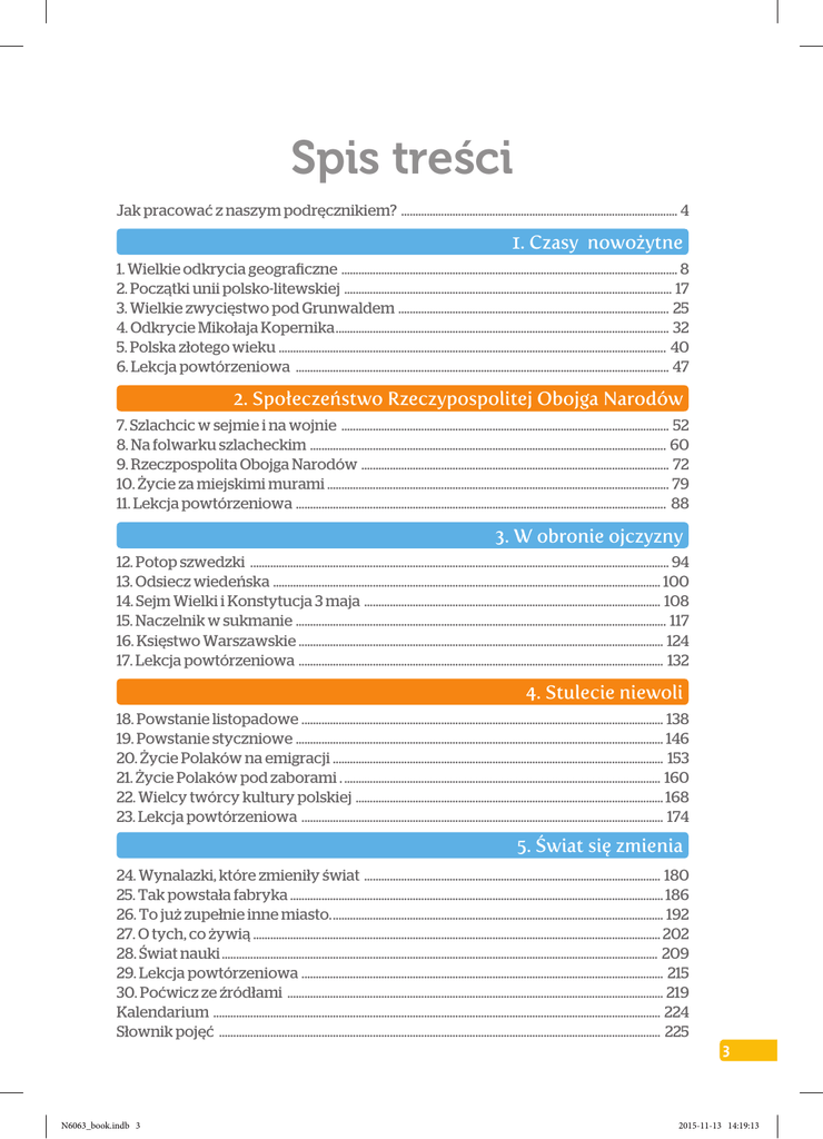 Spis treści Jak pracować z naszym podręcznikiem? .................................................................................................. 4 1. Czasy nowożytne 1. Wielkie odkrycia geograficzne ....................................................................................................................... 8 2. Początki unii polsko-litewskiej .................................................................................................................... 17 3. Wielkie zwycięstwo pod Grunwaldem ................................................................................................ 25 4. Odkrycie Mikołaja Kopernika...................................................................................................................... 32 5. Polska złotego wieku ......................................................................................................................................... 40 6. Lekcja powtórzeniowa .................................................................................................................................... 47 2. Społeczeństwo Rzeczypospolitej Obojga Narodów 7. Szlachcic w sejmie i na wojnie .................................................................................................................... 52 8. Na folwarku szlacheckim .............................................................................................................................. 60 9. Rzeczpospolita Obojga Narodów ............................................................................................................. 72 10. Życie za miejskimi murami ........................................................................................................................ 79 11. Lekcja powtórzeniowa ................................................................................................................................... 88 3. W obronie ojczyzny 12. Potop szwedzki .................................................................................................................................................... 94 13. Odsiecz wiedeńska ......................................................................................................................................... 100 14. Sejm Wielki i Konstytucja 3 maja ......................................................................................................... 108 15. Naczelnik w sukmanie ................................................................................................................................... 117 16. Księstwo Warszawskie ................................................................................................................................. 124 17. Lekcja powtórzeniowa ................................................................................................................................. 132 4. Stulecie niewoli 18. Powstanie listopadowe ................................................................................................................................ 138 19. Powstanie styczniowe .................................................................................................................................. 146 20. Życie Polaków na emigracji ..................................................................................................................... 153 21. Życie Polaków pod zaborami ................................................................................................................. 160 22. Wielcy twórcy kultury polskiej ............................................................................................................. 168 23. Lekcja powtórzeniowa ................................................................................................................................ 174 5. Świat się zmienia 24. Wynalazki, które zmieniły świat ......................................................................................................... 180 25. Tak powstała fabryka.................................................................................................................................... 186 26. To już zupełnie inne miasto...................................................................................................................... 192 27. O tych, co żywią................................................................................................................................................ 202 28. Świat nauki.......................................................................................................................................................... 209 29. Lekcja powtórzeniowa ................................................................................................................................ 215 30. Poćwicz ze źródłami ..................................................................................................................................... 219 Kalendarium .............................................................................................................................................................. 224 Słownik pojęć ............................................................................................................................................................ 225 N6063_book.indb 3 3 2015-11-13 14:19:13