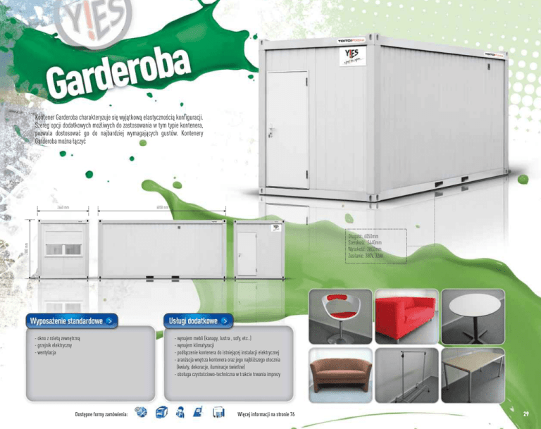 Kontener Garderoba charakteryzuje się wyjątkową elastycznością konfiguracji. Szereg opcji dodatkowych możliwych do zastosowania w tym typie kontenera, pozwala dostosować go do najbardziej wymagających gustów. Kontenery Garderoba można łączyć 2440 mm 6050 mm 2800 mm Długość: 6050mm Szerokość: 2440mm Wysokość: 2800mm Zasilanie: 380V, 32Ah - okno z roletą zewnętrzną - grzejnik elektryczny - wentylacja Dostępne formy zamówienia: - wynajem mebli (kanapy, lustra , sofy, etc..) - wynajem klimatyzacji - podłączenie kontenera do istniejącej instalacji elektrycznej - aranżacja wnętrza kontenera oraz jego najbliższego otocznia (kwiaty, dekoracje, iluminacje świetlne) - obsługa czystościowo-techniczna w trakcie trwania imprezy Więcej informacji na stronie 76 29