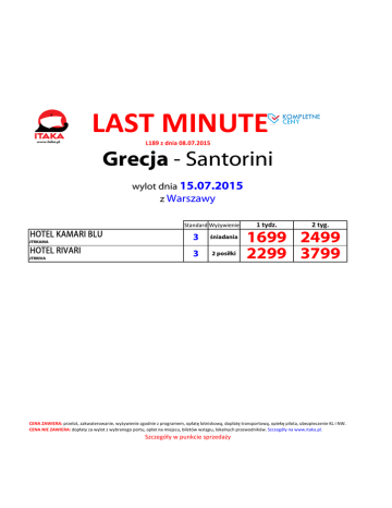 LAST MINUTE L189 z dnia 08.07.2015 Grecja - Santorini wylot dnia 15.07.2015 z Warszawy Standard Wyżywienie HOTEL KAMARI BLU JTRKAMA HOTEL RIVARI JTRRIVA 3 śniadania 3 2 posiłki 1 tydz. 2 tyg. 1699 2499 2299 3799 CENA ZAWIERA: przelot, zakwaterowanie, wyżywienie zgodnie z programem, opłatę lotniskową, dopłatę transportową, opiekę pilota, ubezpieczenie KL i NW. CENA NIE ZAWIERA: dopłaty za wylot z wybranego portu, opłat na miejscu, biletów wstępu, lokalnych przewodników. Szczegóły na www.itaka.pl. Szczegóły w punkcie sprzedaży