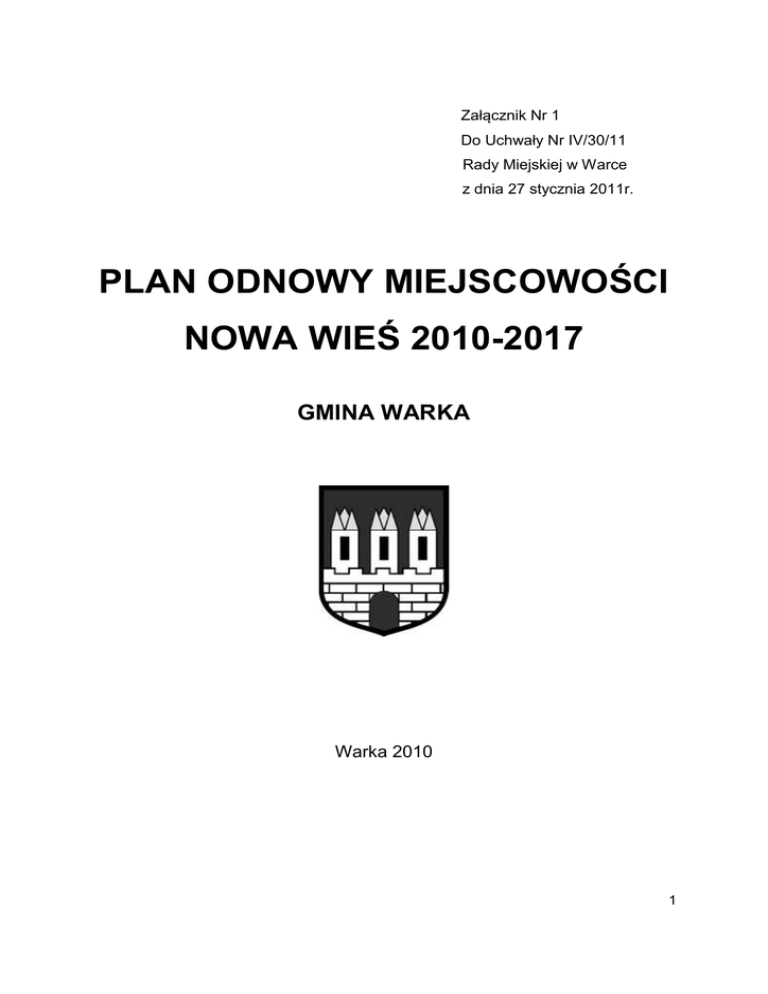 Załącznik Nr 1 Do Uchwały Nr IV/30/11 Rady Miejskiej w Warce z dnia 27 stycznia 2011r. PLAN ODNOWY MIEJSCOWOŚCI NOWA WIEŚ 2010-2017 GMINA WARKA Warka 2010 1 Plan Odnowy Miejscowości Nowa Wieś, został przygotowany przez pracowników Urzędu Miejskiego w Warce: 2 SPIS TREŚCI. 1. Wstęp………………………………………………………………………… 2. Charakterystyka miejscowości…………………………………………. 1 2 2.1. Położenie miejscowości, przynależność administracyjna, powierzchnia, liczba ludności…………………………………….. 2 2.2. Historia miejscowości……………………………………………… 2 2.3. Określenie przestrzennej struktury miejscowości………………. 3 3. Inwentaryzacja zasobów służących odnowie miejscowości…….. 4 3.1. Zasoby przyrodnicze……………………………………………… 4 3.2. Dziedzictwo kulturowe…………………………………………… 9 3.3. Obiekty i tereny…………………………………………………… 12 3.4. Infrastruktura społeczna………………………………………… 15 3.5. Infrastruktura techniczna………………………………………. 20 3.6. Gospodarka i rolnictwo…………………………………………. 36 3.7. Kapitał społeczny i ludzki………………………………………. 39 4. Analiza SWOT…………………………………………………………. 39 5. Opis i charakterystyka obszarów…………………………………. 41 6. Opis planowanych zadań inwestycyjnych i przedsięwzięć.….. 42 6.1. Opis inwestycji, przedsięwzięcia……………………………… 42 6.1.1. Nazwa, cel, przeznaczenie, harmonogram realizacji, kwota końcowa i wskazanie źródła jej pozyskania .. 42 ŹRODŁA………………………………………………………………………… 44 3 1. Wstęp Plan Odnowy Miejscowości (POM) Nowa Wieś jest dokumentem określającym strategie działań wsi w sferze społeczno – gospodarczej w perspektywie lat 20102017. Bezpośrednim powodem stworzenia POM-u Nowa Wieś jest możliwość ubiegania się o fundusze unijne na rzecz rozwoju miejscowości w oparciu o Program Rozwoju Obszarów Wiejskich (PROW) na lata 2007-2013, Oś 3 programu dotyczącą działania 4 Odnowa i rozwój wsi, gdzie Plan Odnowy Miejscowości jest dokumentem wymaganym. POM jest wynikiem oddolnej inicjatywy mieszkańców miejscowości Nowa Wieś oraz współpracy samorządowymi, Rady które Sołeckiej widziały mieszkańców potrzebę z miejscowymi perspektywicznego władzami wyznaczenia kluczowych kierunków rozwoju miejscowości. Przedkładany Plan Odnowy Miejscowości jest zgodny z dokumentami strategicznymi rozwoju kraju, województwa i powiatu, a także wpisuje się w Strategię Rozwoju Gminy Warka. Podstawą opracowania POM-u dla miejscowości Nowa Wieś jest Program Rozwoju Obszarów Wiejskich na lata 2007-2013 (w szczególności działanie Osi 3.4 Odnowa i rozwój wsi), Plan Rozwoju Lokalnego Miasta i Gminy Warka 2008-2015 oraz na kolejny okres programowania Unii Europejskiej 2007–2013, Strategia Rozwoju Gminy Warka. Niniejsze opracowanie zawiera charakterystykę miejscowości, począwszy od historii, poprzez inwentaryzację zasobów wsi, czyli analizę sfery społecznogospodarczej służącej identyfikacji problemów miejscowości, SWOT – czyli mocne i słabe strony miejscowości, planowane kierunki rozwoju, zakładane do realizacji przedsięwzięcia wraz z szacunkowymi kosztami i harmonogramem planowanych działań. W planie został przedstawiony system wdrażania, system monitorowania i oceny realizacji Planu oraz system komunikacji społecznej. POM dla miejscowości Nowa Wieś jest ekspertyzą prognostyczną - otwartą, podlegającą ciągłej weryfikacji 4 sytuacji społeczno-gospodarczej, która w zależności od potrzeb i uwarunkowań finansowych będzie mogła być poddawana aktualizacjom. Zgodnie z okresami programowania przyjętymi w Unii Europejskiej (wieloletni budżet UE 2007-2013), przyjmujemy na potrzeby Planu Odnowy Miejscowości lata 2010 – 2017. Działania inwestycyjne zapisane w Planie w tychże latach mają spowodować wzrost znaczenia i zwiększenie atrakcyjności miejscowości Nowa Wieś na tle całej gminy oraz przyczynić się do poprawy jakości i podniesienia standardu życia mieszkańców wsi, poprzez zaspokojenie potrzeb społecznych i kulturalnych oraz promowanie obszarów wiejskich. 2. Charakterystyka miejscowości 2.1. Położenie miejscowości, przynależność administracyjna, powierzchnia, liczba ludności Nowa Wieś, zlokalizowana jest w województwie mazowieckim, we wschodniej części powiatu grójeckiego. Powierzchnia wsi to obszar 386,4143 ha. Od Warki oddalona jest o osiem kilometrów w kierunku zachodnim. Według danych Urzędu Miejskiego z 31.12.2010 r. roku na terenach miejscowości Nowa Wieś zameldowanych było 400 osób. 2.2. Historia miejscowości Pierwsza znana historyczna wzmianka o Nowej Wsi pochodzi z połowy XV wieku. Miejscowość istniała już w 1469 r. Została wymieniona podczas ugody wdowy synów zmarłego wojewody Jana Boglewskiego z biskupem poznańskim Andrzejem Bnińskim w sprawie jego dziesięcin z Woli Boglewskiej, Osin, Rytomoczydła i Nowej Wsi. W 1821 roku od rodziny Borowskich m. in. Nową Wieś zakupił pan Tomasz Gąsiorowski (zachował się stary dworek szlachecki stojący tam 5 jeszcze przed tym wydarzeniem). W 1885 r. Nowa Wieś była siedzibą gminy i należała do parafii Boglewice. Dzieliła się na wieś i folwark. Miała wiatrak, zadbane gospodarstwo folwarczne i piękną oborę. 18 maja 1863 roku rozegrała się w tej miejscowości część bitwy między partyzanckim oddziałem powstańców styczniowych pod dowództwem majora Władysława Grabowskiego a oddziałem carskiego wojska rosyjskiego, którym dowodził generał Meller - Zakomelski. Bitwa zakończyła się klęsk
