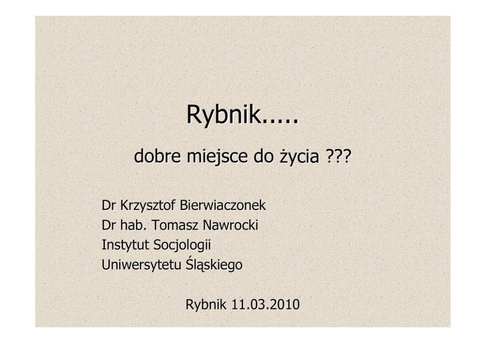 Rybnik..... dobre miejsce do życia ??? Dr Krzysztof Bierwiaczonek Dr hab. Tomasz Nawrocki Instytut Socjologii Uniwersytetu Śląskiego Rybnik 11.03.2010 Miasto dla socjologa.... Klasyka Robert Ezra Park: „Miasto jest czymś więcej niźli aglomeracją jednostek wyposażonych w dobra komunalne takie jak: ulice, nieruchomości, oświetlenie elektryczne, tramwaje, telefony itd. Miasto jest czymś więcej niźli prostą konstelacją instytucji i aparatów administracyjnych: trybunałów szpitali, szkół, posterunków policji oraz urzędów wszelkiego rodzaju. Miasto jest stanem ducha, zespołem zwyczajów i tradycji, postaw i sentymentów, nieodłącznie powiązanych z tymi zwyczajami i transmitowanych przez tradycję” Wyniki dwóch badań Centra śląskich miast Lipiec 2006 K. Bierwiaczonek T. Nawrocki - Wywiady swobodne z szkicowaniem map mentalnych - Badania w pięciu miastach (Rybnik, Katowice, Ruda Śląska, Tychy, Bytom - Rybnik – przestrzeń miasta - Wrzesień 2007 T. Nawrocki - Wywiady skategoryzowane z szkicowaniem map mentalnych Po pierwsze, rybniczanie zadowoleni z zamieszkiwania w mieście W obu badaniach 92,0% rybniczan zgadzało się lub zdecydowanie się zgadzało z tym stwierdzeniem Jestem bardzo zadowolony(a) z zamieszkiwania w Rybniku % Całkowicie się zgadzam 51,8% Zgadzam się 40,2% Trudno powiedzieć 3,5% Nie zgadzam się 2,9% Zdecydowanie nie zgadzam się 1,5% Brak odpowiedzi 0.1% Postrzeganie przestrzeni Rybnika Copyright © Tomasz Nawrocki 2007 Zadowolenie z zamieszkiwania w mieście Rybnik K-ce Bytom Tychy R.Ś. Zdecydowanie tak 57,2% 34,2% 35,4% 60,8% 50,6% Raczej tak 34,8% 49,0% 39,9% 31,2% 32,2% Trudno powiedzieć 2,9% 4,1% 3,9% 1,5% 4,2% Raczej nie 3,2% 7,7% 11,7% 2,8% 6,4% Zdecydowanie nie 1,8% 5,0% 9,2% 3,4% 5,8% Brak odpowiedzi 0,0% 0,0% 0,0% 0,0% 0,3% Postrzeganie przestrzeni Rybnika Copyright © Krzysztof Bierwiaczonek Tomasz Nawrocki 2006 Rybnik to dobre miejsce do życia… Całkowicie się zgadzam 46,9% Zgadzam się 40,1% Trudno powiedzieć 6,9% Nie zgadzam się 4,2% Zdecydowanie nie zgadzam się 1,8% Brak odpowiedzi 0.1% Postrzeganie przestrzeni Rybnika Copyright © Tomasz Nawrocki 2007 Czy Pana/i/ zdaniem w Rybniku żyje się lepiej czy gorzej niż w: Katowice Radlin Gliwice Żory Zdecydowanie lepiej 43,6% 45,1% 32,6% 36,4% Raczej lepiej 31,6% 24,9% 27,1% 27,6% 5,9% 7,8% 14,8% 17,9% 2,1% 7,2% 2,8% Tak samo Raczej gorzej 4,6% Zdecydowanie gorzej 3,2% 3,3% 3,6% 3,2% Trudno powiedzieć 11,2% 16,7% 14,5% 12,0% Brak odpowiedzi 0,0% 0,2% 0,0% Postrzeganie przestrzeni Rybnika Copyright © Tomasz Nawrocki 2007 0,2% NIESTETY …. 37,0% rybniczan nie zna żadnych wydarzeń związanych z miastem 30,0% nie podało żadnego nazwiska sławnego rybniczanina Czy rzeczywiście jest to (zadowolenie z zamieszkiwania w Rybniku) korzystne? Po drugie, warunki sprzyjające do bycia miastem kreatywnym Charles Landry Richard Florida Czynniki tworzące kreatywne miasta i wspomagające rozwój miejski (Charles Landry) Indywidualne przymioty mieszkańców Wola do działania połączona z umiejętnościami przywódczymi Zróżnicowanie społeczne i wykorzystywanie różnych talentów Kultura organizacyjna Identyfikacja lokalna Przestrzenie publiczne i udogodnienia miejskie Umiejętność tworzenia dynamicznych sieci Cechy miejsca (miasta) dla klasy kreatywnej (Richard Florida) niskie bariery wejścia, np. sprzyjające warunki dla nowych firm (przedsiębiorczości), miejsca, gdzie nowo przybyli szybko znajdują akceptację, miejsca, gdzie ludzie mogą znaleźć dla siebie możliwości rozwoju, miejsca, gdzie ludzie nie napotykają trudności w związku ze swoimi identyfikacjami (także seksualnymi), miejsca, gdzie można znaleźć grupy wsparcia własnych dążeń i działań - plug and play communities szeroki rynek pracy miasta i regiony zróżnicowane z wysoką jakością życia miasta oferujące różnorodne sposoby spędzania wolnego czasu miejsca powinny posiadać swoją specyfikę i unikatowość T X 3 Technologia; Talent;Tolerancja Technologia – funkcja innowacji i koncentracji przedsiębiorstw wysokiej technologii; Tolerancja – otwartość , różnorodność i przyjazność wobec osób wybierających różne drogi życiowe; o różnej narodowości (Bochemian Index; Gay Index;) Talent – wykształcenie (bachelor’s degree) a/ przymioty mieszkańców i identyfikacja z miastem Rybniczanie są wyjątkowo miłymi ludźmi …. % Całkowicie się zgadzam 24,5% Zgadzam się 38,4% Trudno powiedzieć 20,3% Nie zgadzam się 12,9% Zdecydowanie nie zgadzam się 3,7% Brak odpowiedzi 0,2% Postrzeganie przestrzeni Rybnika Copyright © Tomasz Nawrocki 2007 Żal opuścić Rybnik …….. % Całkowicie się zgadzam 51,5% Zgadzam się 25,8% Trudno powiedzieć 6,3% Nie zgadzam się 9,0% Zdecydowanie nie zgadzam się 7,3% Brak odpowiedzi 0,1% Postrzeganie przestrzeni Rybnika Copyright © Tomasz Nawrocki 2007 Rybnik jest dla mnie małą ojczyzną …. % Całkowicie się zgadzam 52,0% Zgadzam się 32,1% Trudno powiedzieć 7,5% Nie zgadzam się 5,0% Zdecydowanie nie zgadzam się 2,4% Brak odpowiedzi 1,0% Postrzeganie przestrzeni Rybnika Copyright © Tomasz Nawrocki 2007 b/ zaangażowanie mieszkańców Dobry klimat - małe zaangażowanie RYBNICZANIE NA DRODZE DO SPOŁECZEŃSTWA OBYWATELSKIEGO Diagnoza Społeczna: Rybnik 2008 Zaangażowanie rybniczan w działalność społeczną 64,9% mężczyzn nie należy do żadnej organizacji 85% kobiet nie należy do żadnej organizacji 14,4% należy do związków zawodowych 12,3% należy do stowarzyszeń RYBNICZANIE NA DRODZE DO SPOŁECZEŃSTWA OBYWATELSKIEGO - Diagnoza Społeczna: Rybnik 2008 Najważniejsi inicjatorzy działań na terenie dzielnicy w % Parafia i funkcjonujące w jej ramach grupy 52,6 Rada Dzielnicy 39,5 Spontanicznie tworząca się w razie potrzeby grupa osób 27,8 Stowarzyszenie mieszkańców 14,9 Inny podmiot 1,5 Trudno powiedzieć 19,0 RYBNICZANIE NA DRODZE DO SPOŁECZEŃSTWA OBYWATELSKIEGO - Diagnoza Społeczna: Rybnik 2008 