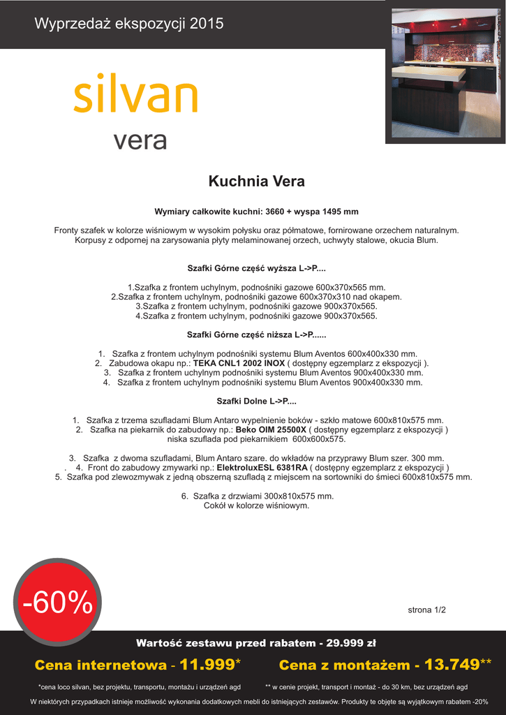 Wyprzeda¿ ekspozycji 2015 Kuchnia Vera Wymiary ca³kowite kuchni: 3660 + wyspa 1495 mm Fronty szafek w kolorze wiœniowym w wysokim po³ysku oraz pó³matowe, fornirowane orzechem naturalnym. Korpusy z odpornej na zarysowania p³yty melaminowanej orzech, uchwyty stalowe, okucia Blum. Szafki Górne czêœæ wy¿sza L->P.... 1.Szafka z frontem uchylnym, podnoœniki gazowe 600x370x565 mm. 2.Szafka z frontem uchylnym, podnoœniki gazowe 600x370x310 nad okapem. 3.Szafka z frontem uchylnym, podnoœniki gazowe 900x370x565. 4.Szafka z frontem uchylnym, podnoœniki gazowe 900x370x565. Szafki Górne czêœæ ni¿sza L->P...... 1. Szafka z frontem uchylnym podnoœniki systemu Blum Aventos 600x400x330 mm. 2. Zabudowa okapu np.: TEKA CNL1 2002 INOX ( dostêpny egzemplarz z ekspozycji ). 3. Szafka z frontem uchylnym podnoœniki systemu Blum Aventos 900x400x330 mm. 4. Szafka z frontem uchylnym podnoœniki systemu Blum Aventos 900x400x330 mm. Szafki Dolne L->P.... 1. Szafka z trzema szufladami Blum Antaro wypelnienie boków - szk³o matowe 600x810x575 mm. 2. Szafka na piekarnik do zabudowy np.: Beko OIM 25500X ( dostêpny egzemplarz z ekspozycji ) niska szuflada pod piekarnikiem 600x600x575. 3. Szafka z dwoma szufladami, Blum Antaro szare. do wk³adów na przyprawy Blum szer. 300 mm. 4. Front do zabudowy zmywarki np.: ElektroluxESL 6381RA ( dostêpny egzemplarz z ekspozycji ) 5. Szafka pod zlewozmywak z jedn¹ obszern¹ szuflad¹ z miejscem na sortowniki do œmieci 600x810x575 mm. . 6. Szafka z drzwiami 300x810x575 mm. Cokó³ w kolorze wiœniowym. -60% strona 1/2 Wartoœæ zestawu przed rabatem - 29.999 z³ Cena internetowa - 11.999* *cena loco silvan, bez projektu, transportu, monta¿u i urz¹dzeñ agd Cena z monta¿em - 13.749** ** w cenie projekt, transport i monta¿ - do 30 km, bez urz¹dzeñ agd W niektórych przypadkach istnieje mo¿liwoœæ wykonania dodatkowych mebli do istniej¹cych zestawów. Produkty te objête s¹ wyj¹tkowym rabatem -20% Wyprzeda¿ ekspozycji 2015 Kuchnia Vera Blat: Konglomerat Hanex kolor jasny be¿ 3000x600 z wyciêtymi otwormi na: p³ytê gazow¹ np.: Amica PGX 6210 ( dostêpny egzemplarz z ekspozycji ), zlewozmywak np..: System Ceram 90 Noblesse 910x510 mm i bateriê Villeroy&Boch Cassio ( dostêpny egzemplarz z ekspozycji ). Zabudowa wysoka: 1. Szafka z klap¹ podnoœniki systemu Blum Aventos 600x370x515 mm front wiœniowy lakierowany po³ysk. 2. Szafka na lodówkê do zabudowy, jedna pó³ka z mo¿liwoœci¹ regulacji wysokoœci zamontowania. Wysokoœæ maksymalna lodówki do zabudowy 1800x600x575 mm. Drzwi dzielone h=1085 mm i h=715 mm. Wyspa: Blat wykonany z konglomeratu jak w g³ównym ci¹gu, gr. 80 mm, wymiary ca³kowite 1495x750x880 mm. W dolnej czêœci trzy szafki z drzwiczkami 500x500x750 z Blum TIP-ON. Do ka¿dej kuchni istnieje mo¿liwoœæ zakupu sprzêtu agd z ekspozycji, lub z aktualnych katalogów dowolnego producenta. -60% Wartoœæ zestawu przed rabatem - 29.999 z³ Cena internetowa - 11.999* *cena loco silvan, bez projektu, transportu, monta¿u i urz¹dzeñ agd Cena z monta¿em - 13.749** ** w cenie projekt, transport i monta¿ - do 30 km, bez urz¹dzeñ agd W niektórych przypadkach istnieje mo¿liwoœæ wykonania dodatkowych mebli do istniej¹cych zestawów. Produkty te objête s¹ wyj¹tkowym rabatem -20%