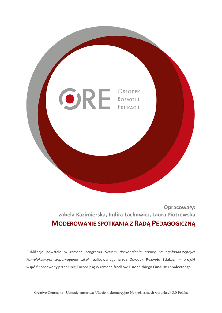 Opracowały: Izabela Kazimierska, Indira Lachowicz, Laura Piotrowska MODEROWANIE SPOTKANIA Z RADĄ PEDAGOGICZNĄ Publikacja powstała w ramach programu System doskonalenia oparty na ogólnodostępnym kompleksowym wspomaganiu szkół realizowanego przez Ośrodek Rozwoju Edukacji – projekt współfinansowany przez Unię Europejską w ramach środków Europejskiego Funduszu Społecznego Creative Commons - Uznanie autorstwa-Użycie niekomercyjne-Na tych samych warunkach 3.0 Polska I.Kazimierska, I.Lachowicz, L.Piotrowska • Moderowanie spotkania z radą … • Wśród umiejętności komunikacyjnych wykorzystywanych przez szkolnego organizatora rozwoju edukacji (SORE) istotne miejsce zajmuje umiejętność kierowania komunikacją w grupie. Umiejętność moderowania potrzebna jest SORE podczas spotkań z radą pedagogiczną, prowadzenia warsztatu rozwojowo – diagnostycznego jak i w trakcie prowadzenia przez SORE warsztatów dla nauczycieli. Moderacja spotkania wymaga od SORE umiejętności organizowania i kierowania wymianą informacji i opinii w taki sposób, aby osiągnąć założone na wstępie spotkania cele. Prowadzący spotkanie bierze na siebie odpowiedzialność zarówno za atmosferę, jaka panuje podczas dyskusji, jak i za jej konstruktywny przebieg. Moderator spotkania zwiększa szansę na pozytywny przebieg spotkania, jeśli zadba o to, aby osoby uczestniczące w dyskusji: zrozumiały cel i powody dyskusji oraz otrzymały wcześniej niezbędne informacje. To wszystko powinno odbyć się podczas rozpoczęcia dyskusji; miały możliwość swobodnego wypowiadania swoich opinii. To zależy od właściwego stymulowania rozmowy; miały okazję poznać opinię prowadzącego zebranie. Powinno to nastąpić na etapie dzielenia się własnymi opiniami; miały poczucie, że są słuchane i traktowane zgodnie z zasadami dobrego komunikowania się. Służy temu wprowadzenie i dbałość o przestrzeganie zasad komunikacyjnych; widziały, że wypowiadane przez nie opinie, propozycje rozwiązań i poszczególne tematy podlegają podsumowaniu i stanowią podstawę do formułowania wniosków. Służy temu podsumowywanie ustaleń; zostały pozytywnie potraktowane na zakończenie dyskusji. Służy temu zamykanie spotkania. 1. ROZPOCZĘCIE DYSKUSJI Rozpoczynając dyskusję warto odnieść się do głównego tematu, a jeśli to możliwe również do celu, któremu służy dyskusja. Biorąc na siebie odpowiedzialność za prowadzenie dyskusji, najlepiej sformułować cel i temat w formie propozycji dla innych uczestników spotkania. Przykłady rozpoczęcia wypowiedzi: Chciałabym, żebyśmy dzisiaj porozmawiali o tym jak postrzegacie potrzeby rozwojowe szkoły. Sądzę, że po naszej dyskusji będziemy mogli podjąć decyzję o tym, którą z tych potrzeb będziemy mogli zająć się w tym roku. Ustaliliśmy podczas spotkania z radą pedagogiczną, że kluczową kwestią jaką chcemy się zająć jest spadek frekwencji młodzieży na lekcjach. Spotkaliśmy się dziś po to, żeby określić powody, dla których to ma miejsce oraz zastanowić się nad krokami, jakie podejmiemy, aby zmienić tę sytuację. 2. STYMULOWANIE ROZMOWY Projekt jest współfinansowany przez Unię Europejską w ramach środków Europejskiego Funduszu Społecznego 2 I.Kazimierska, I.Lachowicz, L.Piotrowska • Moderowanie spotkania z radą … • Wprowadzenie tematu to początek stymulowania rozmowy, jednak zwykle nie wystarczy, żeby zacząć efektywną dyskusję. Następnym krokiem jest zaproponowanie sposobu przebiegu dyskusji. Przykład: Proponuję, żeby każdy z nas miał 5 minut na przedstawienie swojego stanowiska. Uwagi będziemy spisywać na tablicy, a następnie podejmiemy decyzję, co jest kluczowe dla rozwiązania problemu. Powiem wam, co zauważyłem , a następnie chciałbym poznać wasz punkt widzenia na ten temat. Bardziej szczegółową umiejętnością stymulowania rozmowy jest dopytywanie lub proszenie o wyrażenie opinii na dany temat. Warto w tych sytuacjach zwrócić szczególną uwagę na dwa rodzaje sytuacji: 1/ Jeśli rozmówca wyraźnie się wycofuje, pomocne może być odkrycie powodów, dla których zależy nam na jego opinii. 2/ Jeśli opinie i sugestie rozmówcy mają charakter ogólnikowy, należy prosić go o podawanie przykładów i konkretnych doświadczeń praktycznych związanych z tematem dyskusji. Podobnie postępujemy, jeśli ktoś odbiega od tematu. Przykłady: Pani pedagog, czy mogę Panią prosić o rozpoczęcie dyskusji ? Jakie jest Pani zdanie na temat....? Rozumiem, że ma pani wątpliwości, czy mamy wpływ na dyskutowany problem? Czy może Pani podać jakiś konkretny przykład, gdy taka postawa wobec ucznia przyniosła pozytywny skutek? Pani zdanie na ten temat jest dla nas bardzo ważne i trudno będzie podjąć nam decyzję, nie znając go. Dlatego proszę Panią o wyrażenie opinii na ten temat. Dodatkowym sposobem stymulowania rozmowy jest reagowanie na wypowiadane opinie innych uczestników dyskusji. Może to być reakcja pozytywna: „To bardzo inspirujący pomysł” lub reakcja uściślająca: „Jakie korzyści dzięki temu uzyskamy?” Jeśli chcemy stymulować rozmowę, unikajmy negatywnych reakcji oceniających czyli tzw: „zabójców pomysłów”: „Ten pomysł jest beznadziejny”; „Dawno nie słyszałem czegoś równie idiotycznego”; „To się nie uda”; „To już robiliśmy i nic z tego nie wyszło”. 3. DZIELENIE SIĘ własnymi opiniami Podczas dyskusji uczestnicy powinni otwarcie dzielić się swoimi opiniami. Dotyczy to również prowadzącego dyskusję moderatora. Formułując swoje zdanie, warto pamiętać o kilku zasadach: Projekt jest współfinansowany przez Unię Europejską w ramach środków Europejskiego Funduszu Społecznego 3 I.Kazimierska, I.Lachowicz, L.Piotrowska • Moderowanie spotkania z radą … • staraj się mówić jak najbardziej konkretnie i jak najbliżej tematu dyskusji – podawaj przykłady i szczegóły uzasadniając