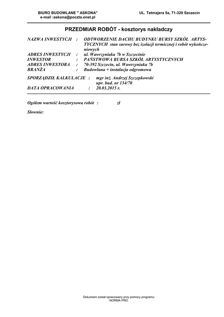 BIURO BUDOWLANE " ASKONA" e-mail :[email protected] UL. Tetmajera 5a, 71-320 Szczecin PRZEDMIAR ROBÓT - kosztorys nakładczy NAZWA INWESTYCJI : ADRES INWESTYCJI INWESTOR ADRES INWESTORA BRANśA : : : : ODTWORZENIE DACHU BUDYNKU BURSY SZKÓŁ ARTYSTYCZNYCH stan surowy bez izolacji termicznej i robót wykończeniowych ul. Wawrzyniaka 7b w Szczecinie PAŃSTWOWA BURSA SZKÓŁ ARTYSTYCZNYCH 70-392 Szczecin, ul. Wawrzyniaka 7b Budowlana + instalacja odgromowa SPORZĄDZIŁ KALKULACJE : DATA OPRACOWANIA : mgr inŜ. Andrzej Szczepkowski upr. bud. nr 134/70 20.03.2015 r. Ogółem wartość kosztorysowa robót : zł Słownie: Dokument został opracowany przy pomocy programu NORMA PRO INWESTORSKI_odtworzenie dachu bud_bursy_XI_2014 r Lp. Podstawa Opis jm Nakłady Koszt jedn. R M S Kosztorys inwestorski na odtworzenie dachu budynku bursy w stanie surowym, bez izolacji termicznej budynku i robót wykończeniowych - 5.XII.2014 r. 1 ODTWORZENIE DACHU -ROBOTY BUDOWLANE - stan surowy bez izolacji termicznej 1.1 Roboty rozbiórkowe 1 KNR-W 4- DemontaŜ wentylatorów WVPB -16 - szt. d.1.1 02 40213- do ponownego montaŜu 01 obmiar = 2.000 szt. analogia 1* 999 2* 0000000 -- R -roboty budowlane ZP - śred. III kw. 2014 r. 3.97r-g/szt. -- M -materiały pomocnicze 2%(od R) Razem z narzutami: 2 KNR-W 4- DemontaŜ konwektora WFP -5 -do d.1.1 02 40213- ponownego montaŜu 01 obmiar = 1.000 szt. analogia 1* 999 2* 0000000 -- R -roboty budowlane ZP - śred. III kw. 2014 r. 3.97r-g/szt. -- M -materiały pomocnicze 2%(od R) Razem z narzutami: 3 KNR-W 2- DemontaŜ wyłazu dachowego- wsp. d.1.1 02 1016-07 do R i S- 0,3 analogia obmiar = 1.000 szt 1* 999 2* 34000 3* 39000 -- R -roboty budowlane ZP - śred. III kw. 2014 r. 6.93*0.3=2.079r-g/szt -- S -wyciąg 0.07*0.3=0.021m-g/szt środek transportowy 0.1*0.3=0.03m-g/szt Razem z narzutami: 4 KNR 4-01 Rozebranie rynien z blachy nie nad.1.1 0535-04 dającej się do uŜytku obmiar = 96.400 m 1* 999 -- R -roboty budowlane ZP - śred. III kw. 2014 r. 0.15r-g/m Razem z narzutami: 5 KNR 4-01 Rozebranie obróbek blacharskich d.1.1 0535-08 murów ogniowych,okapów, kołnierzy,gzymsów itp.z blachy nie nadającej się do uŜytku obmiar = 126.124 m2 1* 999 -- R -roboty budowlane ZP - śred. III kw. 2014 r. 0.3r-g/m2 r-g 7.9400 % 2.0000 szt. r-g 3.9700 % 2.0000 szt r-g 2.0790 m-g 0.0210 m-g 0.0300 m r-g m2 r-g Razem z narzutami: -2- Norma PRO Wersja 4.25 14.4600 37.8372 INWESTORSKI_odtworzenie dachu bud_bursy_XI_2014 r Lp. Podstawa Opis 6 KNR 4-01 Rozbiórka pokrycia z papy na dad.1.1 0519-06 chach betonowych - pierwsza warstwa obmiar = 490.295 m2 1* 999 -- R -roboty budowlane ZP - śred. III kw. 2014 r. 0.31r-g/m2 Razem z narzutami: 7 KNR 4-01 Rozbiórka pokrycia z papy na dad.1.1 0519-07 chach betonowych - następna warstwa obmiar = 490.295 m2 1* 999 -- R -roboty budowlane ZP - śred. III kw. 2014 r. 0.05r-g/m2 Razem z narzutami: 8 KNR 4-01 Rozbiórka gładzi cementowej d.1.1 0212-01 obmiar = 24.515 m3 analogia 1* 999 -- R -roboty budowlane ZP - śred. III kw. 2014 r. 13.81r-g/m3 Razem z narzutami: 9 KNR 4-01 Rozebranie płyty wiórowo-cementod.1.1 0430-02 wej gr. 6cm analogia obmiar = 490.295 m2 1* 999 -- R -roboty budowlane ZP - śred. III kw. 2014 r. 0.18r-g/m2 Razem z narzutami: 10 KNR 4-01 Rozebranie ścianek aŜurowych z ced.1.1 0348-03 gieł o grub. 1/2 ceg. na zaprawie cementowo-wapiennej obmiar = 257.240 m2 1* 999 -- R -roboty budowlane ZP - śred. III kw. 2014 r. 0.95r-g/m2 Razem z narzutami: 11 KNR 4-01 Rozbiórka betonowych czapek komid.1.1 0212-04 nowych analogia obmiar = 9.532 m2 1* 999 -- R -roboty budowlane ZP - śred. III kw. 2014 r. 1.42r-g/m2 Razem z narzutami: 12 KNR 4-01 Rozebranie kominów do poziomu d.1.1 0350-01 konstrukcji stropu nad II piętrem obmiar = 12.110 m3 1* 999 -- R -roboty budowlane ZP - śred. III kw. 2014 r. 7.35r-g/m3 jm m2 r-g 151.9915 m2 r-g 24.5148 m3 r-g 338.5522 m2 r-g 88.2531 m2 r-g 244.3780 m2 r-g 13.5354 m3 r-g Razem z narzutami: -3- Norma PRO Wersja 4.25 Nakłady 89.0085 Koszt jedn. R M S INWESTORSKI_odtworzenie dachu bud_bursy_XI_2014 r Lp. Podstawa Opis 13 KNR 4-01 Rozebranie fragmentów gzymsu z d.1.1 0349-03 cegieł na zaprawie cementowo-wapiennej obmiar = 0.953 m3 1* 999 -- R -roboty budowlane ZP - śred. III kw. 2014 r. 10.18r-g/m3 Razem z narzutami: 14 KNR 4-01 Rozebranie ścian,filarów i kolumn z d.1.1 0349-02 cegieł na zaprawie cementowo-wapiennej obmiar = 0.632 m3 1* 999 -- R -roboty budowlane ZP - śred. III kw. 2014 r. 7.27r-g/m3 Razem z narzutami: 15 KNR 4-01 Rozebranie stropów z pustaków typu d.1.1 0351-05 DMS--fragmenty stropu nad II piętrem (korytarz i kl.schodowa) obmiar = 16.590 m2 1* 999 2* 3950001 3* 2600104 4* 2600622 5* 1341299 6* 0000000 -- R -roboty budowlane ZP - śred. III kw. 2014 r. 1.69r-g/m2 -- M -drewno okrągłe na stemple budowlane 0.007m3/m2 bale iglaste obrzynane gr. 50 mm kl.III 0.002m3/m2 deski iglaste obrzynane 28-45 mm kl.III 0.002m3/m2 klamry ciesielskie 0.25kg/m2 materiały pomocnicze 1.5%(od M) Razem z narzutami: 16 KNR 4-01 Wywiezienie gruzu spryzmowanego d.1.1 0108-11 samochodami samowyładowczymi na odl.do 1 km obmiar = 110.473 m3 1* 999 2* 39811 -- R -roboty budowlane ZP - śred. III kw. 2014 r. 0.86r-g/m3 -- S -samochód samowyładowczy 5 t 0.5m-g/m3 Razem z narzutami: 17 KNR 4-01 Wywiezienie gruzu spryzmowanego d.1.1 0108-12 samochodami samowyładowczymi za kaŜdy nast. 1 km Krotność = 14 obmiar = 110.473 m3 1* 39811 -- S -samochód samowyładowczy 5 t 0.02*14=0.28m-g/m3 jm m3 r-g 9.7015 m3 r-g 4.5946 m2 r-g 28.0371 m3 0.1161 m3 0.0332 m3 0.0332 kg 4.1475 % 1.5000 m3 r-g 95.0068 m-g 55.2365 m3 m-g Razem z narzutami: -4- Norma PRO Wersja 4.25 Nakłady 30.9324 Koszt jedn. R M S INWESTORSKI_odtworzenie dachu bud_bursy_XI_2014 r Lp. Podstawa Opis 18 Wywóz i utylizacja papy przez d.1.1 cena zauprawnione firmy kładowa obmiar = 7.354 m3 1* -- M -wywóz i utylizacja papu- cena scalona 1m3/m3 jm m3 m3 Razem z narzutami: Razem dział: Roboty rozbiórkowe Razem koszty bezpośrednie: Razem z 