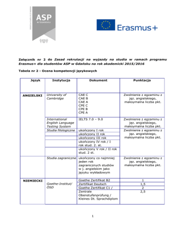 Załącznik nr 2 do Zasad rekrutacji na wyjazdy na studia w ramach programu Erasmus+ dla studentów ASP w Gdańsku na rok akademicki 2015/2016 Tabela nr 2 - Ocena kompetencji językowych Język ANGIELSKI Instytucja Dokument Punktacja University of Cambridge CAE C CAE B CAE A CPE C CPE B CPE A Zwolnienie z egzaminu z jęz. angielskiego, maksymalna liczba pkt. International English Language Testing System Studia filologiczne IELTS 7.0 – 9.0 Zwolnienie z egzaminu z jęz. angielskiego, maksymalna liczba pkt. Zwolnienie z egzaminu z jęz. angielskiego, maksymalna liczba pkt. ukończony I rok ukończony II rok ukończony III rok ukończony IV rok / I rok stud. 2. st. ukończony V rok / II rok stud. 2 st. Studia zagraniczne ukończony co najmniej jeden rok zagranicznych studiów w j. angielskim jako języku wykładowym NIEMIECKI Goethe-Institut/ ÖSD Goethe Zertifikat B2 Zertifikat Deutsch Goethe Zertifikat C1 / Zentrale Obenstufenprüfung / Kleines Dt. Sprachdiplom 1 Zwolnienie z egzaminu z jęz. angielskiego, maksymalna liczba pkt. 1 1,5 2 2,5 Großes Dt. Sprachdiplom Inne szkoły językowe (wg. standardów Common European Framework of Reference Rady Europy) 3 ukończenie kursu na poziomie A2 (poziom podstawowy) 0,5 ukończenie kursu na poziomie B1 (poziom ponadpodstawowy) 0,75 B1-B2 (B1+) C1 C2 (biegły) ukończony I rok 1 2 3 2 ukończony II rok 3 Studia filologiczne ukończony III rok ukończony IV rok / I rok stud. 2. st. ukończony V rok / II Studia zagraniczne ukończony co najmniej jeden rok zagranicznych studiów w j. niemieckim jako języku wykładowym FRANCUSKI Alliance Francaise Centre international d'études pédagogiques Inne szkoły językowe (wg. standardów Common European 3 3 3 3 CEFP2 DL (assez bien) DL (bien) DL (tres bien) DSLCF (assez bien) DSLCF (bien) DSLCF (tres bien) DHEF DELF B2 (50-65 pkt) 1 1,5 1,5 2 2,5 2,5 3 3 1 DELF B2 (66-80 pkt) DELF B2 (81-100 pkt) DALF C1 (50-65 pkt) DALF C1 (66-80 pkt) DALF C1 (81-100 pkt) DALF C2 1 2 2,5 2,5 3 3 ukończenie kursu na poziomie A2 (poziom podstawowy) 0,5 2 Framework of Reference Rady Europy) ukończenie kursu na poziomie B1 (poziom ponadpodstawowy) B1-B2 1 C1 (zaawansowany) 2 C2 (biegły) ukończony I rok ukończony II rok ukończony III rok ukończony IV rok / I rok stud. 2. st. ukończony V rok / II rok stud. 2 st. Studia zagraniczne ukończony co najmniej jeden rok zagranicznych studiów w j. francuskim jako języku wykładowym 3 2 3 3 3 Instituto Cervantes Diploma de Espanol Nivel Inicial 86100% 1 Studia filologiczne HISZAŃSKI 0,75 Inne szkoły językowe (wg. standardów Common European Framework of Reference Rady Europy) Studia filologiczne 3 3 Diploma de Espanol Nivel Intermedio 7085% Diploma de Espanol Nivel Intermedio 86100% 1,5 El Diploma de Espanol Nivel Superior 70-85% 2,5 El Diploma de Espanol Nivel Superior 86100% 3 ukończenie kursu na poziomie A2 (poziom podstawowy) ukończenie kursu na poziomie B1 (poziom ponadpodstawowy) 2 0,5 0,75 B1-B2 1 C1 (zaawansowany) C2 (biegły) ukończony I rok ukończony II rok 2 3 2 3 3 ukończony IV rok / I rok stud. 2. st. ukończony V rok / II rok stud. 2 st. Studia zagraniczne ukończony co najmniej jeden rok zagranicznych studiów w j. hiszpańskim jako języku wykładowym WŁOSKI Accademia Italiana DILI-B1 ocena C di Lingua (AIL) DILI-B1 ocena B DILI-B2 ocena A DALI-B2 ocena D DALI-C1 ocena C DALI-C1 ocena B DALI-C1 ocena A Inne szkoły ukończenie kursu na językowe poziomie A2 (wg. standardów (poziom podstawowy) Common ukończenie kursu na European poziomie B1 Framework of (poziom Reference Rady B1-B2 Europy) C1 (zaawansowany) C2 (biegły) Studia filologiczne ukończony I rok ukończony II rok ukończony III rok ukończony IV rok / I rok stud. 2. st. ukończony V rok / II rok stud. 2 st. Studia zagraniczne ukończony co najmniej jeden rok zagranicznych studiów w j. włoskim jako języku wykładowym Inny język jako język dodatkowy Inne szkoły językowe (wg. standardów Common Certfikat językowy B1 Certyfikat językowy B2 Certyfikat językowy C1 Certyfikat językowy C2 ukończenie kursu na poziomie A2 (poziom podstawowy) 4 3 3 3 1 1,5 2 2 2 2,5 3 0,5 0,75 1 2 3 2 3 3 3 3 3 1 2 2,5 3 0,5 European Framework of Reference Rady Europy) ukończenie kursu na poziomie B1 (poziom ponadpodstawowy) B1-B2 C1 (zaawansowany) C2 (biegły) Studia filologiczne ukończony I rok ukończony II rok ukończony III rok ukończony IV rok / I rok stud. 2. st. ukończony V rok / II rok stud. 2 st. Studia zagraniczne ukończony co najmniej jeden rok zagranicznych studiów w danym języku jako języku wykładowym 0,75 1 2 3 2 3 3 3 3 3 Uwaga: Punkty w ramach tego samego języka nie sumują się! Punktacja przyznawana jest za najwyżej punktowany z posiadanych dokumentów. Poza językiem angielskim można otrzymać punkty tylko za jeden dodatkowy język – język wykładowy miejsca wyjazdu. W przypadku szkół językowych kandydat powinien dostarczyć zaświadczenie, że poziom ukończonego kursu odpowiada klasyfikacji Rady Europy (Common European Framework of Reference for Languages), chyba że wynika to jednoznacznie ze złożonego świadectwa ukończenia kursu. Zatwierdził prof. Krzysztof Gliszczyński prorektor ds. rozwoju i współpracy dnia 30.01.2015 5
