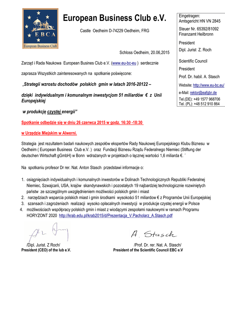 European Business Club e.V. Eingetragen: Amtsgericht HN VN 2845 Castle Oedheim D-74229 Oedheim, FRG Steuer Nr. 65392/81092 Finanzamt Heilbronn President Schloss Oedheim, 20.06,2015 Zarząd i Rada Naukowa European Busines Club e.V. (www.eu-bc-eu ( ) serdecznie Dipl. Jurist Z. Roch Scientific Council President zaprasza Wszystkich zainteresowanych na spotkanie poświęcone: Prof. Dr. habil. A. Stasch „Strategii Strategii wzrostu dochodów polskich gmin w latach 2016-20122 2016 – dzięki indywidualnym i komunalnym inwestycjom 51 miliardów € z Unii Europejskiej Website: http://www.eu-bc.eu/ e-Mail: [email protected] Tel.(DE): +49 1577 968706 Tel. (PL): +48 512 910 864 w produkcję czystej energii” Spotkanie anie odbędzie się w dniu 26 czerwca 2015 w godz. 16:30 -18:30 w Urzędzie Miejskim w Alwerni. Strategia jest rezultatem badań naukowych zespołów ekspertów Rady Naukowej Europejskiego Klubu Biznesu w Oedheim ( European Business Club e.V. ) oraz Fundacji Biznesu Rządu Federalnego Niemiec (Stiftung der deutschen Wirtschaftt gGmbH) w Bonn wdraŜanych w projektach o łącznej wartości 1,6 miliarda €. ´ Na spotkaniu profesor Dr rer. Nat. Anton Stasch przedstawi informacje o: 1. osiągnięciach indywidualnych i komunalnych inwestorów w Dolinach Technologicznych Republiki Federalnej Federalne Niemiec, Szwajcarii, USA, krajów skandynawskich i pozostałych 19 najbardziej technologicznie rozwiniętych państw ze szczególnym uwzględnieniem moŜliwości polskich gmin i miast 2. narzędziach wsparcia polskich miast i gmin środkami wysokości 51 miliardow € z Programów Unii Europejskiej 3. szansach i zagroŜeniach realizacji wysoko opłacalnych inwestycji w produkcje czystej energii w Polsce 4. moŜliwościach współpracy polskich gmin i miast z wiodącymi zespołami naukowymi w ramach Programu HORYZONT 2020 http://krab.edu.pl/krab2015/d/Prezentacja_V.Pacholarz_A.Stasch.pdf /Dipl. Jurist. Z Roch/ President (CEO) of the lub e.V. /Prof. Dr. rer. Nat. A. Stasch/ President of the Scientific Council EBC e.V