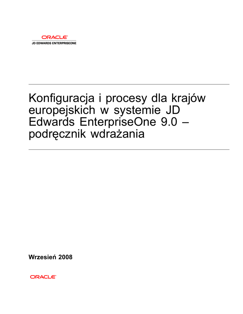 Konfiguracja i procesy dla krajów europejskich w systemie JD Edwards EnterpriseOne 9.0 – podręcznik wdrażania Wrzesień 2008 Konfiguracja i procesy dla krajów europejskich w systemie JD Edwards EnterpriseOne 9.0 – podręcznik wdrażania SKU E19AEL-B 0908POL Copyright © 2003, 2008, Oracle i/lub jej spółki powiązane. Wszelkie prawa zastrzeżone. Informacje o znakach towarowych Oracle jest zastrzeżonym znakiem towarowym Oracle Corporation i/lub jej spółek powiązanych. Inne nazwy mogą być nazwami towarowymi odpowiednich właścicieli. Ograniczenia licencyjne oraz oświadczenie dotyczące gwarancji i odpowiedzialności za straty wtórne Oprogramowanie i związana z nim dokumentacja dostarczane są w ramach umowy licencyjnej zawierającej ograniczenia w zakresie ich używania i ujawniania, a także chronione przez prawa do własności intelektualnej. O ile nie jest to jednoznacznie dozwolone w umowie licencyjnej lub dozwolone prawem, użytkownikowi nie przysługuje prawo do użytkowania, kopiowania, reprodukowania, przekładu, nadawania, modyfikowania, licencjonowania, przesyłania, dystrybuowania, prezentowania, odtwarzania, publikowania ani wystawiania jakiejkolwiek części, w jakiejkolwiek postaci, przy użyciu jakichkolwiek środków. Odtwarzanie (ang. reverse engineering), dezasemblacja (ang. disassembly) oraz dekompilacja (ang. decompilation) oprogramowania są zabronione, z wyjątkiem takiego zakresu, który jest dozwolony przez prawo do zapewnienia współpracy. Produkt podlega ochronie co najmniej jednym z następujących patentów USA: 5,781,908; 5,828,376; 5,950,010; 5,960,204; 5,987,497; 5,995,972; 5,987,497 i 6,223,345. Zgłoszono inne patenty. Oświadczenie dotyczące gwarancji Informacje zawarte w niniejszym dokumencie mogą ulec zmianie bez uprzedzenia. Nie gwarantuje się, że nie zawierają błędów. W wypadku znalezienia jakichkolwiek błędów, prosimy o pisemny kontakt. Oświadczenie dotyczące ograniczenia praw Jeśli oprogramowanie lub związana z nim dokumentacja są dostarczane Rządowi USA lub komukolwiek, kto uzyskuje licencję w imieniu Rządu USA, to ma zastosowanie następujące oświadczenie: U.S. GOVERNMENT RIGHTS Programs, software, databases, and related documentation and technical data delivered to U.S. Government customers are “commercial computer software” or “commercial technical data” pursuant to the applicable Federal Acquisition Regulation and agency-specific supplemental regulations. As such, the use, duplication, disclosure, modification, and adaptation shall be subject to the restrictions and license terms set forth in the applicable Government contract, and, to the extent applicable by the terms of the Government contract, the additional rights set forth in FAR 52.227-19, Commercial Computer Software License (December 2007). Oracle USA, Inc., 500 Oracle Parkway, Redwood City, CA 94065. Oświadczenie dotyczące niebezpiecznych zastosowań Niniejsze oprogramowanie jest tworzone w celu ogólnego zastosowania w różnorodnych programach służących do zarządzania danymi. Nie jest ono tworzone ani przeznaczone do użytku w programach z natury niebezpiecznych, w tym w programach mogących stwarzać ryzyko spowodowania obrażeń. Jeżeli ktokolwiek używa niniejszego oprogramowania w takich celach, to jest odpowiedzialny za właściwe zabezpieczenie danych, sporządzanie kopii zapasowych oraz wszystkie działania zapewniające bezpieczeństwo takich programów. Oracle i/lub jej spółki powiązane nie ponoszą odpowiedzialności za ewentualne szkody wynikające z zastosowania niniejszego oprogramowania do niebezpiecznych celów. Oświadczenie dotyczące treści, produktów i usług innych firm Niniejsze oprogramowanie i związana z nim dokumentacja mogą umożliwiać dostęp lub zawierać informacje na temat treści, produktów i usług będących własnością innych firm. Oracle Corporation i/lub jej spółki powiązane nie ponoszą odpowiedzialności za te informacje i wyraźnie zrzekają się jakichkolwiek gwarancji dotyczących treści, produktów lub usług będących własnością innych firm. Oracle Corporation i/lub jej spółki powiązane nie odpowiadają za żadne straty lub szkody, jakie może ponieść licencjobiorca w wyniku posiadania dostępu lub korzystania z treści, produktów lub usług innych firm. Produkt zawiera bibliotekę GNU libgmp. Copyright © 1991 Free Software Foundation, Inc. Biblioteka ta stanowi wolne oprogramowanie, które można modyfikować i redystrybuować zgodnie z postanowieniami licencji publicznej GNU. Produkt zawiera bibliotekę Adobe® PDF, Copyright 1993-2001 Adobe Systems, Inc. oraz interfejs DL, Copyright 1999-2008 Datalogics Inc. Wszelkie prawa zastrzeżone. Adobe® jest znakiem towarowym Adobe Systems Incorporated. Oprogramowanie częściowo zawiera informacje będące własnością Microsoft Corporation. Copyright 1985-1999 Microsoft Corporation. Oprogramowanie częściowo zawiera informacje będące własnością Tenberry Software, Inc. Copyright 1992-1995 Tenberry Software, Inc. Oprogramowanie częściowo zawiera informacje będące własnością Premia Corporation. Copyright 1993 Premia Corporation. Produkt zawiera kod na licencji RSA Data Security. Wszelkie prawa zastrzeżone. Produkt zawiera oprogramowanie opracowane w ramach projektu OpenSSL do wykorzystania w ramach zestawu narzędzi OpenSSl Toolkit (http://www.openssl.org/). Produkt zawiera oprogramowanie kryptograficzne, którego autorem jest Eric Young ([email protected]). Produkt zawiera oprogramowanie, którego autorem jest Tim Hudson ([email protected]). Wszelkie prawa zastrzeżone. Produkt zawiera mechanizm sprawdzania pisowni Sentry, Copyright 1993 Wintertree Software Inc. Wszelkie prawa zastrzeżone. Informacje dotyczące oprogramowania typu open source Firma Oracle nie ponosi odpowiedzialności za wykorzystanie ani dystrybucję oprogramowania ani dokumentacji typu open source lub shareware i wyłącza odpowiedz