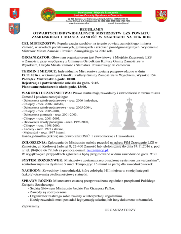 REGULAMIN OTWARTYCH INDYWIDUALNYCH MISTRZOSTW LZS POWIATU ZAMOJSKIEGO I MIASTA ZAMOŚĆ W SZACHACH NA 2016 ROK CEL MISTRZOSTW: Popularyzacja szachów na terenie powiatu zamojskiego i miasta Zamość, w szkołach podstawowych, gimnazjach i szkołach ponadgimnazjalnych. Wyłonienie Mistrzów Miasta Zamość i Powiatu Zamojskiego na 2016 rok. ORGANIZATOR: Głównym organizatorem jest Powiatowe i Miejskie Zrzeszenie LZS w Zamościu przy współpracy z Gminnym Ośrodkiem Kultury Gminy Zamość z/s w Wysokiem, Urzędu Miasta Zamość i Starostwa Powiatowego w Zamościu. TERMIN I MIEJSCE: Indywidualne Mistrzostwa zostaną przeprowadzone w dniu 19.11.2016 r. w Gminnym Ośrodku Kultury Gminy Zamość z/s w Wysokiem, Wysokie 154. Początek Mistrzostw o godz. 10:00. Rejestracja i potwierdzenie udziału do godz. 9:45. Planowane zakończenie około godz. 13:00. WARUNKI UCZESTNICTWA: Prawo startu mają zawodnicy i zawodniczki z terenu miasta Zamość i powiatu zamojskiego: - Dziewczęta szkoły podstawowe - rocz. 2006 i młodsze, - Chłopcy - rocz. 2006 i młodsi, - Dziewczęta szkoły podstawowe - rocz. 2005-2004, - Chłopcy - rocz. 2005-2004, - Dziewczęta gimnazja - rocz. 2001-2003, - Chłopcy - rocz. 2001-2003, - Dziewczęta szkoły ponadgim. - rocz. 1998-2000, - Chłopcy - rocz. 1998-2000, - Kobiety - rocz. 1997 i starsze, - Mężczyźni - rocz. 1997 i starsi. Każda jednostka (szkoła) ma prawo ZGŁOSIĆ 1 zawodniczkę i 1 zawodnika. ZGŁOSZENIA: Zgłoszenia do Mistrzostw należy przesłać na adres: PiM Zrzeszenie LZS w Zamościu, ul. Królowej Jadwigi 8; 22-400 Zamość lub telefonicznie do dnia 14.11.2016 r. pod nr tel. (84)638 66 79, lub za pomocą e-mail: [email protected]. W wyjątkowych przypadkach zgłoszenia będą przyjmowane w dniu zawodów do godz. 9:30. SYSTEM ROZGRYWEK: Mistrzostwa zostaną przeprowadzone systemem „szwajcarskim”, kontrolowanym na dystansie 5 rund. Tempo gry: 15 minut na partię dla zawodników/czek. NAGRODY: Zawodnicy i zawodniczki, które zdobędą I-III miejsca w swojej kategorii (szkoły) otrzymają okolicznościowe statuetki. SPRAWY RÓŻNE: Mistrzostwa zostaną przeprowadzone zgodnie z przepisami Polskiego Związku Szachowego. - Sędzią Głównym Mistrzostw będzie Pan Grzegorz Pańko. - Zawody są ubezpieczone. - Organizator zastrzega sobie zmiany w interpretacji regulaminu. - Każdy zawodnik musi posiadać legitymację szkolną lub inny dokument tożsamości. Zapraszamy. ORGANIZATORZY