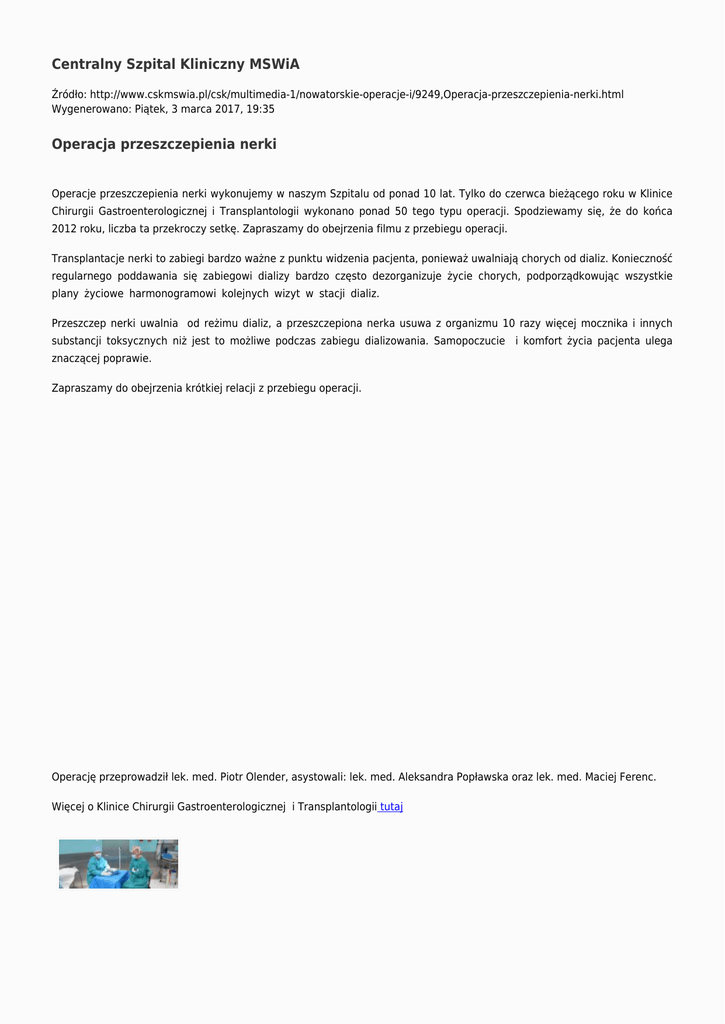 Centralny Szpital Kliniczny MSWiA Źródło: http://www.cskmswia.pl/csk/multimedia-1/nowatorskie-operacje-i/9249,Operacja-przeszczepienia-nerki.html Wygenerowano: Piątek, 3 marca 2017, 19:35 Operacja przeszczepienia nerki Operacje przeszczepienia nerki wykonujemy w naszym Szpitalu od ponad 10 lat. Tylko do czerwca bieżącego roku w Klinice Chirurgii Gastroenterologicznej i Transplantologii wykonano ponad 50 tego typu operacji. Spodziewamy się, że do końca 2012 roku, liczba ta przekroczy setkę. Zapraszamy do obejrzenia filmu z przebiegu operacji. Transplantacje nerki to zabiegi bardzo ważne z punktu widzenia pacjenta, ponieważ uwalniają chorych od dializ. Konieczność regularnego poddawania się zabiegowi dializy bardzo często dezorganizuje życie chorych, podporządkowując wszystkie plany życiowe harmonogramowi kolejnych wizyt w stacji dializ. Przeszczep nerki uwalnia od reżimu dializ, a przeszczepiona nerka usuwa z organizmu 10 razy więcej mocznika i innych substancji toksycznych niż jest to możliwe podczas zabiegu dializowania. Samopoczucie i komfort życia pacjenta ulega znaczącej poprawie. Zapraszamy do obejrzenia krótkiej relacji z przebiegu operacji. Operację przeprowadził lek. med. Piotr Olender, asystowali: lek. med. Aleksandra Popławska oraz lek. med. Maciej Ferenc. Więcej o Klinice Chirurgii Gastroenterologicznej i Transplantologii tutaj Drukuj Generuj PDF Powiadom znajomego Wstecz