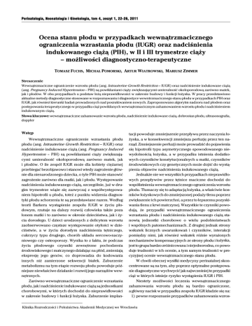 Perinatologia, Neonatologia i Ginekologia, tom 4, zeszyt 1, 22-26, 2011 Ocena stanu płodu w przypadkach wewnątrzmacicznego ograniczenia wzrastania płodu (IUGR) oraz nadciśnienia indukowanego ciążą (PIH), w II i III trymestrze ciąży – możliwości diagnostyczno-terapeutyczne TOMASZ FUCHS, MICHAŁ POMORSKI, ARTUR WIATROWSKI, MARIUSZ ZIMMER Streszczenie Wewnątrzmaciczne ograniczenie wzrostu płodu (ang. Intrauterine Growth Restriction – IUGR) oraz nadciśnienie indukowane ciążą (ang. Pregnancy Induced Hypertension – PIH) są powikłaniami ciąży zwiększającymi umieralność okołoporodową zarówno matek, jak i płodów. W obu przypadkach u podstaw leżą nieprawidłowości w zakresie budowy i funkcji łożyska. W pracy przedstawiono aktualne metody diagnostyczne stosowane w rozpoznawaniu i diagnostyce wewntrzmacicznego stanu płodu w przypadkach PIH oraz IUGR, jak również kierunki badań prowadzonych nad poszukiwaniem nowych. Zaproponowano algorytm nadzoru nad płodem oraz postępowania terapeutycznego w przypadku ciąż powikłanych wewnątrzmacicznym zahamowaniem wzrostu płodu i nadciśnieniem indukowanym ciążą. Słowa kluczowe: wewnątrzmaciczne zahamowanie wzrostu płodu, nadciśnienie indukowane ciażą, dobrostan płodu, ultrasonografia, doppler Wstęp Wewnątrzmaciczne ograniczenie wzrastania płodu płodu (ang. Intrauterine Growth Restriction – IUGR) oraz nadciśnienie indukowane ciążą (ang. Pregnancy Induced Hypertension – PIH) są powikłaniami ciąży zwiększającymi umieralność okołoporodową zarówno matek, jak i płodów. O ile zespół IUGR może dla kobiety ciężarnej przebiegać bezobjawowo i stanowi wtedy zagrożenie głównie dla nienarodzonego dziecka, o tyle PIH może stanowić zagrożenie zarówno dla matki, jak i płodu. Występowanie nadciśnienia indukowanego ciążą, szczególnie, już w drugim trymestrze wiąże się zazwyczaj z współwystępowaniem hipotrofii u płodu, toteż z punktu widzenia diagnostyki płodu schorzenia te są przedstawiane razem. Według teorii Barkera wystąpienie zespołu IUGR w życiu płodowym, rzutuje na dalszy rozwój człowieka także poza łonem matki i to zarówno w okresie dzieciństwa, jak i życia dorosłego. U dzieci urodzonych z deficytem wzrostu zaobserwowano częstsze występowanie otyłości w dzieciństwie, a w życiu dorosłym nadciśnienia tętniczego, cukrzycy typu drugiego, chorób układu sercowo-naczyniowego czy osteoporozy. Wynika to z faktu, że podczas życia płodowego czynniki zewnętrzne pochodzenia środowiskowego i matczynego działając na płód, zmieniają ekspresję jego genów, co doprowadza do kodowania innych niż zamierzone sekwencji białek. Zaburzenie metabolizmu na tym etapie rozwoju płodu powoduje późniejsze niewłaściwe działanie i rozwój jego narządów wewnętrznych. Zarówno wewnątrzmaciczne ograniczenie wzrastania płodu, jak i nadciśnienie indukowane ciążą są jednostkami chorobowymi, w których dochodzi do nieprawidłowości w zakresie budowy i funkcji łożyska. Zaburzenie implan- tacji powoduje zmniejszenie przepływu przez naczynia łożyska, a w konsekwencji zmniejsza perfuzję przez ten narząd. Zmniejszenie perfuzji może prowadzić do pojawienia się hipotrofii typu asymetrycznego spowodowanego niewydolnością łożyska, a w przypadku istnienia dodatkowych czynników konstytucjonalnych u matki, czynników środowiskowych czy genetycznych może dojść do wystąpienia objawów nadciśnienia indukowanego ciążą. Jednakże nie we wszystkich przypadkach nieprawidłowych przepływów przez tętnice maciczne dochodzi do współistnienia wewnątrzmacicznego ograniczenia wzrostu płodu. Tłumaczy się to adaptacją łożyska, a właściwie kosmków łożyskowych do zmniejszonej podaży tlenu poprzez zwiększenie ich powierzchni, a przez to lepszemu pozyskiwania tlenu z krwi matczynej. Wszystkie te czynniki powodują, że przypadki wewnątrzmacicznego ograniczenia wzrastania płodu i nadciśnienia indukowanego ciążą stanowią jednostki chorobowe o wielu podobieństwach i wspólnych patomechanizmach. Z drugiej jednak strony wskutek licznych uwarunkowań i czynników, interakcji pomiędzy nimi, jak również wskutek różnie wyrażonych mechanizmów kompensacyjnych ze strony płodu i łożyska, jest to grupa bardzo zróżnicowana i niejednorodna, co powoduje trudności w ich ocenie, a tym samym trudności w precyzyjnej ocenie wewnątrzmacicznego stanu płodu. W chwili obecnej wysiłki medycyny perinatalnej skoncentrowane są na tym, aby poprzez optymalne postępowanie diagnostyczne wychwycić jak najwcześniej te przypadki ciąż w których istnieje ryzyko wystąpienia IUGR i PIH. Niestety możliwości leczenia wewnątrzmacicznego zahamowania wzrostu płodu są bardzo ograniczone, a główny nacisk w przypadku zespołu IUGR kładzie się na: 1) pewne rozpoznanie przypadków zahamowania wzros- Klinika Rozrodczości i Położnictwa Akademii Medycznej we Wrocławiu Ocena stanu płodu w przypadkach wewnątrzmacicznego ograniczenia wzrastania płodu (IUGR)... tu i odróżnienie ich od prawidłowo rozwijających się małych płodów, 2) wychwycenie i zdiagnozowanie zespołów IUGR będących wynikiem nieprawidłowego kariotypu płodu, wad wrozonych oraz infekcji wewnątrzmacicznych, 3) jak najbardziej precyzyjne monitorowanie wewnątrzmacicznego stanu płodu celem ustalenia optymalnego czasu rozwiązania ciąży, tj. momentu, kiedy korzyści wynikające z przebywania w łonie matki są niższe, niż ryzyko wewnątrzmacicznego obumarcia ciąży. Diagnostyka IUGR Pierwszym elementem postępowania diagnostycznego w przypadku podejrzenia IUGR jest dokładne określenie wieku ciążowego. Najpewniejszy jest wynik badania USG w I trymestrze ciąży, gdyż badania wskazują, że 20-40% kobiet podaje błędne dane na temat daty ostatniej miesiączki, co rzutuje na błędną datę obliczanego terminu porodu. Dokonując oceny płodu podczas badania USG