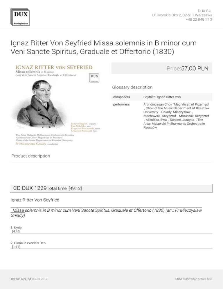 DUX S.J. Ul. Morskie Oko 2, 02-511 Warszawa +48 22 849 11 3 Ignaz Ritter Von Seyfried Missa solemnis in B minor cum Veni Sancte Spiritus, Graduale et Offertorio (1830) Price:57,00 PLN Glossary description composers Seyfried, Ignaz Ritter Von ∎ performers Archdiocesan Choir ‘Magnificat’ of Przemyśl ∎, Choir of the Music Department of Rzeszów University ∎, Gniady, Mieczysław ∎, Machowski, Krzysztof ∎, Matuszak, Krzysztof ∎, Mikulska, Ewa ∎, Stępień, Justyna ∎, The Artur Malawski Philharmonic Orchestra in Rzeszów ∎ Product description CD DUX 1229Total time: [49:12] Ignaz Ritter Von Seyfried Missa solemnis in B minor cum Veni Sancte Spiritus, Graduale et Offertorio (1830) (arr.: Fr Mieczysław Gniady) 1. Kyrie [4:44] 2. Gloria in excelsis Deo [1:17] The file created: 03-03-2017 Shop`s software AptusShop DUX S.J. Ul. Morskie Oko 2, 02-511 Warszawa +48 22 849 11 3 3. Gratias agimus tibi [4:07] 4. Quoniam tu solus sanctus [3:05] 5. Credo in unum Deum [2:29] 6. Et incarnatus est [3:41] 7. Et resurrexit [2:50] 8. Et vitam venturi [2:03] 9. Sanctus [1:11] 10. Pleni sunt caeli [0:57] 11. Benedictus [4:25] 12. Agnus Dei [4:07] 13. Dona nobis pacem [2:17] 14. Veni Sancte Spiritus [3:14] 15. Graduale – Assumpta est Maria [4:18] 16. Offertorium – Ave Maria [4:24] Performers: Archdiocesan Choir ‘Magnificat’ of Przemyśl Choir of the Music Department of Rzeszów University The file created: 03-03-2017 Shop`s software AptusShop DUX S.J. Ul. Morskie Oko 2, 02-511 Warszawa +48 22 849 11 3 Mieczysław Gniady /conductor/ Krzysztof Machowski /tenore/ Krzysztof Matuszak /bass/ Ewa Mikulska /alto/ Justyna Stępień /soprano/ The Artur Malawski Philharmonic Orchestra in Rzeszów The file created: 03-03-2017 Powered by TCPDF (www.tcpdf.org) Shop`s software AptusShop