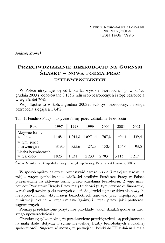 Studia Regionalne i Lokalne Nr 2(16)/2004 ISSN 1509–4995 Andrzej Ziomek Przeciwdzia³anie bezrobociu na Górnym Œl¹sku – nowa forma prac interwencyjnych W Polsce utrzymuje sieþ od kilku lat wysokie bezrobocie, np. w końcu grudnia 2003 r. odnotowano 3 175,7 mln osób bezrobotnych i stopeþ bezrobocia w wysokości 20%. Woj. ślaþskie to w końcu grudnia 2003 r. 325 tys. bezrobotnych i stopa bezrobocia sieþgajaþca 17,4%. Tab. 1. Fundusz Pracy – aktywne formy przeciwdziałania bezrobociu Rok 1997 Aktywne formy w mln zł 1 168,4 w tym: prace interwencyjne 319,0 Liczba bezrobotnych w tys. osób 1 826 1998 1999 1 241,8 1 0974,4 355,6 1 831 272,3 2 230 2000 2001 2002 767,8 604,4 539,4 150,4 156,6 93,5 2 703 3 115 3 217 Źródło: Ministerstwo Gospodarki, Pracy i Polityki Społecznej, Departament Funduszy, 2003 r. W sposób ogólny nalezú y tu przedstawić bardzo niskie (i malejaþce z roku na rok) – wreþcz symboliczne – wielkości środków Funduszu Pracy w Polsce przeznaczane na aktywne formy przeciwdziałania bezrobociu. Z tego m.in. powodu Powiatowe Urzeþdy Pracy majaþ trudności (w tym przypadku finansowe) w realizacji swoich podstawowych zadań. Staþd rodzi sieþ poszukiwanie nowych, nietypowych form aktywizacji bezrobotnych zarówno przy współpracy administracji lokalnej – urzeþdu miasta (gminy) i urzeþdu pracy, jak i partnerów zagranicznych. Ponizú ej przedstawione pozytywne przykłady takich działań godne saþ szerszego upowszechnienia. Obawiać sieþ tylko mozúna, zúe przedstawione przedsieþwzieþcia saþ podejmowane na małaþ skaleþ (dotyczaþ w sumie niewielkiej liczby bezrobotnych z lokalnej społeczności). Sugerować mozú na, zú e po wejściu Polski do UE z dniem 1 maja 114 ANDRZEJ ZIOMEK 2004 r. Polacy cheþtni do pracy za granicaþ (i znajaþcy jeþzyki obce) ruszaþ indywidualnie za graniceþ w poszukiwaniu pracy. Wiaþzać sieþ to beþdzie oczywiście z wieloma sukcesami – zwiaþzanymi ze znalezieniem pracy, jak tezú z szeregiem porazú ek i rozczarowań. Miasto Chorzów (gmina miejska na prawach powiatu w województwie ślaþskim – w końcu grudnia 2003 r. charakteryzowało sieþ stopaþ bezrobocia wynoszaþcaþ 23,5% przy liczbie 11,1 tys. bezrobotnych) współpracuje dotychczas z 4 miastami partnerskimi, a od maja 2004 r. tych miast partnerskich beþdzie juzú 5. Z jednym z tych miast partnerskich – Termoli (region Molise, środkowe Włochy, koło półwyspu Gargano nad Adriatykiem) – w 1999 r. nawiaþzano współpraceþ dotyczaþcaþ zatrudnienia grupy bezrobotnych. Włoska misja gospodarcza – oddział regionalny Molise, która gościła w 1999 r. w Chorzowie, zwróciła sieþ do władz miejskich z inicjatywaþ zatrudnienia w ramach praktyk zawodowych pewnej grupy chorzowskich bezrobotnych. Zatrudnienie polega na 6-miesieþcznych stazú ach w lokalnej gastronomii i hotelach w okresie trwajaþcego od maja do października sezonu turystycznego. Strona włoska przygotowuje wszelkie formalności, które saþ wymagane we Włoszech, jak na przykład: – poszczególni włoscy przedsieþbiorcy składajaþ aplikacje włoskim Ministerstwie Polityki Społecznej, – wymienione ministerstwo weryfikuje otrzymane od przedsieþbiorców informacje i w terminie 4 miesieþcy wydawana jest zgoda ministerstwa oraz prefektury policji (sprawy meldunkowe), – pracobiorcy ze swojej strony otrzymujaþ: • 40-godzinny czas pracy, • ubezpieczenie OC i NW oraz ubezpieczenie od kosztów leczenia, • nocleg, • wyzú ywienie, • kieszonkowe w wysokości 250 euro miesieþcznie, – na podstawie dokumentów przedstawionych przez stroneþ włoskaþ chorzowscy bezrobotni mogaþ ubiegać sieþ o wizeþ włoskaþ z pozwoleniem na praceþ. Powyzú ej przedstawione informacje o naborze do pracy we Włoszech saþ ogłaszane przez Urzaþd Miejski w lokalnych mediach informacyjnych. W 2001 r. dokonano pierwszego naboru cheþtnych do wyjazdu do pracy we Włoszech. Zgłosiło sieþ około 50 cheþtnych, z tej liczby wybrano 30 osób. Z tej grupy ostatecznie do pracy w 2002 r. wyjechało 10 osób. W 2002 r. przeprowadzono drugi nabór. Zgłosiło sieþ około 40 cheþtnych, spośród których wybrano 35 osób. Ostatecznie w 2003 r. wyjechało do pracy 21 osób. W 2003 r. do trzeciego naboru zgłosiło sieþ 45 osób, spośród których wybrano 21 osób. Z punktu widzenia terminu omawianego zagadnienia (marzec 2004 r.) trudno jest określić, ile osób faktycznie wyjedzie do pracy. O wyborze kandydatów do wyjazdu decydujaþ wytyczne strony włoskiej. Warunki zakwalifikowania sieþ do wyjazdu saþ nasteþpujaþce: • wiek 20–40 lat, PRZECIWDZIAŁANIE BEZROBOCIU NA GÓRNYM ŚLAþSKU... 115 • dotychczasowa praktyka recepcyjno-hotelarsko-gastronomiczna, tj. zawody: barman, kelner, kucharz, pokojowe itp., • mile widziane dodatkowe kwalifikacje (kursy). Znajomość jeþzyka włoskiego nie jest wymogiem formalnym, ale osoby zakwalifikowane do wyjazdu przechodziły intensywny podstawowy kurs jeþzyka włoskiego, dotyczaþcy zwłaszcza terminologii uzú ywanych w tych zawodach, w których majaþ pracować uczestnicy. Kurs organizowany jest przez Powiatowy Urzaþd Pracy w Chorzowie, ze środków tegozú urzeþdu. Powiatowy Urzaþd Pracy zorganizował równiezú zebranie informacyjne dla wyjezú dzú ajaþcych do pracy, informujaþc ich o statusie w czasie pobytu za granicaþ (konieczność opłacania składek na ZUS, zagadnienie późniejszych ewentualnych uprawnień do uzyskania zasiłków dla bezrobotnych itp.). Natomiast Urzaþd Miejski w Chorzowie dofinansował przejazd uczestników do Warszawy po wizeþ włoskaþ oraz przejazd do Włoch. W sumie dotacja z kasy miejskiej na te przejazdy wynosiła po 5 tys. zł rocznie. Nalezú y tutaj podkreślić, zú e za kazú dym razem (kazú dego roku) udoskonala sieþ procedury administracyjne. Planuje sieþ równiezú rozszerzyć sezonowaþ praceþ za granicaþ o studentów i absolwentów. W 2004 r. Urzaþd Miejski or