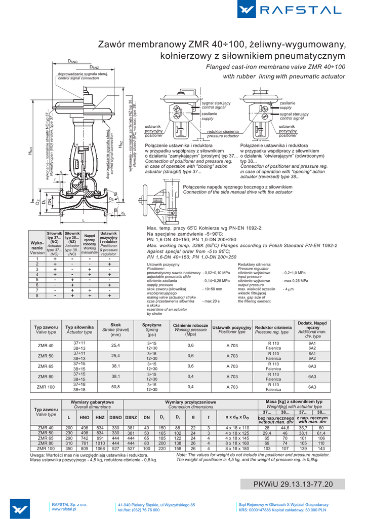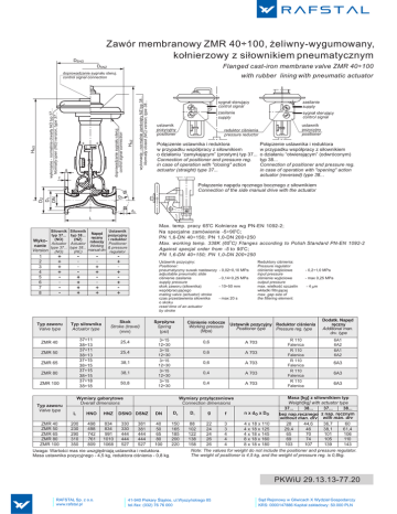 Zawór membranowy ZMR 40÷100, ¿eliwny-wygumowany, ko³nierzowy z si³ownikiem pneumatycznym DSNO Flanged cast-iron membrane valve ZMR 40÷100 DSNZ wykonanie - normalnie zamkniêty NZ typ 38... Normally closed (NC) version, type 38... g f HNZ with rubber lining with pneumatic actuator doprowadzanie sygna³u steruj. control signal connection HNO wykonanie - normalnie otwarty NO typ 37... Normally open (NO) version, type 37... doprowadzanie sygna³u steruj. control signal connection ustawnik pozycyjny positioner sygna³ steruj¹cy control signal zasilanie supply zasilanie supply sygna³ steruj¹cy control signal ustawnik pozycyjny positioner reduktor ciœnienia pressure reductor Po³¹czenie ustawnika i reduktora w przypadku wspó³pracy z si³ownikiem o dzia³aniu “zamykaj¹cym” (prostym) typ 37... Connection of positioner and pressure reg. in case of operation with "closing" action actuator (straight) type 37... Po³¹czenie ustawnika i reduktora w przypadku wspó³pracy z si³ownikiem o dzia³aniu “otwieraj¹cym” (odwróconym) typ 38... Connection of positioner and pressure reg. in case of operation with "opening" action actuator (reversed) type 38... Po³¹czenie napêdu rêcznego bocznego z si³ownikiem Connection of the side manual drive with the actuator DZ D1 DN Do do L Si³ownik typ 37... (NO) WykoActuator nanie type 37... Version (NO) o Max. temp. pracy 65 C Ko³nierze wg PN-EN 1092-2; Na specjalne zamówienie -5÷90oC; PN 1,6-DN 40÷150; PN 1,0-DN 200÷250 Max. working temp. 338K (65OC) Flanges according to Polish Standard PN-EN 1092-2 o Against specjal order from -5 to 90 C; PN 1,6-DN 40÷150; PN 1,0-DN 200÷250 Ustawnik Si³ownik typ 38... Napêd pozycyjny rêczny i reduktor (NZ) Actuator roboczy Positioner type 38... Working & pressure (NC) manual drv regulator 1 2 3 4 5 6 7 8 Ustawnik pozycyjny: Positioner: pneumatyczny suwak nastawczy adjustable pneumatic slide ciœnienie zasilania supply pressure skok zaworu (si³ownika) wspó³pracuj¹cego mating valve (actuator) stroke czas przestawienia si³ownika o skoku reset time of an actuator by stroke Typ zaworu Valve type Typ si³ownika Actuator type ZMR 50 ZMR 65 ZMR 80 ZMR 100 ZMR 40 ZMR 50 ZMR 65 ZMR 80 ZMR 100 Sprê¿yna Spring (psi) 25,4 3÷15 12÷30 3÷15 12÷30 3÷15 12÷30 3÷15 12÷30 3÷15 12÷30 37÷11 38÷13 37÷11 38÷13 37÷15 38÷15 37÷15 38÷15 37÷18 38÷18 ZMR 40 Typ zaworu Valve type Skok Stroke (travel) (mm) 25,4 38,1 38,1 50,8 Wymiary gabarytowe Overall dimensions L HNO HNZ 200 230 290 310 350 498 498 742 761 809 834 834 991 1010 1068 - 0,02÷0,10 MPa - 0,14÷0,25 MPa - 10÷50 mm - max 20 s Reduktory ciœnienia: Pressure regulator ciœnienie wejœciowe input pressure ciœnienie wyjœciowe output pressure max. wielkoœæ szczelin wk³adki filtruj¹cej max. gap size of the filtering element. - 0,2÷1,0 MPa - max 0,25 MPa -4 m Ciœnienie robocze Ustawnik pozycyjny Reduktor ciœnienia Working pressure Positioner type Pressure reg. type (Mpa) 0,6 A 703 0,6 A 703 0,6 A 703 0,4 A 703 0,4 A 703 R 110 Falenica R 110 Falenica R 110 Falenica R 110 Falenica R 110 Falenica Dodatk. Napêd rêczny Additional man. drv. type 6A1 6A2 6A1 6A2 6A3 6A3 6A3 Masa [kg] z si³ownikiem typ Weight[kg] with actuator type 37... 38... 37... 38... g n x do x Do D1 f bez nap.rêcznego z nap. rêcznym without man. drv with man. drv 28 36,7 60 88 22 4 x 18 x 110 44,6 3 29,4 38,1 61,4 102 24 4 x 18 x 125 46 3 65 101 106 122 24 4 x 18 x 145 70 4 69 105 110 138 26 8 x 18 x 160 74 4 139 103 143 158 26 8 x 18 x 180 107 4 Note: The values for weight do not include the positioner and pressure regulator. The weight of positioner is 4,5 kg, and the weight of pressure reg. is 0,8kg. Wymiary przy³¹czeniowe Connection dimensions DSNO DSNZ 330 330 444 444 527 381 381 444 444 527 DN DZ 40 50 65 80 100 150 165 185 200 220 Uwaga: Wartoœci mas nie uwzglêdniaj¹ ustawnika i reduktora. Masa ustawnika pozycyjnego - 4,5 kg, reduktora ciœnienia - 0,8 kg. PKWiU 29.13.13-77.20 RAFSTAL Sp. z o.o. www.rafstal.pl 41-940 Piekary Śląskie, ul.Wyszyńskiego 85 tel./fax: (032) 76 76 000 Sąd Rejonowy w Gliwicach X Wydział Gospodarczy KRS: 0000147886 Kapitał zakładowy: 50.000 PLN 23