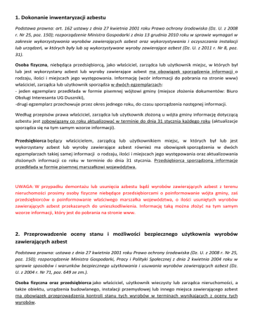 1. Dokonanie inwentaryzacji azbestu Podstawa prawna: art. 162 ustawy z dnia 27 kwietnia 2001 roku Prawo ochrony środowiska (Dz. U. z 2008 r. Nr 25, poz. 150); rozporządzenie Ministra Gospodarki z dnia 13 grudnia 2010 roku w sprawie wymagań w zakresie wykorzystywania wyrobów zawierających azbest oraz wykorzystywania i oczyszczania instalacji lub urządzeń, w których były lub są wykorzystywane wyroby zawierające azbest (Dz. U. z 2011 r. Nr 8, poz. 31). Osoba fizyczna, niebędąca przedsiębiorcą, jako właściciel, zarządca lub użytkownik miejsc, w których był lub jest wykorzystany azbest lub wyroby zawierające azbest ma obowiązek sporządzenia informacji o rodzaju, ilości i miejscach jego występowania. Informację (wzór informacji do pobrania na stronie www) właściciel, zarządca lub użytkownik sporządza w dwóch egzemplarzach: - jeden egzemplarz przedkłada w formie pisemnej wójtowi gminy (miejsce złożenia dokumentów: Biuro Obsługi Interesanta UG Duszniki), -drugi egzemplarz przechowuje przez okres jednego roku, do czasu sporządzenia następnej informacji. Według przepisów prawa właściciel, zarządca lub użytkownik złożoną u wójta gminy informację dotyczącą azbestu jest zobowiązany co roku aktualizować w terminie do dnia 31 stycznia każdego roku (aktualizacje sporządza się na tym samym wzorze informacji). Przedsiębiorca będący właścicielem, zarządcą lub użytkownikiem miejsc, w których był lub jest wykorzystany azbest lub wyroby zawierające azbest również ma obowiązek sporządzenia w dwóch egzemplarzach takiej samej informacji o rodzaju, ilości i miejscach jego występowania oraz aktualizowania złożonych informacji co roku w terminie do dnia 31 stycznia. Przedsiębiorca sporządzoną informacje przedkłada w formie pisemnej marszałkowi województwa. UWAGA: W przypadku demontażu lub usunięcia azbestu bądź wyrobów zawierających azbest z terenu nieruchomości prosimy osoby fizyczne niebędące przedsiębiorcami o poinformowanie wójta gminy, zaś przedsiębiorców o poinformowanie właściwego marszałka województwa, o ilości usuniętych wyrobów zawierających azbest przekazanych do unieszkodliwienia. Informację taką można złożyć na tym samym wzorze informacji, który jest do pobrania na stronie www. 2. Przeprowadzenie oceny stanu i możliwości bezpiecznego użytkownia wyrobów zawierających azbest Podstawa prawna: ustawa z dnia 27 kwietnia 2001 roku Prawo ochrony środowiska (Dz. U. z 2008 r. Nr 25, poz. 150); rozporządzenie Ministra Gospodarki, Pracy i Polityki Społecznej z dnia 2 kwietnia 2004 roku w sprawie sposobów i warunków bezpiecznego użytkowania i usuwania wyrobów zawierających azbest (Dz. U. z 2004 r. Nr 71, poz. 649 ze zm.). Osoba fizyczna oraz przedsiębiorca jako właściciel, użytkownik wieczysty lub zarządca nieruchomości, a także obiektu, urządzenia budowlanego, instalacji przemysłowej lub innego miejsca zawierającego azbest ma obowiązek przeprowadzenia kontroli stanu tych wyrobów w terminach wynikających z oceny tych wyrobów. Z przeprowadzonej kontroli okresowej oceny sporządza się w jednym egzemplarzu ocenę stanu i możliwości bezpiecznego użytkowania wyrobów zawierających azbest, zwaną dalej „oceną” (wzór oceny do pobrania na stronie www). Ocena powinna być przechowywana przez osoby fizyczne bądź przedsiębiorców wraz z dokumentacją miejsca zawierającego azbest, obiektu, urządzenia budowlanego lub instalacji przemysłowej. Dla budynków oraz obiektów budowlanych niebędących budynkami, dla których jest prowadzona książka obiektu budowlanego na podstawie art. 64 ust. 1 ustawy z dnia 7 lipca 1994 r.- Prawo budowlane, ocena ta powinna być dołączona do książki obiektu budowlanego. Sporządzenie oceny stanu i możliwości bezpiecznego użytkowania wyrobów zawierających azbest jest bardzo istotne, gdyż dokonana w formie punktowej ocena przesądza czy wyroby zawierające azbest należy bezzwłocznie wymienić, naprawić, czy też można je dalej eksploatować. 3. Usunięcie azbestu Podstawa prawna: ustawa z dnia 27 kwietnia 2001 roku Prawo ochrony środowiska (Dz. U. z 2008 r. Nr 25, poz. 150); ustawa z dnia 27 kwietnia 2001 roku o odpadach (Dz. U. z 2010 r. Nr 185, poz. 1243 ze zm.); rozporządzenie Ministra Gospodarki, Pracy i Polityki Społecznej z dnia 2 kwietnia 2004 roku w sprawie sposobów i warunków bezpiecznego użytkowania i usuwania wyrobów zawierających azbest (Dz. U. z 2004 r. Nr 71, poz. 649). Usunięcia wyrobów zawierających azbest z budynków, budowli lub oczyszczenia instalacji, urządzeń oraz terenu danej nieruchomości z azbestu dokonać może tylko specjalistyczna firma, która posiada uprawnienia, odpowiedni sprzęt, przeszkolonych pracowników, a przede wszystkim odpowiednie zezwolenie, pozwolenie lub decyzje zatwierdzającą program gospodarowania odpadami niebezpiecznymi, którą wydaje właściwy marszałek województwa (według siedziby lub miejsca zamieszkania wytwórcy odpadów). Szczegółowe warunki i sposób przeprowadzenia prac polegających usuwaniu wyrobów azbestowych i transporcie określa powyższe rozporządzenie. Wszystkie usunięte wyroby zawierające azbest, jako odpady niebezpieczne powinny być unieszkodliwiane poprzez składowanie na składowiskach odpadów niebezpiecznych. UWAGA: Ogólnodostępne zbiory zawierające informacje o firmach uprawnionych do wykonywania prac w kontakcie z azbestem są umieszczone na stronie www.bazaazbestowa.pl w zakładce "Firmy".
