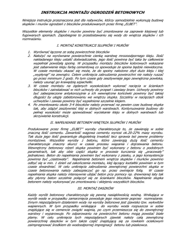 INSTRUKCJA MONTAŻU OGRODZEŃ BETONOWYCH Niniejsza instrukcja przeznaczona jest dla nabywców, którzy samodzielnie wykonują budowę słupków i murów ogrodzeń z bloczków produkowanych przez firmę „ELBET”. Wszystkie elementy słupków i murów powinny być zmontowane na zaprawie klejowej lub fugowanych spoinach. Zapobiegnie to przedostawaniu się wody do wnętrza słupków i ich rozmrażaniu. I. MONTAŻ KONSTRUKCJI SŁUPKÓW I MURÓW 1. Wyrównać łączone ze sobą powierzchnie bloczków 2. Nałożyć na wyrównane powierzchnie cienką warstwę mrozoodpornego kleju. Ilość nakładanego kleju ustalić doświadczalnie, jego ilość powinna być taka by całkowicie wypełniał powstałą spoinę. W przypadku montażu bloczków kolorowych wskazane jest zabarwienie kleju farbą cementową co spowoduje że spoina będzie niewidoczna. W czasie montażu okazać się może, że do spoiny nałożono zbyt dużo kleju i klej „wypłynął” na zewnątrz. Celem uniknięcia zabrudzenia powierzchni nie należy ruszać go przez minimum 2 godz. Po tym czasie gdy zesztywnieje jego zewnętrzna powłoka, należy usunąć go krawędzią szpachelki. 3. W czasie montażu na żądanych wysokościach wykonać nacięcia w ściankach bloczków i zainstalować w nich uchwyty do przęseł i zawiasy bram. Uchwyty powinny być zabezpieczone antykorozyjnie a ich wewnętrzne końcówki powinny być takiej długości by uległy zabetonowaniu we wnętrzu słupka. Szczeliny w nacięciach obok uchwytów i zawias powinny być wypełnione szczelnie klejem. 4. Po zmontowaniu około 3-4 bloczków należy przerwać na pewien czas budowę słupka tak, aby zdążył zesztywnieć klej w dolnych warstwach. Kontynuowanie budowy do pełnej wysokości może spowodować wyciskanie kleju w dolnych warstwach lub skrzywienie konstrukcji. II. NAPEŁNIANIE BETONEM WNĘTRZA SŁUPKÓW I MURÓW Produkowane przez firmę „ELBET” wyroby charakteryzuje to, że zawierają w sobie znaczną ilość cementu. Zawartość wagowa cementu wynosi ok.20-22% masy wyrobu. Tak duża jego ilość gwarantuje długoletnią trwałość lecz sprawia też pewne problemy montażowe. Wszystkie wyroby z betonu, które zawierają dużą ilość cementu charakteryzuje znaczny skurcz w czasie procesu wiązania i dojrzewania betonu. Wewnętrzny betonowy rdzeń słupka powinien być wykonany z betonu o podobnych parametrach, tak aby obie części słupka w procesie kurczenia się „pracowały” jednakowo. Beton do napełniania powinien być wykonany z piasku, a jego konsystencja powinna być „ciastowata”. Napełnianie betonem wnętrza słupków i murków powinno odbyć się w min. 1 dzień od zakończenia montażu, klej łączący kształtki powinien w tym czasie stwardnieć. W celu uniknięcia zabrudzenia zewnętrznej powierzchni słupka w czasie betonowania należy zabezpieczyć go np. przez owinięcie folią. W czasie napełniania słupka należy intensywnie ubijać beton przy pomocy np. drewnianej łaty tak aby płynny beton szczelnie połączył się ze ściankami bloczków. Napełnianie słupka betonem należy wykonywać po zmontowaniu i sklejeniu wszystkich bloczków. III. MONTAŻ DASZKÓW Każdy wyrób betonowy charakteryzuje się pewną nasiąkliwością wodną. Wnikająca w wyrób woda w przypadku zamarznięcia powoduje jego niszczenie poprzez rozmrażanie. Innym niepożądanym działaniem wody na wyroby betonowe jest zjawisko tzw. wykwitów wapiennych. W tym przypadku wnikająca do wyrobu woda rozpuszcza w sobie znajdujące się w cemencie związki wapnia, po czym przemieszcza się do zewnętrznej warstwy i wyparowuje. Po odparowaniu na powierzchni betonu mogą powstać białe plamy. W celu uniknięcia tych niepożądanych zjawisk należy całą zewnętrzną powierzchnię daszków w tym także część znajdującą się za rowkiem ociekowym zaimpregnować środkiem do wodoodpornej impregnacji betonu lub piaskowca.