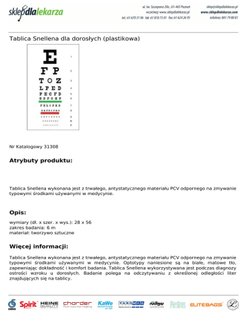 Tablica Snellena dla dorosłych (plastikowa) Nr Katalogowy 31308 Atrybuty produktu: Tablica Snellena wykonana jest z trwałego, antystatycznego materiału PCV odpornego na zmywanie typowymi środkami używanymi w medycynie. Opis: wymiary (dł. x szer. x wys.): 28 x 56 zakres badania: 6 m materiał: tworzywo sztuczne Więcej informacji: Tablica Snellena wykonana jest z trwałego, antystatycznego materiału PCV odpornego na zmywanie typowymi środkami używanymi w medycynie. Optotypy naniesione są na białe, matowe tło, zapewniając dokładność i komfort badania. Tablica Snellena wykorzystywana jest podczas diagnozy ostrości wzroku u dorosłych. Badanie polega na odczytywaniu z określonej odległości liter znajdujących się na tablicy. Powered by TCPDF (www.tcpdf.org)