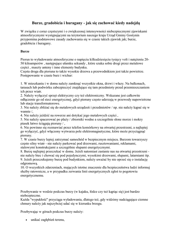 Burze, gradobicia i huragany - jak się zachować kiedy nadejdą W związku z coraz częstszymi i o zwiększonej intensywności niebezpiecznymi zjawiskami atmosferycznymi występującymi na terytorium naszego kraju Urząd Gminy Gostynin przypomina podstawowe zasady zachowania się w czasie takich zjawisk jak; burze, gradobicia i huragany. Burze Piorun to wyładowanie atmosferyczne o napięciu kilkudziesięciu tysięcy volt i natężeniu 2050 kiloamperów , następujące ułamku sekundy , które szuka sobie drogi przez metalowe części , maszty anteny i inne elementy budynku. Częsta droga dla pioruna to także wysokie drzewa a przewodnikiem jest także powietrze. Postępowanie w czasie burz i wichur: 1. W mieszkaniu i w domu należy zamknąć wszystkie okna, drzwi i włazy. Na balkonach, tarasach lub podwórku zabezpieczyć znajdujące się tam przedmioty przed przemieszczaniem ich przez wiatr. 2. Należy wyłączyć sprzęt elektryczny czy też elektroniczny. Wskazane jest całkowite odłączenie go od sieci energetycznej, gdyż pioruny często uderzają w przewody napowietrzne lub stacje transformatorowe. 3. Nie należy zbliżać się do metalowych urządzeń i przedmiotów / np. nie należy kąpać się w wannie /, 4. Nie należy jeździć na rowerze ani dotykać jego metalowych części , 5. Nie należy spacerować po plaży / zbiorniki wodne a szczególnie słone morze i mokry piasek łatwo ściągają pioruny / , 6. Nie powinno się rozmawiać przez telefon komórkowy na otwartej przestrzeni, a najlepiej go wyłączyć, gdyż włączony wytwarza pole elektromagnetyczne, które może przyciągnąć pioruny. 7. W czasie burzy lepiej zatrzymać samochód w bezpiecznym miejscu. Burzom towarzyszy często silny wiatr - nie należy parkować pod drzewami, rusztowaniami, reklamami, stalowymi konstrukcjami a szczególnie słupami energetycznymi. 8. Burzę najlepiej przeczekać w domu. Jeżeli natomiast zastanie nas na otwartej przestrzeni nie należy biec i chować się pod pojedynczymi, wysokimi drzewami, słupami, latarniami itp. 9. Jeżeli przeczekujemy burzę pod budynkiem, należy uważać by nie oprzeć się o instalację odgromową. 10. O wszystkich zdarzeniach, mających istotne znaczenie dla bezpieczeństwa ludzi informuj służby ratownicze, a w przypadku zerwania linii energetycznych zgłoś to pogotowiu energetycznemu. Przebywanie w wodzie podczas burzy (w kajaku, łódce czy też kąpiąc się) jest bardzo niebezpieczne. Każda "wypukłość" przyciąga wyładowania, dlatego też, gdy widzimy nadciągające ciemne chmury należy jak najszybciej udać się w kierunku brzegu. Przebywając w górach podczas burzy należy: unikać zagłębień terenu, nie stać w rozkroku usiąść ze złączonymi nogami na plecaku bez metalowych elementów lub karimacie co odizolowuje od ziemi, a tym samym chroni przed rozchodzącymi się po niej od pioruna ładunkiem elektrycznym, zejść ok. 100 m poniżej grzbietu, na jego zawietrzną stronę - jest ona najmniej narażona na uderzenia piorunów, nie kłaść się. PIERWSZA POMOC! Osoby porażonej piorunem , u której nie wyczuwalny jest oddech i tętno , należy udzielić pierwszej pomocy , wykonując masaż serca i sztuczne oddychanie. Zawsze należy jak najszybciej wezwać fachową pomoc. Nie należy bać się dotykać osoby porażonej piorunem !!! GRADOBICIE Najczęstszą przyczyną występowania gradobicia jest powstanie chmur gradowych na skutek silnych, pionowych ruchów powietrza. Zjawisko to ma miejsce najczęściej w okresie letnim. Bądź przygotowany na wystąpienie gradobicia !!! 1. Ubezpiecz swoje mieszkanie, dom, samochód, zwierzęta gospodarskie, uprawy polowe od skutków gradobicia. 2. Zapisz i zapamiętaj numer telefonu na pogotowie ratunkowe, do służb weterynaryjnych i upewnij się, czy wszyscy członkowie rodziny je znają. 3. Przygotuj swoje mieszkanie, swój dom : zabezpiecz rynny i inne części budynku; zabezpiecz lampy i inne urządzenia, które mogą ulec zniszczeniu. Podczas gradobicia 1. Jeżeli spotka cię gradobicie z dala od domu, znajdź bezpieczne schronienie i pozostań tam do czasu jego zakończenia. 2. Jeśli jesteś w domu: zamknij okna, usuń z parapetów i balkonów przedmioty, które mogą zagrażać przechodniom; pozostań w nim z dala od oszklonych okien, sufitów i drzwi; w miarę możliwości pozamykaj zwierzęta domowe i hodowlane; trzymaj pod ręką przygotowane latarki oraz dodatkowe baterie; miej włączone radio, w celu uzyskania ewentualnych komunikatów. 3. O wszystkich zdarzeniach, mających istotne znaczenie dla bezpieczeństwa ludzi informuj pogotowie ratunkowe, a w przypadku zerwania linii energetycznych zgłoś to pogotowiu energetycznemu. Po gradobiciu 1. Jeśli są poszkodowani to : udziel pierwszej pomocy rannym lub poszkodowanym osobom; nie przenoś ciężko rannych osób, chyba że są one bezpośrednio zagrożone doznaniem kolejnych obrażeń - wezwij pomoc. 2. Jeżeli byłeś ubezpieczony przed gradobiciem, wykonaj zdjęcia zniszczeń, zarówno domu, jak i jego wyposażenia w celu ubiegania się o odszkodowanie HURAGAN Występowanie huraganów (silnych wiatrów) powodowane jest najczęściej, szybko przemieszczającymi się aktywnymi niżami. Najgroźniejszą formę przyjmują one w okresie : wiosennym i jesiennym Przed wystąpieniem huraganu (silnych wiatrów): 1. Upewnij się, czy wszyscy członkowie twojej rodziny wiedza jak postępować w czasie huraganu, oraz naucz ich jak wyłączać gaz, elektryczność i wodę. 2. Opracuj plan komunikowania się w czasie zagrożenia na okoliczność, gdy członkowie rodziny są rozdzieleni (realny przypadek, gdy dorośli są w pracy, a dzieci w szkole). 3. Naucz dzieci, jak i kiedy wzywa się policję lub straż pożarna, oraz które radio jest nastrojone na odbiór informacji o stanie zagrożenia. Podczas huraganu 1. Miej włączone radio bateryjne na częstotliwości radia regionalnego „ Radio dla Ciebie” 101,00 MHz albo program lok