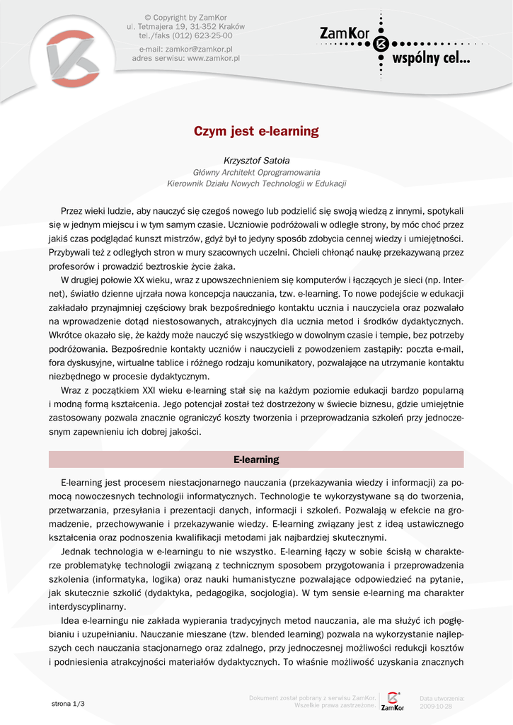 Czym jest e-learning Krzysztof Satoła Główny Architekt Oprogramowania Kierownik Działu Nowych Technologii w Edukacji Przez wieki ludzie, aby nauczyć się czegoś nowego lub podzielić się swoją wiedzą z innymi, spotykali się w jednym miejscu i w tym samym czasie. Uczniowie podróżowali w odległe strony, by móc choć przez jakiś czas podglądać kunszt mistrzów, gdyż był to jedyny sposób zdobycia cennej wiedzy i umiejętności. Przybywali też z odległych stron w mury szacownych uczelni. Chcieli chłonąć naukę przekazywaną przez profesorów i prowadzić beztroskie życie żaka. W drugiej połowie XX wieku, wraz z upowszechnieniem się komputerów i łączących je sieci (np. Internet), światło dzienne ujrzała nowa koncepcja nauczania, tzw. e-learning. To nowe podejście w edukacji zakładało przynajmniej częściowy brak bezpośredniego kontaktu ucznia i nauczyciela oraz pozwalało na wprowadzenie dotąd niestosowanych, atrakcyjnych dla ucznia metod i środków dydaktycznych. Wkrótce okazało się, że każdy może nauczyć się wszystkiego w dowolnym czasie i tempie, bez potrzeby podróżowania. Bezpośrednie kontakty uczniów i nauczycieli z powodzeniem zastąpiły: poczta e-mail, fora dyskusyjne, wirtualne tablice i różnego rodzaju komunikatory, pozwalające na utrzymanie kontaktu niezbędnego w procesie dydaktycznym. Wraz z początkiem XXI wieku e-learning stał się na każdym poziomie edukacji bardzo popularną i modną formą kształcenia. Jego potencjał został też dostrzeżony w świecie biznesu, gdzie umiejętnie zastosowany pozwala znacznie ograniczyć koszty tworzenia i przeprowadzania szkoleń przy jednoczesnym zapewnieniu ich dobrej jakości. E-learning E-learning jest procesem niestacjonarnego nauczania (przekazywania wiedzy i informacji) za pomocą nowoczesnych technologii informatycznych. Technologie te wykorzystywane są do tworzenia, przetwarzania, przesyłania i prezentacji danych, informacji i szkoleń. Pozwalają w efekcie na gromadzenie, przechowywanie i przekazywanie wiedzy. E-learning związany jest z ideą ustawicznego kształcenia oraz podnoszenia kwalifikacji metodami jak najbardziej skutecznymi. Jednak technologia w e-learningu to nie wszystko. E-learning łączy w sobie ścisłą w charakterze problematykę technologii związaną z technicznym sposobem przygotowania i przeprowadzenia szkolenia (informatyka, logika) oraz nauki humanistyczne pozwalające odpowiedzieć na pytanie, jak skutecznie szkolić (dydaktyka, pedagogika, socjologia). W tym sensie e-learning ma charakter interdyscyplinarny. Idea e-learningu nie zakłada wypierania tradycyjnych metod nauczania, ale ma służyć ich pogłębianiu i uzupełnianiu. Nauczanie mieszane (tzw. blended learning) pozwala na wykorzystanie najlepszych cech nauczania stacjonarnego oraz zdalnego, przy jednoczesnej możliwości redukcji kosztów i podniesienia atrakcyjności materiałów dydaktycznych. To właśnie możliwość uzyskania znacznych strona 1/3 Data utworzenia: 2009-10-28 oszczędności w kosztach procesu kształcenia, bez jednoczesnej potrzeby rezygnacji z jakości tego procesu, jest jednym z motorów powodujących dużą popularność i szybki rozwój e-learningu. Zdefiniowanie e-learningu nie jest proste, gdyż może on przybierać różne formy. Ponadto każdy, patrząc z perspektywy własnych doświadczeń, postrzega go inaczej. E-learning jest często kojarzony z medium transmisyjnym, jakimi są nośniki danych (np. płyty CD) lub sieć komputerowa. Z punktu widzenia ucznia, najbardziej istotnym aspektem e-learningu są treści udostępniane w formie kursów, gier edukacyjnych i symulacji. Nauczyciele mogą postrzegać e-learning przez pryzmat niemal nieograniczonych możliwości w sposobie prezentacji materiału dydaktycznego, pozwalających na tworzenie treści multimedialnych i interaktywnych. Jednak wykorzystanie komputerów w e-learningu zmusza też dydaktyków do zmiany koncepcji i sposobu prezentacji materiału w porównaniu z metodami tradycyjnymi. Coraz częściej można spotkać kursy, których podstawowym celem jest nauczenie uczniów wykorzystania dostępnych w sieci materiałów i narzędzi przydatnych do realizacji celów kształcenia. W erze natłoku informacji umiejętność wyselekcjonowania tej najbardziej odpowiedniej i wykorzystania jej staje się jedną z umiejętności kluczowych. E-learning jako metoda świetnie sprawdza się też w edukacji całych populacji i organizacji, pozwalając na gromadzenie i udostępnianie wiedzy (tzw. zarządzanie wiedzą). Przedstawione wyżej wybrane aspekty e-learningu uprawniają do stwierdzenia, że bogactwo metod, środków oraz zastosowań e-learningu jest ogromne. Zalety Zastosowanie e-learningu pozwala na uzyskanie szeregu korzyści w porównaniu z nauczaniem metodami tradycyjnymi. E-learning pozwala na indywidualizację procesu nauczania oraz daje możliwość wielokrotnego odbywania zajęć. Uczniowie mogą uczyć się w wybranym przez nich czasie i tempie, dostosowując proces kształcenia do swoich możliwości oraz upodobań. Mogą też w większym stopniu decydować o kolejności zapoznania się z materiałem, jak również w łatwy sposób dokonać jego selekcji. Zastosowanie komputerów w procesie kształcenia umożliwia szybkie generowanie raportów i statystyk pozwalających na dokładną ocenę postępów ucznia przez nauczyciela. Dobrze zaprojektowane i przygotowane kursy e-learningowe dają szansę obniżenia kosztów przeprowadzania szkoleń, ich lepszą wydajność i skuteczność, natomiast zastosowanie platform e-learningowych znacznie ułatwia zarządzanie treściami szkoleniowymi oraz procesem dydaktycznym. Platforma edukacyjna E-learningowy proces nauczania często wspomagają systemy informatyczne zwane platformami. Istnieje wiele rodzajów platform e-learningowych. Służą one między innymi do tworzenia kursów i materiałów dydaktycznych, zarządzania treścią szkoleniową i procesem 