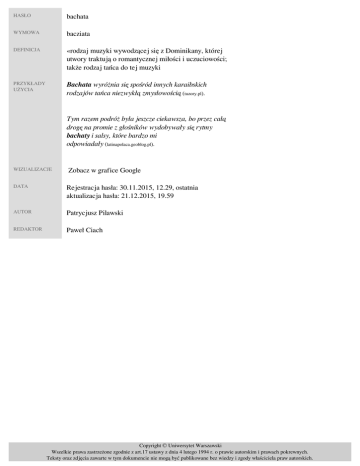 HASŁO bachata WYMOWA bacziata DEFINICJA «rodzaj muzyki wywodzącej się z Dominikany, której utwory traktują o romantycznej miłości i uczuciowości; także rodzaj tańca do tej muzyki» PRZYKŁADY UŻYCIA Bachata wyróżnia się spośród innych karaibskich rodzajów tańca niezwykłą zmysłowością (tuzory.pl). Tym razem podróż była jeszcze ciekawsza, bo przez całą drogę na promie z głośników wydobywały się rytmy bachaty i salsy, które bardzo mi odpowiadały (latinapolaca.geoblog.pl). WIZUALIZACJE Zobacz w grafice Google DATA Rejestracja hasła: 30.11.2015, 12.29, ostatnia aktualizacja hasła: 21.12.2015, 19.59 AUTOR Patrycjusz Pilawski REDAKTOR Paweł Ciach Copyright © Uniwersytet Warszawski Wszelkie prawa zastrzeżone zgodnie z art.17 ustawy z dnia 4 lutego 1994 r. o prawie autorskim i prawach pokrewnych. Teksty oraz zdjęcia zawarte w tym dokumencie nie mogą być publikowane bez wiedzy i zgody właściciela praw autorskich. Powered by TCPDF (www.tcpdf.org)
