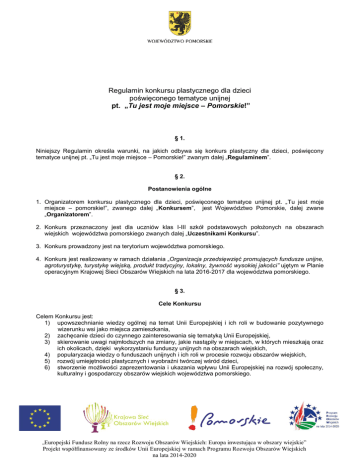 Regulamin konkursu plastycznego dla dzieci poświęconego tematyce unijnej pt. „Tu jest moje miejsce – Pomorskie!” § 1. Niniejszy Regulamin określa warunki, na jakich odbywa się konkurs plastyczny dla dzieci, poświęcony tematyce unijnej pt. „Tu jest moje miejsce – Pomorskie!” zwanym dalej „Regulaminem”. § 2. Postanowienia ogólne 1. Organizatorem konkursu plastycznego dla dzieci, poświęconego tematyce unijnej pt. „Tu jest moje miejsce – pomorskie!”, zwanego dalej „Konkursem”, jest Województwo Pomorskie, dalej zwane „Organizatorem”. 2. Konkurs przeznaczony jest dla uczniów klas I-III szkół podstawowych położonych na obszarach wiejskich województwa pomorskiego zwanych dalej „Uczestnikami Konkursu”. 3. Konkurs prowadzony jest na terytorium województwa pomorskiego. 4. Konkurs jest realizowany w ramach działania „Organizacja przedsięwzięć promujących fundusze unijne, agroturystykę, turystykę wiejską, produkt tradycyjny, lokalny, żywność wysokiej jakości” ujętym w Planie operacyjnym Krajowej Sieci Obszarów Wiejskich na lata 2016-2017 dla województwa pomorskiego. § 3. Cele Konkursu Celem Konkursu jest: 1) upowszechnianie wiedzy ogólnej na temat Unii Europejskiej i ich roli w budowanie pozytywnego wizerunku wsi jako miejsca zamieszkania, 2) zachęcanie dzieci do czynnego zainteresowania się tematyką Unii Europejskiej, 3) skierowanie uwagi najmłodszych na zmiany, jakie nastąpiły w miejscach, w których mieszkają oraz ich okolicach, dzięki wykorzystaniu funduszy unijnych na obszarach wiejskich, 4) popularyzacja wiedzy o funduszach unijnych i ich roli w procesie rozwoju obszarów wiejskich, 5) rozwój umiejętności plastycznych i wyobraźni twórczej wśród dzieci, 6) stworzenie możliwości zaprezentowania i ukazania wpływu Unii Europejskiej na rozwój społeczny, kulturalny i gospodarczy obszarów wiejskich województwa pomorskiego. Fundusz Rolny na rzecz Rozwoju Obszarów Wiejskich: Europa inwestująca w obszary wiejskie” Projekt współfinansowany ze środków Unii Europejskiej w ramach Programu Rozwoju Obszarów Wiejskich na lata 2014-2020 „Europejski § 4. Przedmiot Konkursu Przedmiotem Konkursu jest wykonanie pracy plastycznej ilustrującej przykłady zmian, które nastąpiły na obszarach wiejskich dzięki wykorzystaniu funduszy unijnych lub pomysły na zmiany, jakie mogą zajść na obszarach wiejskich dzięki funduszom pochodzącym z Unii Europejskiej zgodnie z § 6 niniejszego Regulaminu. § 5. Uczestnictwo w Konkursie 1. Warunkiem przystąpienia do Konkursu jest przekazanie wraz z podpisaną pracą formularza Zgłoszenia udziału w konkursie, stanowiącego Załącznik nr 1 do Regulaminu oraz podpisanej Zgody na udział w konkursie stanowiącym Załącznik nr 2 do Regulaminu. Ww. formularze są dostępne na stronach internetowych www.dprow.pomorskie.eu i www.pomorskie.ksow.pl . Prace bez dołączonych formularzy nie będą brały udziału w Konkursie. 2. Zgłoszenia prac dokonuje szkoła. 3. Każda szkoła może zgłosić maksymalnie 3 prace. 4. Udział w Konkursie jest bezpłatny i dobrowolny. § 6. Zasady Konkursu 1. W Konkursie oceniane będą wyłącznie prace plastyczne spełniające następujące kryteria: a) technika wykonania pracy dowolna (rysowanie, malowanie, wyklejanie, wydzierania, itp.) na papierze brystol, b) prace nieoprawiane, c) prace wykonane plasteliną/pastelami/itp. powinny być zabezpieczone w np. w foliowe koszulki, d) format pracy - A4. 2. Każdy praca powinna być wykonana indywidualnie i samodzielnie (nie dopuszcza się prac zbiorowych). 3. Zgłaszane w ramach Konkursu prace niepowinny być dotąd publikowane i nagradzana w ramach innych konkursów plastycznych. 4. Każda praca powinna zawierać czytelnie wypełnioną metryczkę (tekst drukowany) przyklejoną na odwrocie pracy tj.: a) imię i nazwisko dziecka, wiek, klasa, b) pełną nazwę szkoły, adres, nr telefonu kontaktowego, adres e-mail, c) tytuł pracy. Fundusz Rolny na rzecz Rozwoju Obszarów Wiejskich: Europa inwestująca w obszary wiejskie” Projekt współfinansowany ze środków Unii Europejskiej w ramach Programu Rozwoju Obszarów Wiejskich na lata 2014-2020 „Europejski § 7. Termin, miejsce nadsyłania prac 1. Prace wraz z formularzem zgłoszeniowym należy nadsyłać do 28 października 2016 roku na adres: Jednostka Regionalna Krajowej Sieci Obszarów Wiejskich Departament Programów Rozwoju Obszarów Wiejskich Urząd Marszałkowski Województwa Pomorskiego, 80-810 Gdańsk, ul. Okopowa 21/27 z dopiskiem KONKURS PLASTYCZNY „TU JEST MOJE MIEJSCE – POMORSKIE!” 2. O terminie zgłoszenia decyduje data wpływu. Zgłoszenia, które wpłyną po terminie, o których mowa w ust. 1, nie będą podlegały ocenie. 3. Organizator nie ponosi odpowiedzialności za zgłoszenia opóźnione, utracone lub uszkodzone z przyczyn leżących po stronie operatorów pocztowych. § 8. Prace komisji Konkursowej 1. Zgłoszone prace będą oceniane przez Komisję Konkursową powołaną przez Marszałka Województwa Pomorskiego, której zadaniem jest ocena prac konkursowych oraz wybór laureatów i przyznanie nagród. 2. Przy wyborze prac będą oceniane: a) zgodność tematu pracy z tematyką konkursową, b) estetyka i sposób wykonania pracy, c) oryginalne spojrzenie na problematykę związaną z funduszami UE, d) kreatywność. 3. Komisja Konkursowa ma prawo nie przyjąć do oceny prac nieujmujących tematu lub niespełniających wymagań formalnych. 4. Rozstrzygnięcia podjęte przez Komisję Konkursową są ostateczne i nie przysługuje od nich odwołanie. 5. Lista laureatów zostanie opublikowana na stronie internetowej www.pomorskie.ksow.pl w terminie do 30 listopada 2016 r. www.dprow.pomorskie.eu i § 9. Nagrody 1. Laureaci Konkursu oraz autorzy najciekawszych prac zostaną nagrodzeni i wyróżnieni. 2. Laureaci Konkursu oraz autorzy najciekawszych prac otrzymają nagrody rzeczowe o łącznej wartości nieprzekraczającej 9 