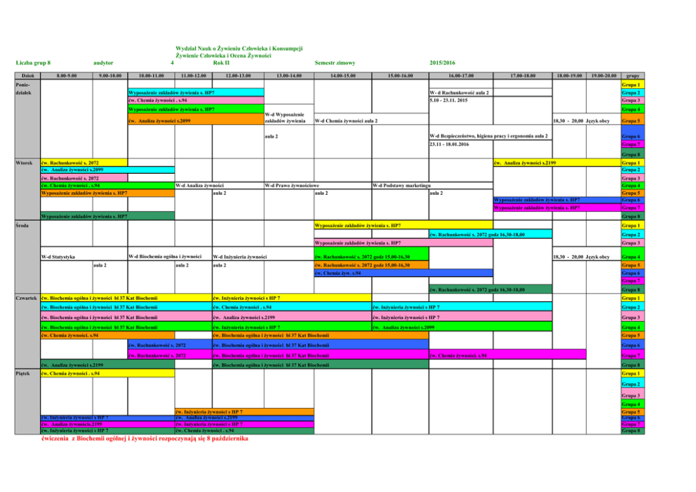 Liczba grup 8 Dzień Wydział Nauk o Żywieniu Człowieka i Konsumpcji Żywienie Człowieka i Ocena Żywności 4 Rok II audytor 8.00-9.00 9.00-10.00 10.00-11.00 11.00-12.00 12.00-13.00 Semestr zimowy 13.00-14.00 2015/2016 14.00-15.00 15.00-16.00 16.00-17.00 17.00-18.00 18.00-19.00 19.00-20.00 Ponie- grupy Grupa 1 działek Wyposażenie zakładów żywienia s. HP7 W- d Rachunkowość aula 2 Grupa 2 ćw. Chemia żywności . s.94 5.10 - 23.11. 2015 Grupa 3 Wyposażenie zakładów żywienia s. HP7 Grupa 4 W-d Wyposażenie zakładów żywienia ćw. Analiza żywności s.2099 W-d Chemia żywności aula 2 aula 2 18,30 - 20,00 Język obcy Grupa 5 W-d Bezpieczeństwo, higiena pracy i ergonomia aula 2 Grupa 6 23.11 - 18.01.2016 Grupa 7 Grupa 8 Wtorek ćw. Rachunkowość s. 2072 ćw. Analiza żywności s.2099 ćw. Analiza żywności s.2199 ćw. Rachunkowość s. 2072 ćw. Chemia żywności . s.94 W-d Analiza żywności Wyposażenie zakładów żywienia s. HP7 W-d Prawo żywnościowe aula 2 Grupa 3 Grupa 4 W-d Podstawy marketingu aula 2 aula 2 Wyposażenie zakładów żywienia s. HP7 Wyposażenie zakładów żywienia s. HP7 Wyposażenie zakładów żywienia s. HP7 Grupa 5 Grupa 6 Grupa 7 Grupa 8 Środa Wyposażenie zakładów żywienia s. HP7 Grupa 1 ćw. Rachunkowość s. 2072 godz 16,30-18,00 Grupa 2 Wyposażenie zakładów żywienia s. HP7 W-d Biochemia ogólna i żywności W-d Statystyka Grupa 1 Grupa 2 aula 2 aula 2 Grupa 3 W-d Inżynieria żywności ćw. Rachunkowość s. 2072 godz 15,00-16,30 aula 2 ćw. Rachunkowość s. 2072 godz 15,00-16,30 Grupa 5 ćw. Chemia żyw. s.94 Grupa 6 18,30 - 20,00 Język obcy Grupa 4 Grupa 7 ćw. Rachunkowość s. 2072 godz 16,30-18,00 Czwartek ćw. Biochemia ogólna i żywności bl 37 Kat Biochemii ćw. Inżynieria żywności s HP 7 Grupa 1 ćw. Biochemia ogólna i żywności bl 37 Kat Biochemii ćw. Chemia żywności . s.94 ćw. Biochemia ogólna i żywności bl 37 Kat Biochemii ćw. Analiza żywności s.2199 ćw. Inżynieria żywności s HP 7 Grupa 3 ćw. Biochemia ogólna i żywności bl 37 Kat Biochemii ćw. Inżynieria żywności s HP 7 ćw. Analiza żywności s.2099 Grupa 4 ćw. Chemia żywności. s.94 ćw. Rachunkowość s. 2072 ćw. Rachunkowość s. 2072 ćw. Analiza żywności s.2199 Piątek Grupa 8 ćw. Inżynieria żywności s HP 7 Grupa 2 ćw. Biochemia ogólna i żywności bl 37 Kat Biochemii Grupa 5 ćw. Biochemia ogólna i żywności bl 37 Kat Biochemii Grupa 6 ćw. Biochemia ogólna i żywności bl 37 Kat Biochemii ćw. Biochemia ogólna i żywności bl 37 Kat Biochemii ćw. Chemia żywności . s.94 ćw. Chemia żywności. s.94 Grupa 7 Grupa 8 Grupa 1 Grupa 2 Grupa 3 ćw. Inżynieria żywności s HP 7 ćw. Analiza żywnościs.2199 ćw. Inżynieria żywności s HP 7 ćw. Inżynieria żywności s HP 7 ćw. Analiza żywności s.2199 ćw. Inżynieria żywności s HP 7 ćw. Chemia żywności . s.94 ćwiczenia z Biochemii ogółnej i żywności rozpoczynają się 8 października Grupa 4 Grupa 5 Grupa 6 Grupa 7 Grupa 8