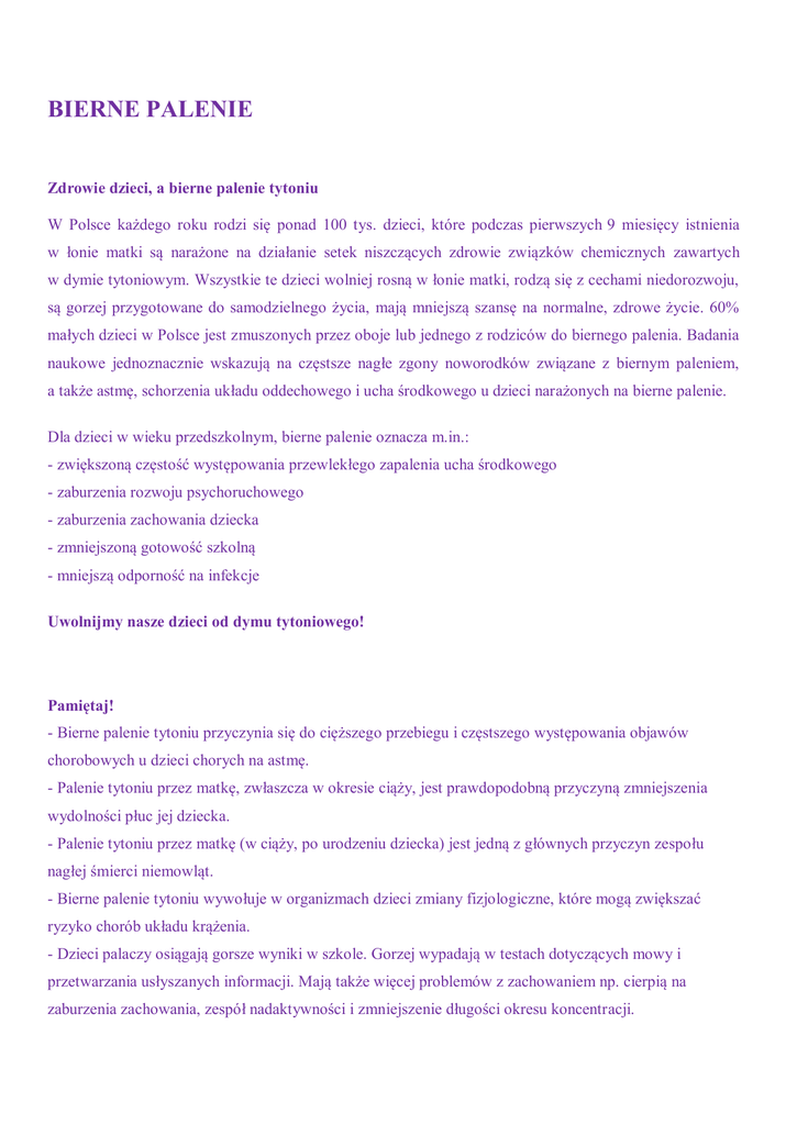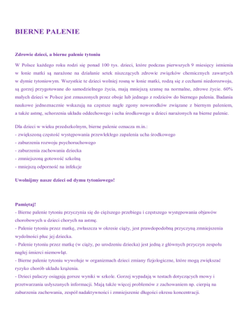 BIERNE PALENIE Zdrowie dzieci, a bierne palenie tytoniu W Polsce każdego roku rodzi się ponad 100 tys. dzieci, które podczas pierwszych 9 miesięcy istnienia w łonie matki są narażone na działanie setek niszczących zdrowie związków chemicznych zawartych w dymie tytoniowym. Wszystkie te dzieci wolniej rosną w łonie matki, rodzą się z cechami niedorozwoju, są gorzej przygotowane do samodzielnego życia, mają mniejszą szansę na normalne, zdrowe życie. 60% małych dzieci w Polsce jest zmuszonych przez oboje lub jednego z rodziców do biernego palenia. Badania naukowe jednoznacznie wskazują na częstsze nagłe zgony noworodków związane z biernym paleniem, a także astmę, schorzenia układu oddechowego i ucha środkowego u dzieci narażonych na bierne palenie. Dla dzieci w wieku przedszkolnym, bierne palenie oznacza m.in.: - zwiększoną częstość występowania przewlekłego zapalenia ucha środkowego - zaburzenia rozwoju psychoruchowego - zaburzenia zachowania dziecka - zmniejszoną gotowość szkolną - mniejszą odporność na infekcje Uwolnijmy nasze dzieci od dymu tytoniowego! Pamiętaj! - Bierne palenie tytoniu przyczynia się do cięższego przebiegu i częstszego występowania objawów chorobowych u dzieci chorych na astmę. - Palenie tytoniu przez matkę, zwłaszcza w okresie ciąży, jest prawdopodobną przyczyną zmniejszenia wydolności płuc jej dziecka. - Palenie tytoniu przez matkę (w ciąży, po urodzeniu dziecka) jest jedną z głównych przyczyn zespołu nagłej śmierci niemowląt. - Bierne palenie tytoniu wywołuje w organizmach dzieci zmiany fizjologiczne, które mogą zwiększać ryzyko chorób układu krążenia. - Dzieci palaczy osiągają gorsze wyniki w szkole. Gorzej wypadają w testach dotyczących mowy i przetwarzania usłyszanych informacji. Mają także więcej problemów z zachowaniem np. cierpią na zaburzenia zachowania, zespół nadaktywności i zmniejszenie długości okresu koncentracji. Dzieci mieszkające z osobami palącymi charakteryzuje 3-krotnie większe ryzyko stania się w przyszłości palaczami. Mieszkanie z osobami, które palą ma kluczowy wpływ na przyszłą postawę w stosunku do palenia u dzieci. Rodzice, dziadkowie i starsze rodzeństwo muszą zdawać sobie sprawę ze swojej roli w tej kwestii. Szczególnie matki, które same nie palą, dają swoim dzieciom najlepszą ochronę przed inicjacją tytoniową poprzez swoje poglądy dezaprobujące palenie. - Dzieci, które palą papierosy, zwykle wskazują jako przyczynę palących domowników. - Dzieci, które nigdy nie paliły, najczęściej twierdzą, że stało się tak dlatego, że ich rodzina i przyjaciele nie palą. - Dzieci, które palą, mimo, że nikt w ich domu nie pali, zwykle wskazują, że rodzice nie wiedzą o ich eksperymentach z papierosami. - Tylko 30% niepalących dzieci mieszkających z osobami niepalącymi dopuszcza możliwość spróbowania papierosów w przyszłości. - Młodzież pochodząca z palących rodzin jest mniej skłonna uwierzyć, że palenie rzeczywiście szkodzi zdrowiu. Rodzice mają wpływ na poglądy dzieci do 12-14 roku życia. Starsze dzieci stają się mniej otwarte na treści przekazywane w domu. Dlatego bardzo ważne jest, aby rodzice nauczyli dzieci właściwej postawy w stosunku do palenia w odpowiednim czasie. Apel do rodziców: Chrońcie swoje dzieci przed wdychaniem dymu tytoniowego z otoczenia, zanieczyszczonego przez dorosłych palaczy. Życie w środowisku wolnym od dymu tytoniowego ma kluczowe znaczenie dla zdrowia dzieci. Nie pal przy mnie, proszę! Źródło: Centrum Onkologii – Instytut w Warszawie