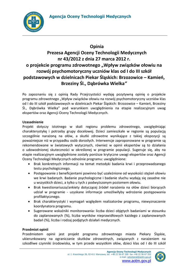 Opinia Prezesa Agencji Oceny Technologii Medycznych nr 43/2012