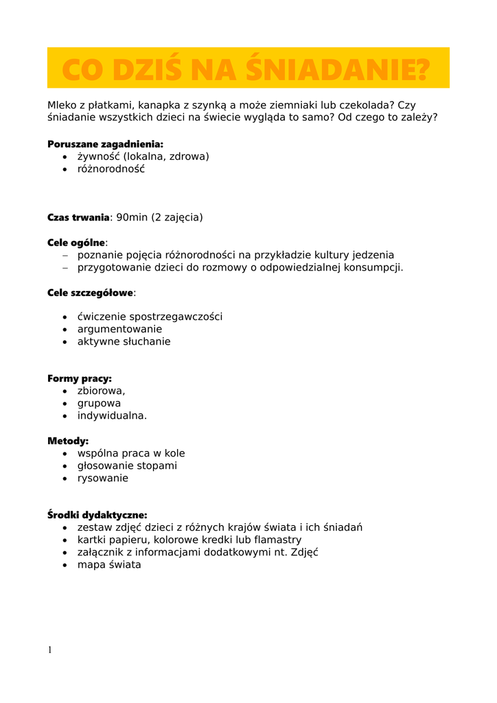 CO DZIŚ NA ŚNIADANIE? Mleko z płatkami, kanapka z szynką a może ziemniaki lub czekolada? Czy śniadanie wszystkich dzieci na świecie wygląda to samo? Od czego to zależy? Poruszane zagadnienia: żywność (lokalna, zdrowa) różnorodność ść Czas trwania: 90min (2 zajęcia) Cele ogólne: poznanie pojęcia różnorodności na przykładzie kultury jedzenia przygotowanie dzieci do rozmowy o odpowiedzialnej konsumpcji. Cele szczegółowe: ćwiczenie spostrzegawczości argumentowanie aktywne słuchanie Formy pracy: zbiorowa, grupowa indywidualna. Metody: wspólna praca w kole głosowanie stopami rysowanie Środki dydaktyczne: zestaw zdjęć dzieci z różnych krajów świata i ich śniadań kartki papieru, kolorowe kredki lub flamastry załącznik z informacjami dodatkowymi nt. Zdjęć mapa świata 1 Przebieg: 1. część pierwsza Usiądźcie w kole. Zapytaj dzieci co lubią jeść na śniadanie. Czy to ważny posiłek? Dlaczego? Poproś, by każde dziecko indywidualnie narysowało na kartce swoje ulubione śniadanie. Zachęć, żeby użyły kolorowych kredek i pokolorowały składniki, narysowały swoje ulubione naczynia ( jeśli takie mają). 2. Kiedy rysunki są już gotowe poproś, żeby dzieci po kolei opowiedziały o swoich śniadaniach pokazując rysunki. Daj innym dzieciom możliwość dopytywania opowiadającego dziecka. Przypominaj wszystkim o potrzebie aktywnego słuchania się nawzajem. 3. Kartki z rysunkami układajcie na podłodze tak, żeby wszyscy je widzieli. Zapytaj dzieci o ich wrażenia, komentarze. Możesz pomóc im pytaniami np. Czy wszyscy lubią to samo? Tak, nie, dlaczego? Czy jakiś składnik można wykorzystać do różnych śniadań? 4. Zapytaj Czy wiemy skąd pochodzą produkty, z których powstały wasze śniadania? Z jakiego kraju? Skąd się wzięły w waszym domu? Gdzie były wcześniej? Jak to można sprawdzić? 5. Poproś, by dzieci spróbowały pogrupować śniadania, które są takie same lub podobne (pod względem składników) np. kanapki, mleko z płatkami). Możesz im w tym pomóc. Zapowiedz, że będziecie głosować stopami. Ty przeczytasz im stwierdzenie, a one podejdą do kartek z rysunkami śniadań, które wybiorą jako swoją odpowiedź. - to śniadanie jest najzdrowsze - tego śniadania nigdy nie próbowałem/am - to śniadanie chciałbym/abym spróbować - to śniadanie jest najsmaczniejsze Po każdym stwierdzeniu poproś chętne dzieci stojące przy różnych pracach o komentarze. W razie potrzeby uzupełniaj informacje, zwłaszcza dotyczące zdrowego odżywiania. 6. Na koniec pierwszej części zajęć zapytaj dzieci (rundka zaczynając od chętnego dziecka) o jedną rzecz, którą zapamiętały z zajęć. 7. CZĘŚĆ DRUGA: Przypomnij dzieciom krótko co robiliście w części pierwszej zajęć. Możesz rozwiesić prace uczestników na ścianie, żeby można się było do nich odwoływać. 8. Podziel dzieci na pary lub niewielkie grupy (jeśli dzieci jest więcej niż 20) każdej parze/grupie rozdaj zdjęcie dziecka z zestawu. Poproś, by przez chwilę porozmawiali i zastanowili się skąd pochodzą dzieci i spróbowały umieścić ich zdjęcia na mapie świata. Pokaż dzieciom, gdzie znajduje się Polska, nazwij kontynenty, żeby ułatwić im zadanie. 9. Na podłodze rozłóż zdjęcia śniadań dzieci i zachęć dzieci do znalezienia śniadania dla „swojego”dziecka. Daj im chwilę na rozmowę, a następnie poproś każdą grupę o wskazanie kraju pochodzenia dzieci na dużej mapie. Zweryfikuj ich przypuszczenia w oparciu o załącznik z informacjami dodatkowymi nt. zdjęć. Skąd się wzięły produkty na talerzach dzieci? Gdzie były wcześniej? Z jakiego kraju pochodzą? Skąd to 2 wiemy? Jeśli w przypadku polskich śniadań okazało się, że niektóre z produktów pochodzą z innych krajów warto poruszyć ten sam wątek przy okazji śniadań dzieci z całego świata. 10. Ponownie zaproponuj dzieciom głosowanie stopami: - to śniadanie jest najzdrowsze - to śniadanie chciałbym/abym spróbować - to śniadanie ciężko byłoby mi skończyć - to śniadanie można przygotować w moim domu Po każdym stwierdzeniu poproś chętne dzieci o uargumentowanie swoich opinii. Daj innym dzieciom możliwość skomentowania ich wypowiedzi lub zmiany miejsca, jeśli argumenty ich przekonały. 11. Zaproś dzieci do rozmowy w kole. Zapytaj dlaczego dzieci w różnych miejscach na świecie jedzą różne potrawy na śniadanie? Od czego to zależy? Czy wszystkie śniadania moglibyśmy przygotować w naszych domach? Dlaczego? Czy to dobrze, że się od siebie różnimy? Czego dzięki takim różnicom możemy się nauczyć? 12. Podsumuj zajęcia rundką z odpowiedzią na pytanie : Czego dowiedziałam/em się podczas dzisiejszych zajęć. 3 Materiał powstał w ramach projektu „Zrozum świat – przedszkola” (ang. World from Our Doorstep) współfinansowanego przez Komisję Europejską oraz projektu „Bliżej świata” współfinansowanego w ramach programu polskiej współpracy rozwojowej Ministerstwa Spraw Zagranicznych RP w 2014 r. Materiał jest dostępny na licencji Creative Commons Uznanie autorstwa 3.0 Polska. Pewne prawa zastrzeżone na rzecz Instytutu Globalnej Odpowiedzialności i partnerów. Zezwala się na dowolne wykorzystanie utworu, pod warunkiem zachowania ww. informacji, w tym informacji o stosowanej licencji, o posiadaczach praw oraz o programie polskiej współpracy rozwojowej. Materiał wyraża wyłącznie poglądy autora i nie może być utożsamiany z oficjalnym stanowiskiem Ministerstwa Spraw Zagranicznych RP. 4