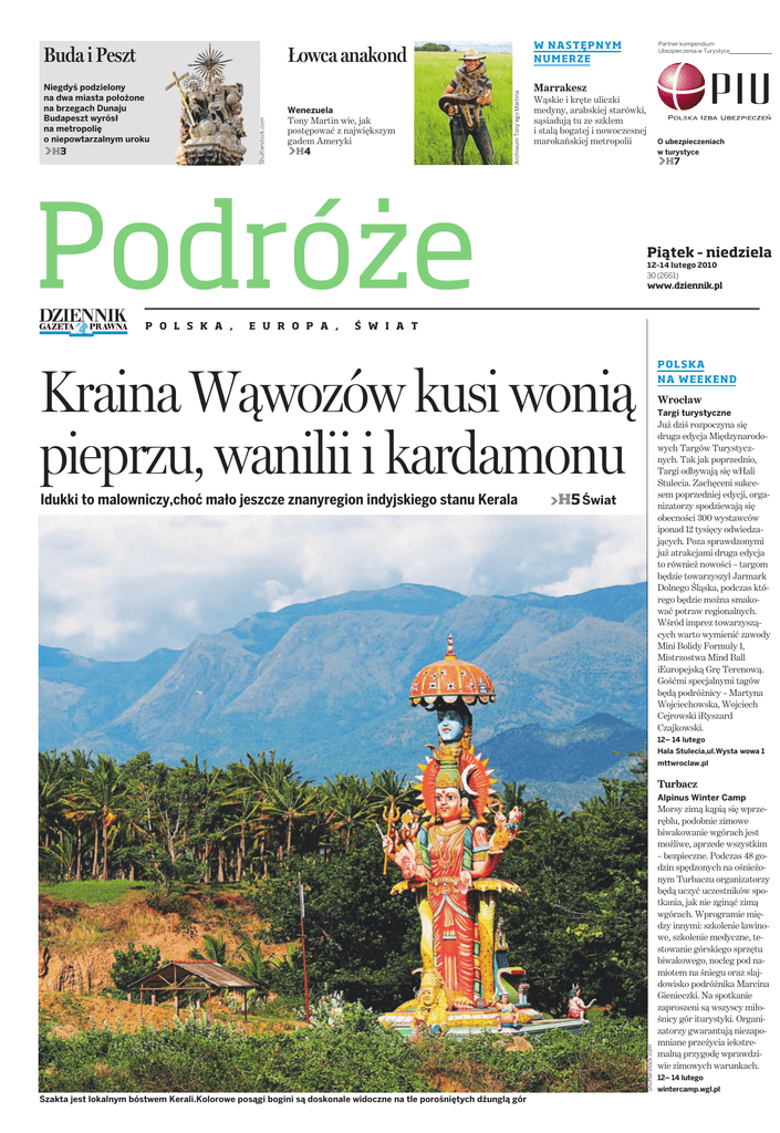 W NASTĘPNYM NUMERZE Łowca anakond >H3 Wenezuela Shutterstock.com Niegdyś podzielony na dwa miasta położone na brzegach Dunaju Budapeszt wyrósł na metropolię o niepowtarzalnym uroku Tony Martin wie, jak postępować z największym gadem Ameryki >H4 Archiwum Tony’ego Martina Buda i Peszt Marrakesz Wąskie i kręte uliczki medyny, arabskiej starówki, sąsiadują tu ze szkłem i stalą bogatej i nowoczesnej marokańskiej metropolii E U R O P A , O ubezpieczeniach w turystyce >H7 Podróże P O L S K A , Partner kompendium Ubezpieczenia w Turystyce Piątek – niedziela 12–14 lutego 2010 30 (2661) www.dziennik.pl Ś W I A T Kraina Wąwozów kusi wonią pieprzu, wanilii i kardamonu Idukki to malowniczy,choć mało jeszcze znanyregion indyjskiego stanu Kerala POLSKA NA WEEKEND Wrocław Targi turystyczne Już dziś rozpoczyna się druga edycja Międzynarodowych Targów Turystycznych. Tak jak poprzednio, Targi odbywają się wHali Stulecia. Zachęceni sukcesem poprzedniej edycji, organizatorzy spodziewają się obecności 300 wystawców iponad 12 tysięcy odwiedzających. Poza sprawdzonymi już atrakcjami druga edycja to również nowości – targom będzie towarzyszył Jarmark Dolnego Śląska, podczas którego będzie można smakować potraw regionalnych. Wśród imprez towarzyszących warto wymienić zawody Mini Bolidy Formuły 1, Mistrzostwa Mind Ball iEuropejską Grę Terenową. Gośćmi specjalnymi tagów będą podróżnicy – Martyna Wojciechowska, Wojciech Cejrowski iRyszard Czajkowski. >H5 Świat 12– 14 lutego Hala Stulecia,ul.Wysta wowa 1 mttwroclaw.pl Turbacz Shutterstock.com Alpinus Winter Camp Szakta jest lokalnym bóstwem Kerali.Kolorowe posągi bogini są doskonale widoczne na tle porośniętych dżunglą gór Morsy zimą kąpią się wprzeręblu, podobnie zimowe biwakowanie wgórach jest możliwe, aprzede wszystkim – bezpieczne. Podczas 48 godzin spędzonych na ośnieżonym Turbaczu organizatorzy będą uczyć uczestników spotkania, jak nie zginąć zimą wgórach. Wprogramie między innymi: szkolenie lawinowe, szkolenie medyczne, testowanie górskiego sprzętu biwakowego, nocleg pod namiotem na śniegu oraz slajdowisko podróżnika Marcina Gienieczki. Na spotkanie zaproszeni są wszyscy miłośnicy gór iturystyki. Organizatorzy gwarantują niezapomniane przeżycia iekstremalną przygodę wprawdziwie zimowych warunkach. 12– 14 lutego wintercamp.wgl.pl