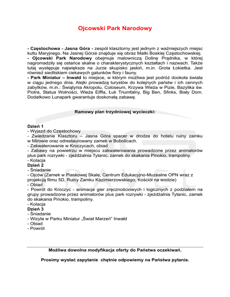 Ojcowski Park Narodowy - Częstochowa - Jasna Góra - zespół klasztorny jest jednym z ważniejszych miejsc kultu Maryjnego. Na Jasnej Górze znajduje się obraz Matki Boskiej Częstochowskiej. - Ojcowski Park Narodowy obejmuje malowniczą Dolinę Prądnika, w której nagromadziły się ostańce skalne o charakterystycznych kształtach i nazwach. Także tutaj występuje największe na Jurze skupisko jaskiń, m.in. Grota Łokietka. Jest również siedliskiem ciekawych gatunków flory i fauny. - Park Miniatur – Inwałd to miejsce, w którym możliwa jest podróż dookoła świata w ciągu jednego dnia. Alejki prowadzą turystów do kolejnych państw i ich cennych zabytków, m.in.: Świątynia Akropolu, Coloseum, Krzywa Wieża w Pizie, Bazylika św. Piotra, Statua Wolności, Wieża Eiffla, Łuk Triumfalny, Big Ben, Sfinks, Biały Dom. Dodatkowo Lunapark gwarantuje doskonałą zabawę. Ramowy plan trzydniowej wycieczki: Dzień 1 - Wyjazd do Częstochowy - Zwiedzanie Klasztoru – Jasna Góra spacer w drodze do hotelu ruiny zamku w Mirowie oraz odrestaurowany zamek w Bobolicach. - Zakwaterowanie w Kroczycach, obiad - Zabawy na powietrzu w miejscu zakwaterowania prowadzone przez animatorów plus park rozrywki - zjeżdżalnia Tytanic, zamek do skakania Pinokio, trampoliny. - Kolacja Dzień 2 - Śniadanie - Ojców (Zamek w Piaskowej Skale, Centrum Edukacyjno-Muzealne OPN wraz z projekcją filmu 5D, Ruiny Zamku Kazimierzowskiego, Kościół na wodzie) - Obiad - Powrót do Kroczyc - animacje gier zręcznościowych i logicznych z podziałem na grupy prowadzone przez animatorów plus park rozrywki - zjeżdżalnia Tytanic, zamek do skakania Pinokio, trampoliny. - Kolacja Dzień 3 - Śniadanie - Wizyta w Parku Miniatur „Świat Marzeń” Inwałd - Obiad - Powrót Możliwa dowolna modyfikacja oferty do Państwa oczekiwań. Prosimy wysłać zapytanie chętnie odpowiemy na Państwa pytania.