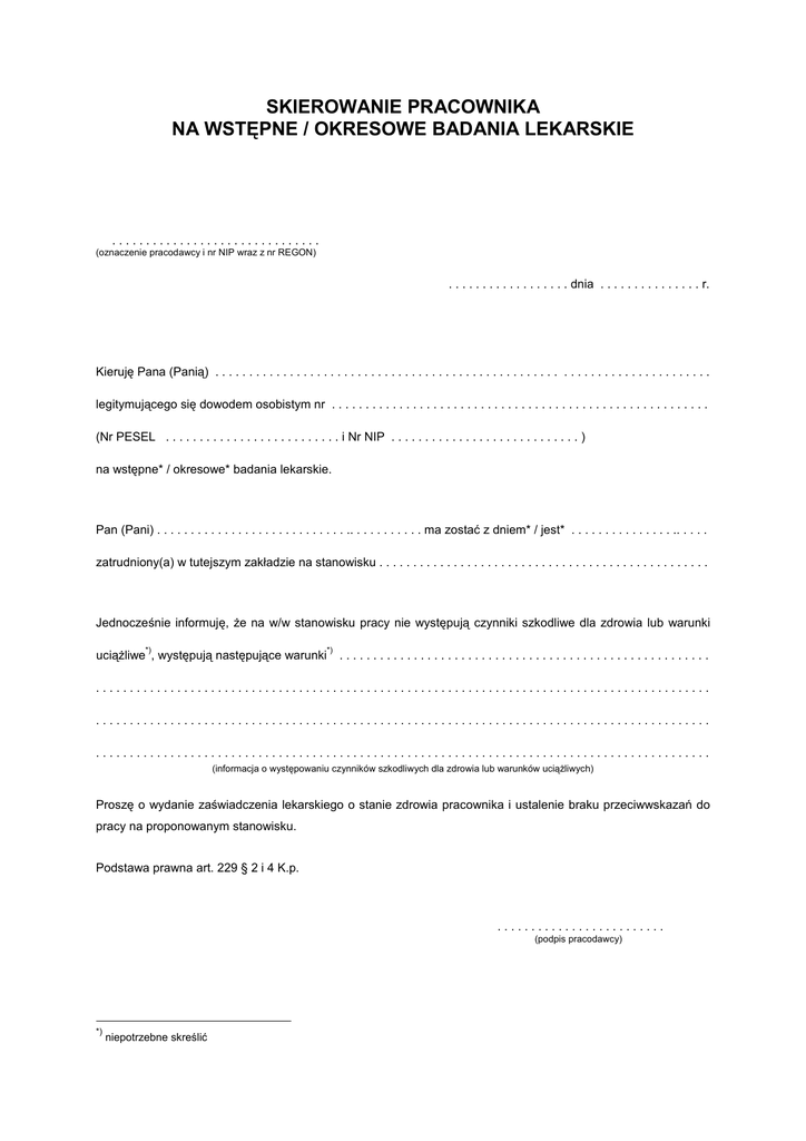 SKIEROWANIE PRACOWNIKA NA WSTĘPNE / OKRESOWE BADANIA LEKARSKIE ............................... (oznaczenie pracodawcy i nr NIP wraz z nr REGON) . . . . . . . . . . . . . . . . . . dnia . . . . . . . . . . . . . . . r. Kieruję Pana (Panią) . . . . . . . . . . . . . . . . . . . . . . . . . . . . . . . . . . . . . . . . . . . . . . . . . . . . . . . . . . . . . . . . . . . . . . . . . legitymującego się dowodem osobistym nr . . . . . . . . . . . . . . . . . . . . . . . . . . . . . . . . . . . . . . . . . . . . . . . . . . . . . . . . (Nr PESEL . . . . . . . . . . . . . . . . . . . . . . . . . . i Nr NIP . . . . . . . . . . . . . . . . . . . . . . . . . . . . ) na wstępne* / okresowe* badania lekarskie. Pan (Pani) . . . . . . . . . . . . . . . . . . . . . . . . . . . . .. . . . . . . . . . . ma zostać z dniem* / jest* . . . . . . . . . . . . . . . .. . . . . zatrudniony(a) w tutejszym zakładzie na stanowisku . . . . . . . . . . . . . . . . . . . . . . . . . . . . . . . . . . . . . . . . . . . . . . . . . Jednocześnie informuję, Ŝe na w/w stanowisku pracy nie występują czynniki szkodliwe dla zdrowia lub warunki *) uciąŜliwe , występują następujące warunki *) ....................................................... ........................................................................................... ........................................................................................... ........................................................................................... (informacja o występowaniu czynników szkodliwych dla zdrowia lub warunków uciąŜliwych) Proszę o wydanie zaświadczenia lekarskiego o stanie zdrowia pracownika i ustalenie braku przeciwwskazań do pracy na proponowanym stanowisku. Podstawa prawna art. 229 § 2 i 4 K.p. ......................... (podpis pracodawcy) *) niepotrzebne skreślić