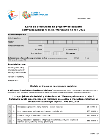..................................................................... (miejscowość, data) Karta do głosowania na projekty do budżetu partycypacyjnego w m.st. Warszawie na rok 2016 Dane obowiązkowe: Imię i nazwisko PESEL1) Adres zamieszkania ulica Nr domu Kod pocztowy Nr mieszkania - Warszawa Załączam zgodę opiekuna prawnego z dnia ……………………………… tak nie (dotyczy osób małoletnich) Dane fakultatywne: Nr hologramu Karty Warszawiaka / Karty Młodego Warszawiaka Telefon kontaktowy Adres e-mail Oddaję swój głos na następujące projekty: A. W kategorii „projekty o charakterze lokalnym” (pole wielokrotnego wyboru - całkowity koszt wszystkich wybranych projektów nie może przekraczać kwoty przeznaczone na realizację projektów o charakterze lokalnym w obszarze terytorialnym) Lista projektów dla Dzielnicy Mokotów m.st. Warszawy dla obszaru rejon C Całkowita kwota przeznaczona na realizację projektów o charakterze lokalnym w obszarze terytorialnym wynosi 1 075 960,00 zł □ 1. Nowoczesna pracownia komputerowa - oknem na świat 86 450,00 zł □ 2. Pasy rowerowe na Idzikowskiego i remont chodnika też. 135 000,00 zł □ 3. REWITALIZACJA SKWERU MAŁKOWSKICH 150 000,00 zł □ 4. Nowy plac zabaw - sposób na integrację mieszkańców, aktywne spędzanie wolnego czasu, zabawę, naukę, gimnastykę 165 000,00 zł Strona 1 / 4 □ 5. OCHRONA PTAKÓW GNIAZDUJĄCYCH W SKRZYNKACH W PARKACH MOKOTOWSKIEJ SKARPY 650,00 zł □ 6. Rozbudowa bazy sportowej w Gimnazjum nr 1 ul. Tyniecka 25 296 430,00 zł □ 7. Warsztaty na Domaniewskiej - „Rozbudzamy ciekawość, rozwijamy zainteresowania" 78 320,00 zł □ 8. Zadbane podwórka - zieleń, ławki, kosze 88 300,00 zł □ 9. Maluch 3.0 28 570,00 zł □ 10. URZĄDZENIE SKWERU WIERZBNO 154 000,00 zł □ 11. Biblioteka dla dzieci na ulicy Domaniewskiej. 2 150,00 zł □ 12. Może-My? Zrobić ładnie! Na Marzanny 85 000,00 zł □ 13. Remont boisk koszykarskich przy Metrze Wilanowska - graj bądź kibicuj w bezpiecznym otoczeniu 500 000,00 zł □ 14. Mokotowskie Śniadania na Trawie 13 400,00 zł □ 15. Od zabawy do Olimpiady - Zajęcia łucznicze dla małych i dużych. 30 160,00 zł □ 16. FUTBOLOWE GWIAZDY 3 780,00 zł □ 17. Latarnie na podwórkach - jaśniej i bezpieczniej na Mokotowie 87 000,00 zł □ 18. Komputer w szkole 3 024,00 zł □ 19. WSPIERAMY MAMY - Remont schodów z uwzględnieniem podjazdu dla wózków 20 000,00 zł □ 20. Modernizacja pracowni komputerowej 68 000,00 zł □ 21. Ulice wygodne dla rowerów 33 530,00 zł □ 22. Mały badacz – zajęcia dla dzieci prowadzone metodą projektów edukacyjnych 63 600,00 zł □ 23. SPółka z książkami, czyli opowiedz swoją historię! Warsztaty kreatywnego pisania/rysowania w bibliotece na Tynieckiej 113 000,00 zł □ 24. Bezpłatne zajęcia pozalekcyjne z inteligencji finansowej dla dzieci ze szkół podstawowych na Mokotowie (rejon C) 24 500,00 zł □ 25. Przedszkole nr 28 - renowacja ogrodu-placu zabaw 115 853,70 zł □ 26. Nowości w bibliotece ul. Żuławskiego 4/6 10 450,00 zł □ 27. Nowoczesność i profesjonalizm w naszych rękach 18 560,00 zł □ 28. Laboratorium Biol-Chem-Fiz 340 000,00 zł □ 29. Zapobieganie bezdomności zwierząt w mieście. 1 800,00 zł Strona 2 / 4 □ 30. Modernizacja ogrodu przedszkolnego w Przedszkolu Nr 138 242 700,00 zł □ 31. Wielofunkcyjne boisko sportowe " Królówka" 320 000,00 zł □ 32. Spokojne i bezpieczne ulice Mokotowa dla pieszych i rowerzystów 117 500,00 zł □ 33. Modernizacja Przedszkola nr 170 w Warszawie 165 000,00 zł □ 34. Wymiana nawierzchni chodnika 52 800,00 zł □ 35. Najkrótsza ścieżka rowerowa świata: łącznik Wielicka-Domaniewska 18 500,00 zł □ 36. Modernizacja biblioteki i czytelni 18 000,00 zł □ 37. Skwer Metro Wierzbno 280 000,00 zł □ 38. Budowa parkingu i chodnika przed kościołem NMP Matki Zbawiciela 31 700,00 zł □ 39. Pracownia multimedialna języka francuskiego przy ul. Domaniewskiej. 71 106,00 zł □ 40. Sensoryczny ogród malucha - plac zabaw dla dzieci do lat 3 230 290,00 zł □ 41. Klub Gier Planszowych "Weekend na Planszą" 16 284,00 zł □ 42. „Guzik z pętelką – książki skrojone na miarę malucha” 36 668,00 zł □ 43. Pracownia multimedialna języka angielskiego przy ul. Domaniewskiej 73 256,00 zł □ 44. Remont sali gimnastycznej Gimnazjum nr 1 224 340,00 zł □ 45. Nowości wydawnicze dla mokotowskiej biblioteki (w tym 3 wypożyczalnie) usytuowanej przy Al. Niepodległości 19 30 000,00 zł □ 46. Remont chodnika przed wejściem do Szkoły Podstawowej nr 33 przy ul. Cieszyńskiej 72 500,00 zł □ 47. Z nauką, kulturą i zdrowiem 504 407,00 zł □ 48. Nowości wydawnicze oraz wymiana sprzętu komputerowego dla Wypożyczalni nr 63, Warszawa Mokotów ul. Bytnara "Rudego" 27 24 166,16 zł □ 49. PRZEDSZKOLAKI NIE ŚLIMAKI – budowa toru rowerowego 45 000,00 zł □ 50. Modernizacja sali komputerowej dla przedmiotów ogólnokształcących w Gimnazjum nr 1 79 082,00 zł Wybrałam(/-łem) projekt(y/-ów) o charakterze lokalnym, (liczba słownie) których łączny koszt realizacji wynosi zł (kwota liczbowa) Na podstawie art. 7 pkt 5 ustawy z dnia 29 sierpnia 1997 r. o ochronie danych osobowych (Dz. U. z 2014 r. poz. 1182), Strona 3 / 4 wyrażam zgodę na przetwarzanie moich danych osobowych przez Prezydenta m.st. Warszawy w celu realizacji budżetu partycypacyjnego w m.st. Warszawie na rok 20162). Oświadczam, iż wszystkie informacje podane w formularzu, w tym o zamieszkiwaniu na terenie m.st. Warszawy, są zgodne z aktualnym stanem faktycznym. Oświadczam także, iż zapoznałem się z treścią zarządzenia nr 6699/2014 Prezydenta Miasta Stołecznego Warszawy z dnia 16 października 2014 r. w sprawie konsultacji społecznych z mieszkańcami Miasta Stołecznego Warszawy w zakresie budżetu partycypacyjnego na rok 2016. Jestem świadomy(-ma) możliwości weryfikacji zamieszczonych przeze mnie danych na podstawie dost