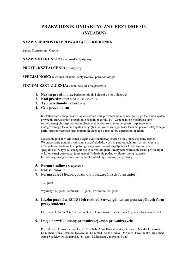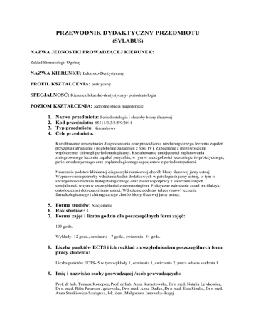 PRZEWODNIK DYDAKTYCZNY PRZEDMIOTU (SYLABUS) NAZWA JEDNOSTKI PROWADZĄCEJ KIERUNEK: Zakład Stomatologii Ogólnej NAZWA KIERUNKU: Lekarsko-Dentystyczny PROFIL KSZTAŁCENIA: praktyczny SPECJALNOŚĆ: Kierunek lekarsko-dentystyczny- periodontologia POZIOM KSZTAŁCENIA: Jednolite studia magisterskie 1. 2. 3. 4. Nazwa przedmiotu: Periodontologia i choroby błony śluzowej Kod przedmiotu: 85511/3/3/3/5/9/2014 Typ przedmiotu: Kierunkowy Cele przedmiotu: Kształtowanie umiejętności diagnozowania oraz prowadzenia niechirurgicznego leczenia zapaleń przyzębia (utrwalenie i pogłębienie zagadnień z roku IV). Zapoznanie z możliwościami współczesnej chirurgii periodontologicznej. Kształtowanie umiejętności zaplanowania zintegrowanego leczenia zapaleń przyzębia, w tym w szczególności leczenia perio-protetycznego, perio-ortodontycznego oraz implantologicznego u pacjentów z periodontopatiami. Nauczanie podstaw klinicznej diagnostyki różnicowej chorób błony śluzowej jamy ustnej. Wypracowanie potrzeby wdrażania badań dodatkowych w patologiach jamy ustnej, w tym w szczególności badania histopatologicznego oraz zasad współpracy z lekarzami innych specjalności, w tym w szczególności z dermatologiem. Praktyczne wdrożenie zasad profilaktyki onkologicznej dotyczącej jamy ustnej. Wdrożenie podstaw (algorytmów) leczenia farmakologicznego i chirurgicznego chorób błony śluzowej jamy ustnej. 5. Forma studiów: Stacjonarne 6. Rok studiów: 5 7. Forma zajęć i liczba godzin dla poszczególnych form zajęć: 103 godz. Wykłady- 12 godz., seminaria - 7 godz., ćwiczenia- 84 godz. 8. Liczba punktów ECTS i ich rozkład z uwzględnieniem poszczególnych form pracy studenta: Liczba punktów ECTS- 5 w tym wykłady 1, seminaria 1, ćwiczenia 2, praca własna studenta 1 9. Imię i nazwisko osoby prowadzącej /osób prowadzących: Prof. dr hab. Tomasz Konopka, Prof. dr hab. Anna Kurnatowska, Dr n med. Natalia Lewkowicz, Dr n. med. Róża Peterson-Jęckowska, Dr n med. Anna Dudko, Dr n med. Ewa Sieńko, Dr n med. Anna Stankiewicz-Szałapska, lek. dent. Małgorzata Janowska-Bugaj 10. Wymagania wstępne: Ukończenie periodontologii przedklinicznej oraz periodontologii z roku IV a także dermatologii z roku III 11. Metody dydaktyczne: Wykłady z prezentacjami multimedialnymi, seminaria z dyskusją interaktywną i omawianiem przypadków klinicznych chorób błony śluzowej jamy ustnej, ćwiczenia praktyczne z pacjentami w sali ambulatoryjnej i chirurgicznej 12. Treści programowe przedmiotu: Tematyka wykładów: 1. Mechanizmy obronne w jamie ustnej. Badania podstawowe i dodatkowe w chorobach błony śluzowej jamy ustnej. Formułowanie diagnozy wstępnej i ostaecznej w patologiach jamy ustnej. Badania cytologiczne i histopatologiczne błony śluzowej jamy ustnej- wskazania i przeciwwskazania. 2. Zmiany chorobowe na skórze twarzy i na wargach. 3. Wykwity chorobowe białe, czerwone i czerwono-białe na błonie śluzowej jamy ustnej. 4. Zmiany na błonie śluzowej policzków i przedsionka jamy ustnej. 5. Zmiany chorobowe występujące na podniebieniu. 6. Zmiany chorobowe dziąsła i bezzębnego wyrostka zębodołowego. 7. Zmiany chorobowe występujące na języku. 8. Zmiany chorobowe występujące w dnie jamy ustnej. 9. Zmiany i stany przednowotworowe oraz rak błony śluzowej jamy ustnej- obrazy kliniczne i histopatologiczne. 10. Profilaktyka onkologiczna dotycząca jamy ustnej oraz zasady postępowania lekarza pierwszego kontaktu i błędy popełniane w diagnostyce nowotworów jamy ustnej. Minimalna interwencja antynikotynowa. 11. Alergie i ich symptomatologia w jamie ustnej. 12. Leczenie farmakologiczne i chirurgiczne najczęstszych chorób błony śluzowej jamy ustnej. Tematyka seminariów: S1. Budowa i fizjologia błony śluzowej jamy ustnej. Wykwity pierwotne i wtórne – specyfika zmian w jamie ustnej. S2. Choroby infekcyjne – grzybicze, wirusowe i bakteryjne. S3. Aftozy i ich leczenie. Zmiany wrzodziejące – diagnostyka różnicowa. Stomatopatie protetyczne i reakcje alergiczne w rejonie jamy ustnej i twarzy. Zespól pieczenia jamy ustnej. S4. Symptomatologia dermatoz i chorób ogólnych na błonach śluzowych jamy ustnej. Pacjent z obniżoną odpornością – zmiany w jamie ustnej. S5. Choroby typowe dla warg i języka. Choroby związane z zaburzeniami wydzielania śliny. Zmiany barwnikowe w jamie ustnej. S6. Zaburzenie rogowacenia nabłonka w jamie ustnej. Zmiany i stany przednowotworowe w jamie ustnej – diagnostyka kliniczna i histopatologiczna. S7. Leczenie farmakologiczne i chirurgiczne chorób błony śluzowej jamy ustnej. Tematyka zajęć klinicznych: przyjmowanie pacjentów z periodontopatiami i chorobami błony śluzowej jamy ustnej (diagnostyka, leczenie niechirurgiczne, planowanie leczenia kompleksowego), asysta w zabiegach chirurgicznych dotyczących przyzębia oraz chorób błony śluzowej jamy ustnej. 13. Efekty kształcenia: Wiedza: Po zakończonym kursie student: - zna etiologię, czynniki ryzyka oraz profilaktykę chorób przyzębia, - zna zasady diagnostyki chorób przyzębia, - charakteryzuje wpływ chorób ogólnych na jamę ustną oraz wpływ zapaleń przyzębia na zdrowie ogólne, - zna wszystkie protokoły niechirurgicznego leczenia zapalen przyzebia, - zna wskazania i metody chirurgicznego leczenia periodontologicznego, - zna możliwości i ograniczenia leczenia perio-protetycznego oraz perio-ortodontycznego, - zna zasady diagnostyki klinicznej najczęstszych chorób błony śluzowej jamy ustnej, - zna zasady profilaktyki onkologicznej w odniesieniu do jamy ustnej, - zna zasady farmakoterapii periodontopatii i chorób błony śluzowej jamy ustnej. Umiejętności: Po zakończonym kursie student potrafii: - prowadzić badanie i dokumentację periodontologiczną pacjenta, - diagnozować periodontopatie i patologie okołowszczepowe, - prowadzić profesjonalną i zindywidualizowną pierwotną i wtórną profilaktykę periodontologiczną, - leczyć niechirurgiczn