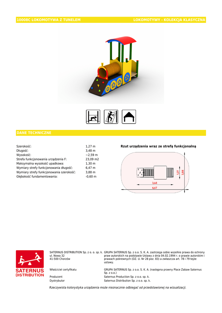 10008C LOKOMOTYWA Z TUNELEM LOKOMOTYWY - KOLEKCJA KLASYCZNA DANE TECHNICZNE Szerokość: Długość: Wysokość: Strefa funkcjonowania urządzenia F: Maksymalna wysokość upadkowa: Wymiary strefy funkcjonowania długość: Wymiary strefy funkcjonowania szerokość: Głębokość fundamentowania: 1,27 m 3,48 m ~2,59 m 23,09 m2 1,30 m 6,47 m 3,88 m -0,60 m Rzut urządzenia wraz ze strefą funkcjonalną SATERNUS DISTRIBUTION Sp. z o. o. sp. k. GRUPA SATERNUS Sp. z o.o. S. K. A. zastrzega sobie wszelkie prawa do ochrony ul. Nowa 32 praw autorskich na podstawie Ustawy z dnia 04.02.1994 r. o prawie autorskim i 41-500 Chorzów prawach pokrewnych (DZ. U. Nr 28 poz. 83) a zwłaszcza art. 78 i 79 tejże ustawy. Właściciel certyfikatu Producent Dystrybutor GRUPA SATERNUS Sp. z o.o. S. K. A. (następna prawny Place Zabaw Saternus Sp. z o.o.) Saternus Production Sp. z o.o. sp. k. Saternus Distribution Sp. z o.o. sp. k. Rzeczywista kolorystyka urządzenia może nieznacznie odbiegać od przedstawionej na wizualizacji. Widok urządzenia Urządzenie wykonane zgodnie z PN-EN 1176:1-2009 Wyposażenie placów zabaw. Ogólne wymagania bezpieczeństwa i metody badań. Nawierzchnie amoryzujące: piasek, żwir, kora, nawierzchnia synetyczna (grubość minimalna dla wszystkich nawierzchni sypkich 200mm) SATERNUS DISTRIBUTION Sp. z o. o. sp. k. GRUPA SATERNUS Sp. z o.o. S. K. A. zastrzega sobie wszelkie prawa do ochrony ul. Nowa 32 praw autorskich na podstawie Ustawy z dnia 04.02.1994 r. o prawie autorskim i 41-500 Chorzów prawach pokrewnych (DZ. U. Nr 28 poz. 83) a zwłaszcza art. 78 i 79 tejże ustawy. Właściciel certyfikatu Producent Dystrybutor GRUPA SATERNUS Sp. z o.o. S. K. A. (następna prawny Place Zabaw Saternus Sp. z o.o.) Saternus Production Sp. z o.o. sp. k. Saternus Distribution Sp. z o.o. sp. k. Rzeczywista kolorystyka urządzenia może nieznacznie odbiegać od przedstawionej na wizualizacji. MATERIAŁY Elementy połaciowe: Elementy stalowe: Fundamenty: Kotwy: Nogi konstrukcyjne: Podesty, schody: Ścianka wspinaczkowa: Tunel: Zaślepki: płyty HDPE stal cynkowana cynkoprimem, malowana proszkowo beton klasy min. C12/15 stal ocynkowana kąpielowo wykonane z drewna klejonego trójwarstwowo, malowanego lakierobejcą na kolor zielony, zaokrąglonego na krawędziach, o przekroju 90 x 90 mm wykonane z drewna impregnowanego, frezowanego w celu zabezpieczenia przed poślizgiem, o grubości min. 30 mm sklejka wodoodporna szalunkowa, uchwyty alpinistyczne z tworzywa opartego na żywicach rura PVC, mocowana do płyt HDPE tworzywo sztuczne SATERNUS DISTRIBUTION Sp. z o. o. sp. k. GRUPA SATERNUS Sp. z o.o. S. K. A. zastrzega sobie wszelkie prawa do ochrony ul. Nowa 32 praw autorskich na podstawie Ustawy z dnia 04.02.1994 r. o prawie autorskim i 41-500 Chorzów prawach pokrewnych (DZ. U. Nr 28 poz. 83) a zwłaszcza art. 78 i 79 tejże ustawy. Właściciel certyfikatu Producent Dystrybutor GRUPA SATERNUS Sp. z o.o. S. K. A. (następna prawny Place Zabaw Saternus Sp. z o.o.) Saternus Production Sp. z o.o. sp. k. Saternus Distribution Sp. z o.o. sp. k. Rzeczywista kolorystyka urządzenia może nieznacznie odbiegać od przedstawionej na wizualizacji.