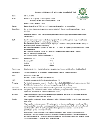 Regulamin III Otwartych Mistrzostw Armada Golf Club Data: 10-11.10.2015 Start: Dzień I – do 56 graczy – start wspólny 10:00 Powyżej 56 graczy – dwie sesje 8:00 i 13:00 Dzień II – start wspólny 10:00 Zapisy: Zapisy do godziny 17:00 9.10.2015 lub do zamknięcia listy 90 zawodników Zawodnicy: Do turnieju dopuszczeni są członkowie Armada Golf Club oraz goście posiadający status amatora Członkami Armada Golf Club są wszyscy zawodnicy posiadający opłacone Prawo do Gry w Sezonie 2015 CUT: Jeżeli w pierwszej rundzie wystartuje więcej niż 60 zawodników, przed drugą rundą będzie przeprowadzony CUT na następujących zasadach: Kat. Strokeplay brutto – 15 najlepszych mężczyzn + remisy i 5 najlepszych kobiet + remisy (w tym co najmniej 3 członkinie klubu). Kat. Stableford netto w grupach HCP +5-18,4 i 18,5-36 – 10 najlepszych zawodników w każdej grupie + remisy Kat. Stableford netto w grupie HCP 36,1-54 – 5 najlepszych zawodników + remisy Łącznie maksymalnie 60 graczy CUT jest rozdzielny dla każdej z kategorii. Wpisowe: Członkowie AGC Juniorzy AGC Goście Juniorzy Format gry: Strokeplay brutto i stableford netto w grupach handicapowych 36 dołków (2x18 dołków) Zasady gry: Turniej odbywa się na 36 dołkach pola golfowego Srebrne Stawy w Bytomiu. Tees: Mężczyźni – żółte tee Kobiety i juniorzy do lat 12 – czerwone tee HCP: Gra odbywa się z całości handicapu dokładnego PZG Przepisy: Turniej jest rozgrywany zgodnie z Regułami Gry w Golfa 2012-2015 zatwierdzonymi przez R&A Rulet Limited oraz regułami lokalnymi pola golfowego Srebrne Stawy Urządenia elektroniczne: Dozwolone jest używanie elektronicznych i optycznych urządzeń do pomiaru odległości pod warunkiem, że nie można nimi mierzyć innych wartości, takich jak: różnice wysokości, temperatura, prędkość i kierunek wiatru. Pojazdy: Zawodnicy mogą korzystać z wózków elektrycznych oraz korzystać ze środków transportu podczas trwania regulaminowej rundy Remis: W przypadku remisu o I miejsce w kategorii Mistrz i Mistrzyni Klubu o zwycięstwie zadecyduje dogrywka. – 110 zł – 90 zł – 310 zł – 210 zł W przypadku remisu o miejsce I-III brutto open o wyniku zadecyduje porównanie wyników z ostatnich dołków zawodów w następującej kolejności: ostatnia runda, 9 ostatnich dołków, 3 ostatnie dołki, ostatni dołek. W przypadku dalszego remisu zwycięzcą zostanie osoba posiadająca gorszy handicap dokładny. W przypadku remisu o miejsce I-III w każdej z kategorii netto zwycięzcą zostanie osoba posiadająca lepszy handicap dokładny. W przypadku dalszego remisu o wyniku zadecyduje porównanie wyników z ostatnich dołków zawodów w następującej kolejności: ostatnia runda, 9 ostatnich dołków, 3 ostatnie dołki, ostatni dołek. 1 Spory: Spory będą rozstrzygane przez komitet turnieju w sposób sprawiedliwy Komitet: Sędzia główny: Mirosław Nocoń Przedstawiciel pola: Jakub Gustaw Nagrody: Mistrz i Mistrzyni Klubu – wśród członków AGC – 50% zniżki na członkowstwo w 2016r. I,II,III miejsce strokeplay brutto open I,II,III miejsce stableford netto open w grupach HCP (+5-18,4; 18,5-36) I miejsce stableford netto open w grupie HCP 36,1-54 Nagrody są przyznawane rozdzielnie w kategoriach open, kat. brutto jest ważniejsza od kategorii netto. Kategoria Mistrz i Mistrzyni Klubu jest łączna z kategoriami open. Wizerunek: Każdy uczestnik Turnieju wyraża zgodę na bezpłatne użycie wizerunku w materiałach filmowych, zdjęciowych i audiowizualnych przygotowanych przez organizatora Turnieju lub przez upoważniony przez organizatora Turnieju podmiot. Zgoda na bezpłatne użycie wizerunku uczestnika Turnieju obejmuje wielokrotne korzystanie z wizerunku uczestnika Turnieju w celach promocyjnych, marketingowych, reklamowych oraz wydawniczych. Kat. rankingowa: Strokeplay brutto – kat. Elite 2
