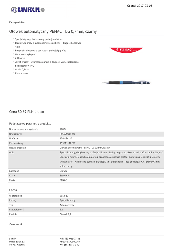 Gdańsk 2017-03-03 Karta produktu: Ołówek automatyczny PENAC TLG 0,7mm, czarny Specjalistyczny, dedykowany profesjonalistom Idealny do pracy z akcesoriami kreślarskimi – długość końcówki 4mm Elegancka obudowa z oznaczoną grubością grafitu Gumowana rękojeść Z klipsem „twist eraser” - wykręcana gumka o długości 2cm, ekologiczna – bez dodatków PVC Grafit: 0,7mm Kolor czarny Cena 30,69 PLN brutto Podstawowe parametry produktu Numer produktu w systemie 20074 Nr dostawcy PSC070311-03 Nr Celcen 17-01261-7 Kod kreskowy 4536111102501 Nazwa produktu Ołówek automatyczny PENAC TLG 0,7mm, czarny Opis Specjalistyczny, dedykowany profesjonalistom; idealny do pracy z akcesoriami kreślarskimi – długość końcówki 4mm; elegancka obudowa z oznaczoną grubością grafitu; gumowana rękojeść; z klipsem; „twist eraser” - wykręcana gumka o długości 2cm, ekologiczna – bez dodatków PVC; grafit: 0,7mm; kolor czarny Kategoria Ołówki Klasa Standard Marka PENAC Cecha W ofercie od 2014-11 Rodzaj Specjalistyczny Typ Automatyczny Ekologiczność B.d. Produkt Ołówek 0,7 Zamiennik Samfix Miałki Szlak 52 80-717 Gdańsk NIP: 583-026-77-81 REGON: 190500169 +48 (58) 305 31 60 Gdańsk 2017-03-03 Karta katalogowa produktu cd. Ołówek automatyczny PENAC TLG 0,7mm, czarny Zamiennik JSC070311-18 Wymiary Rozmiar 0,7mm Końcówka (mm) 0,7 Wspólny słownik zamówień CPV 30192131-8 Ołówki automatyczne Certyfikaty Nowy produkt w ofercie Standard Hit Standard Kolor Kolor Czarny Serdecznie zapraszamy do współpracy Zespół Samfix. Samfix Miałki Szlak 52 80-717 Gdańsk NIP: 583-026-77-81 REGON: 190500169 +48 (58) 305 31 60