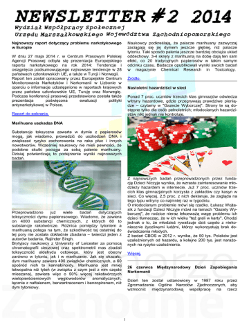 Najnowszy raport dotyczący problemu narkotykowego w Europie Naukowcy podkreślają, że palacze marihuany zazwyczaj zaciągają się jej dymem jeszcze głębiej, niż palacze tytoniu. Taki sposób palenia jeszcze bardziej obciąża układ oddechowy. 3-4 skręty z marihuaną na dobę dają ten sam efekt, co 20 tradycyjnych papierosów w takim samym odcinku czasu. Badacze opublikowali wyniki swoich badań w magazynie Chemical Research in Toxicology. W dniu 27 maja 2014 r. w Centrum Prasowym Polskiej Agencji Prasowej odbyła się prezentacja Europejskiego raportu narkotykowego na rok 2014: Tendencje i osiągnięcia podsumowującego najnowsze tendencje w 28 państwach członkowskich UE, a także w Turcji i Norwegii. Raport ten został opracowany przez Europejskie Centrum Monitorowania Narkotyków i Narkomanii w Lizbonie w oparciu o informacje udostępnione w raportach krajowych przez państwa członkowskie UE, Turcję oraz Norwegię. Podczas konferencji prasowej przedstawiona została także prezentacja poświęcona ewaluacji polityki antynarkotykowej w Polsce. Źródło. Nastoletni hazardziści w sieci Ponad 7 proc. uczniów trzecich klas gimnazjów odwiedza witryny hazardowe, gdzie przegrywają prawdziwe pieniądze – czytamy w "Gazecie Wyborczej". Strony te są dostępne tylko dla osób pełnoletnich; młodocianych hazardzistów nikt jednak nie kontroluje. Raport do pobrania. Marihuana uszkadza DNA Substancje toksyczne zawarte w dymie z papierosów mogą, jak wiadomo, prowadzić do uszkodzeń DNA i zwiększać ryzyko zachorowania na raka płuc i innych nowotworów. Wcześniej naukowcy nie mieli pewności, że podobne skutki pociąga za sobą palenie marihuany. Dzisiaj potwierdzają to podejrzenie wyniki najnowszych badań. Z najnowszych badań przeprowadzonych przez fundację Dzieci Niczyje wynika, że wzrasta zainteresowanie młodzieży hazardem w internecie. Już 7 proc. uczniów trzecich klas gimnazjalnych korzysta z zakładów czy kasyn w sieci. Co więcej, 2,5 proc. z nich deklaruje, że zagląda na tego typu witryny co najmniej raz w tygodniu. O młodocianym problemie mówi się rzadko. Łukasz Wojtasik z fundacji Dzieci Niczyje mówi na łamach "Gazety Wyborczej", że rodzice nieraz lekceważą wagę problemu ich dzieci tłumacząc, że w ich wieku "też grali w karty". Chodzi jednak o to, że młodzież rywalizuje dziś często z niekoniecznie życzliwymi ludźmi, którzy wykorzystują brak doświadczenia młodych. Z badań CBOS w 2012 r. wynika, że 50 tys. Polaków jest uzależnionych od hazardu, a kolejne 200 tys. jest narażonych na ryzyko uzależnienia. Przeprowadzono już wiele badań dotyczących toksyczności dymu papierosowego. Wiadomo, że zawiera on 4000 substancji chemicznych, z których 60 to substancje rakotwórcze. Różnica pomiędzy tytoniem a marihuaną polega na tym, że szkodliwość tej ostatniej do tej pory nie została dokładnie zbadana – twierdzi jeden z autorów badania, Rajinder Singh. Brytyjscy naukowcy z University of Leicester za pomocą chromatografii cieczowej oraz spektrometrii mas zbadali toksyczność aldehydu octowego, który jest obecny zarówno w tytoniu, jak i w marihuanie. Jak się okazało, dym marihuany zawiera 400 związków chemicznych, a 60 spośród nich to kannabinoidy. Marihuana jest mniej łatwopalna niż tytoń (w związku z czym jest z nim często mieszana), zawiera więc o 50% więcej rakotwórczych wielopierścieniowych węglowodorów aromatycznych, łącznie z naftalenem, benzantracenem i benzopirenem, niż dym tytoniowy. Więcej. 26 czerwca Międzynarodowy Narkomanii Dzień Zapobiegania Dzień ten został ustanowiony w 1987 roku przez Zgromadzenie Ogólne Narodów Zjednoczonych, aby wzmocnić międzynarodową współpracę na rzecz 1 zwalczania i zapobiegania narkomanii. Zjawisko narkomanii jest problemem dotykającym ludzi na całym świecie – około 200 milionów osób używa narkotyków przynajmniej raz w roku, a 25 milionów cierpi z powodu uzależnienia. Corocznie na świecie 200 tysięcy osób umiera z powodu chorób związanych z używaniem narkotyków. Przymuszanie przybiera wiele form. Jego celem jest wymuszenie uległości innej osoby, często za pomocą gróźb i kar. W relacjach między rodzicami a dzieckiem, w których przymusem posługują się najczęściej ci pierwsi, zmuszanie może przybrać formę połajanek, cofnięcia przywilejów (takich jak oglądanie telewizji) lub kary fizycznej. W pracy przymus zazwyczaj stosuje szef, który może sugerować, co mamy zrobić, napominać, udzielać reprymendy, a nawet wstrzymać awans. W związku miłosnym obie strony mogą się uciekać do przymusu wyrażającego się na przykład zniewagami, ochłodzeniem stosunków a nawet przemocą fizyczną. Zacznijmy od zdefiniowania podstawowych elementów składających się na sytuację wywierania przymusu. Pierwszym z nich jest podmiot, a więc człowiek analizujący informacje i decydujący o tym, co robić w danych okolicznościach. Drugim jest obiekt, a więc osoba, wobec której podmiot formułuje groźby, jeśli nie zastosuje się do jego żądań. Trzecim elementem jest ostateczny cel. To pojęcie obejmuje motywy i wartości, które sprawiają, że podmiot myśli w określony sposób i podejmuje takie, a nie inne działania. Jeśli zachowania obiektu pokrywają się z motywami i wartościami podmiotu, nie ma potrzeby wywierania przymusu. Przymus staje się potrzebny tylko wtedy, gdy inni nie zachowują się zgodnie z życzeniami podmiotu. Stosując przymus, podmiot chce sprawić, aby rzeczywiste zachowanie danego człowieka pokrywało się z pożądanym. Rodzice, obserwując zachowanie swojego dziecka – na przykład sprzątającego własny pokój – uznają, czy odpowiada ono ich oczekiwaniom. Jeśli tak, to nie ma potrzeby stosowania przymusu. Jeśli nie, to rodzice uciekają się do jednej z form działań przymuszających – może wystarczyć zwykła bura. Środki przymusu stosowane przez podmiot w znacznym
