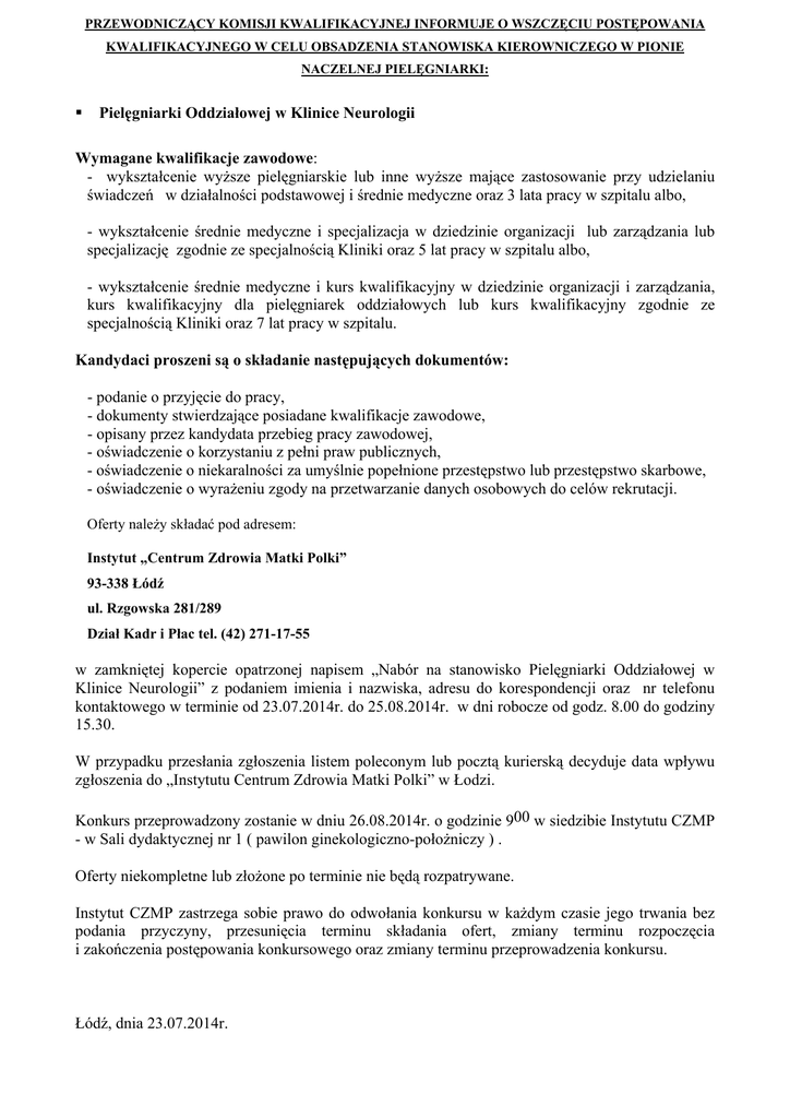 PRZEWODNICZĄCY KOMISJI KWALIFIKACYJNEJ INFORMUJE O WSZCZĘCIU POSTĘPOWANIA KWALIFIKACYJNEGO W CELU OBSADZENIA STANOWISKA KIEROWNICZEGO W PIONIE NACZELNEJ PIELĘGNIARKI: Pielęgniarki Oddziałowej w Klinice Neurologii Wymagane kwalifikacje zawodowe: - wykształcenie wyższe pielęgniarskie lub inne wyższe mające zastosowanie przy udzielaniu świadczeń w działalności podstawowej i średnie medyczne oraz 3 lata pracy w szpitalu albo, - wykształcenie średnie medyczne i specjalizacja w dziedzinie organizacji lub zarządzania lub specjalizację zgodnie ze specjalnością Kliniki oraz 5 lat pracy w szpitalu albo, - wykształcenie średnie medyczne i kurs kwalifikacyjny w dziedzinie organizacji i zarządzania, kurs kwalifikacyjny dla pielęgniarek oddziałowych lub kurs kwalifikacyjny zgodnie ze specjalnością Kliniki oraz 7 lat pracy w szpitalu. Kandydaci proszeni są o składanie następujących dokumentów: - podanie o przyjęcie do pracy, - dokumenty stwierdzające posiadane kwalifikacje zawodowe, - opisany przez kandydata przebieg pracy zawodowej, - oświadczenie o korzystaniu z pełni praw publicznych, - oświadczenie o niekaralności za umyślnie popełnione przestępstwo lub przestępstwo skarbowe, - oświadczenie o wyrażeniu zgody na przetwarzanie danych osobowych do celów rekrutacji. Oferty należy składać pod adresem: Instytut „Centrum Zdrowia Matki Polki” 93-338 Łódź ul. Rzgowska 281/289 Dział Kadr i Płac tel. (42) 271-17-55 w zamkniętej kopercie opatrzonej napisem „Nabór na stanowisko Pielęgniarki Oddziałowej w Klinice Neurologii” z podaniem imienia i nazwiska, adresu do korespondencji oraz nr telefonu kontaktowego w terminie od 23.07.2014r. do 25.08.2014r. w dni robocze od godz. 8.00 do godziny 15.30. W przypadku przesłania zgłoszenia listem poleconym lub pocztą kurierską decyduje data wpływu zgłoszenia do „Instytutu Centrum Zdrowia Matki Polki” w Łodzi. Konkurs przeprowadzony zostanie w dniu 26.08.2014r. o godzinie 900 w siedzibie Instytutu CZMP - w Sali dydaktycznej nr 1 ( pawilon ginekologiczno-położniczy ) . Oferty niekompletne lub złożone po terminie nie będą rozpatrywane. Instytut CZMP zastrzega sobie prawo do odwołania konkursu w każdym czasie jego trwania bez podania przyczyny, przesunięcia terminu składania ofert, zmiany terminu rozpoczęcia i zakończenia postępowania konkursowego oraz zmiany terminu przeprowadzenia konkursu. Łódź, dnia 23.07.2014r.