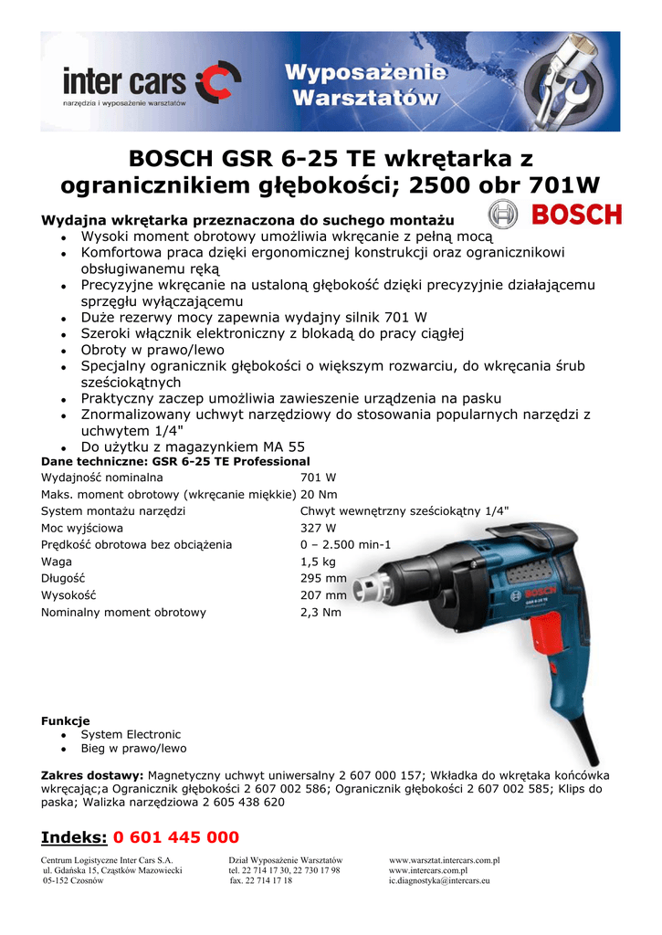 BOSCH GSR 6-25 TE wkrętarka z ogranicznikiem głębokości; 2500 obr 701W Wydajna wkrętarka przeznaczona do suchego montażu Wysoki moment obrotowy umożliwia wkręcanie z pełną mocą Komfortowa praca dzięki ergonomicznej konstrukcji oraz ogranicznikowi obsługiwanemu ręką Precyzyjne wkręcanie na ustaloną głębokość dzięki precyzyjnie działającemu sprzęgłu wyłączającemu Duże rezerwy mocy zapewnia wydajny silnik 701 W Szeroki włącznik elektroniczny z blokadą do pracy ciągłej Obroty w prawo/lewo Specjalny ogranicznik głębokości o większym rozwarciu, do wkręcania śrub sześciokątnych Praktyczny zaczep umożliwia zawieszenie urządzenia na pasku Znormalizowany uchwyt narzędziowy do stosowania popularnych narzędzi z uchwytem 1/4" Do użytku z magazynkiem MA 55 Dane techniczne: GSR 6-25 TE Professional Wydajność nominalna 701 W Maks. moment obrotowy (wkręcanie miękkie) 20 Nm System montażu narzędzi Chwyt wewnętrzny sześciokątny 1/4" Moc wyjściowa 327 W Prędkość obrotowa bez obciążenia 0 – 2.500 min-1 Waga 1,5 kg Długość 295 mm Wysokość 207 mm Nominalny moment obrotowy 2,3 Nm Funkcje System Electronic Bieg w prawo/lewo Zakres dostawy: Magnetyczny uchwyt uniwersalny 2 607 000 157; Wkładka do wkrętaka końcówka wkręcając;a Ogranicznik głębokości 2 607 002 586; Ogranicznik głębokości 2 607 002 585; Klips do paska; Walizka narzędziowa 2 605 438 620 Indeks: 0 601 445 000 Centrum Logistyczne Inter Cars S.A. ul. Gdańska 15, Cząstków Mazowiecki 05-152 Czosnów Dział Wyposażenie Warsztatów tel. 22 714 17 30, 22 730 17 98 fax. 22 714 17 18 www.warsztat.intercars.com.pl www.intercars.com.pl [email protected]