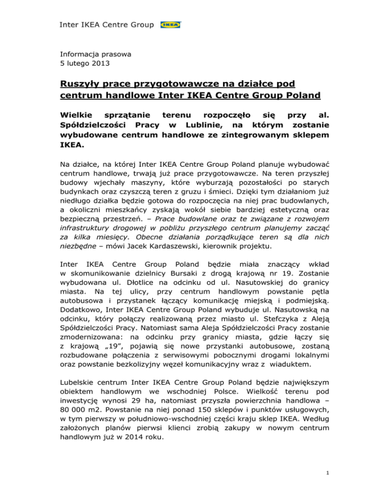 Informacja prasowa 5 lutego 2013 Ruszyły prace przygotowawcze na działce pod centrum handlowe Inter IKEA Centre Group Poland Wielkie sprzątanie terenu rozpoczęło się przy al. Spółdzielczości Pracy w Lublinie, na którym zostanie wybudowane centrum handlowe ze zintegrowanym sklepem IKEA. Na działce, na której Inter IKEA Centre Group Poland planuje wybudować centrum handlowe, trwają już prace przygotowawcze. Na teren przyszłej budowy wjechały maszyny, które wyburzają pozostałości po starych budynkach oraz czyszczą teren z gruzu i śmieci. Dzięki tym działaniom już niedługo działka będzie gotowa do rozpoczęcia na niej prac budowlanych, a okoliczni mieszkańcy zyskają wokół siebie bardziej estetyczną oraz bezpieczną przestrzeń. – Prace budowlane oraz te związane z rozwojem infrastruktury drogowej w pobliżu przyszłego centrum planujemy zacząć za kilka miesięcy. Obecne działania porządkujące teren są dla nich niezbędne – mówi Jacek Kardaszewski, kierownik projektu. Inter IKEA Centre Group Poland będzie miała znaczący wkład w skomunikowanie dzielnicy Bursaki z drogą krajową nr 19. Zostanie wybudowana ul. Dłotlice na odcinku od ul. Nasutowskiej do granicy miasta. Na tej ulicy, przy centrum handlowym powstanie pętla autobusowa i przystanek łączący komunikację miejską i podmiejską. Dodatkowo, Inter IKEA Centre Group Poland wybuduje ul. Nasutowską na odcinku, który połączy realizowaną przez miasto ul. Stefczyka z Aleją Spółdzielczości Pracy. Natomiast sama Aleja Spółdzielczości Pracy zostanie zmodernizowana: na odcinku przy granicy miasta, gdzie łączy się z krajową „19”, pojawią się nowe przystanki autobusowe, zostaną rozbudowane połączenia z serwisowymi pobocznymi drogami lokalnymi oraz powstanie bezkolizyjny węzeł komunikacyjny wraz z wiaduktem. Lubelskie centrum Inter IKEA Centre Group Poland będzie największym obiektem handlowym we wschodniej Polsce. Wielkość terenu pod inwestycję wynosi 29 ha, natomiast przyszła powierzchnia handlowa – 80 000 m2. Powstanie na niej ponad 150 sklepów i punktów usługowych, w tym pierwszy w południowo-wschodniej części kraju sklep IKEA. Według założonych planów pierwsi klienci zrobią zakupy w nowym centrum handlowym już w 2014 roku. 1 *** PODSTAWOWE DANE: Powierzchnia terenu pod centrum handlowe: 29 ha Całkowita powierzchnia najmu: 80.000 mkw. Liczba punktów handlowych i usługowych: 150 Liczba miejsc parkingowych: 3 000 Dojazd samochodem z centrum miasta: 6 minut O Inter IKEA Centre Group Poland: Inter IKEA Centre Group Poland należy do grupy spółek IKEA. Podstawowym celem jej działalności jest przygotowanie, realizacja i kompleksowa obsługa własnych inwestycji komercyjnych. Obok IKEA w należących do Inter IKEA Centre Group Poland centrach handlowych można znaleźć liczne sklepy oferujące zróżnicowany asortyment. Inter IKEA Centre Group Poland jest właścicielem siedmiu centrów handlowych: w Gdańsku, Łodzi, Poznaniu, Wrocławiu, Katowicach oraz dwóch w Warszawie. Obecnie firma pracuje nad rozbudową Parku Handlowego Bielany we Wrocławiu, rozbudową Centrum Handlowego Franowo oraz budową centrum handlowego w Lublinie. Kontakt dla mediów: Iza Sawicka PR Manager Inter IKEA Centre Group Poland tel.: 600 359 373 [email protected] 2