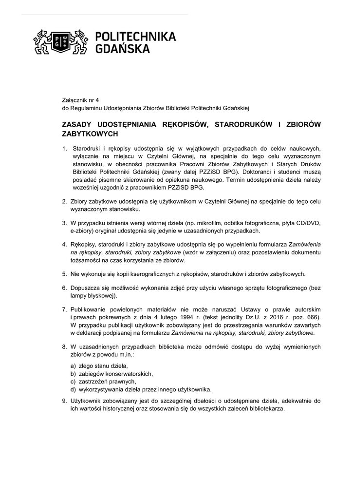 Załącznik nr 4 do Regulaminu Udostępniania Zbiorów Biblioteki Politechniki Gdańskiej ZASADY UDOSTĘPNIANIA RĘKOPISÓW, STARODRUKÓW I ZBIORÓW ZABYTKOWYCH 1. Starodruki i rękopisy udostępnia się w wyjątkowych przypadkach do celów naukowych, wyłącznie na miejscu w Czytelni Głównej, na specjalnie do tego celu wyznaczonym stanowisku, w obecności pracownika Pracowni Zbiorów Zabytkowych i Starych Druków Biblioteki Politechniki Gdańskiej (zwany dalej PZZiSD BPG). Doktoranci i studenci muszą posiadać pisemne skierowanie od opiekuna naukowego. Termin udostępnienia dzieła należy wcześniej uzgodnić z pracownikiem PZZiSD BPG. 2. Zbiory zabytkowe udostępnia się użytkownikom w Czytelni Głównej na specjalnie do tego celu wyznaczonym stanowisku. 3. W przypadku istnienia wersji wtórnej dzieła (np. mikrofilm, odbitka fotograficzna, płyta CD/DVD, e-zbiory) oryginał udostępnia się jedynie w uzasadnionych przypadkach. 4. Rękopisy, starodruki i zbiory zabytkowe udostępnia się po wypełnieniu formularza Zamówienia na rękopisy, starodruki, zbiory zabytkowe (wzór w załączeniu) oraz pozostawieniu dokumentu tożsamości na czas korzystania ze zbiorów. 5. Nie wykonuje się kopii kserograficznych z rękopisów, starodruków i zbiorów zabytkowych. 6. Dopuszcza się możliwość wykonania zdjęć przy użyciu własnego sprzętu fotograficznego (bez lampy błyskowej). 7. Publikowanie powielonych materiałów nie może naruszać Ustawy o prawie autorskim i prawach pokrewnych z dnia 4 lutego 1994 r. (tekst jednolity Dz.U. z 2016 r. poz. 666). W przypadku publikacji użytkownik zobowiązany jest do przestrzegania warunków zawartych w deklaracji podpisanej na formularzu Zamówienia na rękopisy, starodruki, zbiory zabytkowe. 8. W uzasadnionych przypadkach biblioteka może odmówić dostępu do wyżej wymienionych zbiorów z powodu m.in.: a) b) c) d) złego stanu dzieła, zabiegów konserwatorskich, zastrzeżeń prawnych, wykorzystywania dzieła przez innego użytkownika. 9. Użytkownik zobowiązany jest do szczególnej dbałości o udostępniane dzieła, adekwatnie do ich wartości historycznej oraz stosowania się do wszystkich zaleceń bibliotekarza.