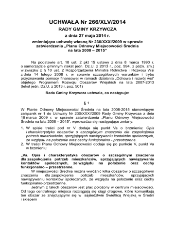 UCHWAŁA Nr 266/XLV/2014 RADY GMINY KRZYWCZA z dnia 27 maja 2014 r. zmieniająca uchwałę własną Nr 230/XXXI/2009 w sprawie zatwierdzenia „Planu Odnowy Miejscowości Średnia na lata 2008 – 2015” Na podstawie art. 18 ust. 2 pkt 15 ustawy z dnia 8 marca 1990 r. o samorządzie gminnym (tekst jedn. Dz.U. z 2013 r., poz. 594, z późn. zm.) w związku z § 10 ust. 2 Rozporządzenia Ministra Rolnictwa i Rozwoju Wsi z dnia 14 lutego 2008 r. w sprawie szczegółowych warunków i trybu przyznawania pomocy finansowej w ramach działania „Odnowa i rozwój wsi" objętego Programem Rozwoju Obszarów Wiejskich na lata 2007-2013 (tekst jedn. Dz.U. z 2013 r. poz. 501) Rada Gminy Krzywcza uchwala, co następuje: § 1. W Planie Odnowy Miejscowości Średnia na lata 2008-2015 stanowiącym załącznik nr 1 do Uchwały Nr 230/XXXI/2009 Rady Gminy Krzywcza z dnia 18 marca 2009 r. w sprawie zatwierdzenia „Planu Odnowy Miejscowości Średnia na lata 2008 – 2015”, wprowadza się następujące zmiany: 1. W spisie treści pod nr V dodaje się punkt Va o brzmieniu: Opis i charakterystyka obszarów o szczególnym znaczeniu dla zaspokojenia potrzeb mieszkańców, sprzyjających nawiązywaniu kontaktów społecznych, ze względu na położenie oraz cechy funkcjonalno - przestrzenne. 2. W treści Planu Odnowy Miejscowości dodaje się po punkcie V, punkt Va w brzmieniu: „Va. Opis i charakterystyka obszarów o szczególnym znaczeniu dla zaspokojenia potrzeb mieszkańców, sprzyjających nawiązywaniu kontaktów społecznych, ze względu na położenie oraz cechy funkcjonalno – przestrzenne. W miejscowości Średnia można wyróżnić kilka obszarów o szczególnym znaczeniu dla zaspokojenia potrzeb mieszkańców, sprzyjających nawiązywaniu kontaktów społecznych, ze względu na położenie oraz cechy funkcjonalno-przestrzenne. Jednym z takich obszarów jest plac położony w centrum miejscowości. Od tego centralnego miejsca rozciągają się ciągi drogowe, które komunikują ten obszar ze znajdującymi się w sąsiedztwie Świetlicą Wiejską w Średni i sklepem –2– Obszar ten ze względu na swoje centralne położenie, po odpowiednim zagospodarowaniu może pełnić ważną funkcję rekreacyjno-wypoczynkową. Poprzez odpowiednie, zgodne z potrzebami i oczekiwaniami mieszkańców zagospodarowanie przestrzenne tego miejsca wzrośnie ich aktywność na niwie wypoczynku, rekreacji i zagospodarowania wolnego czasu. Plac znajdujący się w centrum wsi poprawi też znacząco estetykę tego miejsca. Aby mógł on taką funkcję pełnić należałoby wybudować chodniki, zamontować ławki, umiejscowić plac zabaw dla dzieci oraz dokonać remontu boiska znajdującego się przy świetlicy. Teren ten przez lata był zaniedbany i wymaga podobnie jak park działań rewitalizacyjnych, które miałyby na celu poprawę warunków życia mieszkańców, poprawę estetyki obszarów ważnych ze względów społecznych, poprawę bezpieczeństwa oraz stworzenie warunków do wypoczynku i rekreacji. Drugim obszarem o szczególnym znaczeniu dla zaspokojenia potrzeb mieszkańców, sprzyjających nawiązywaniu kontaktów społecznych, ze względu na położenie oraz cechy funkcjonalno-przestrzenne jest teren przy Kościele filialnym w Średni. Jego szczególny charakter wynika z faktu, iż jest to obszar intensywnie uczęszczany prze mieszkańców, sprzyjający nawiązywaniu kontaktów, wykorzystywany organizowania zgromadzeń. Obszary o szczególnym o znaczeniu dla zaspokojenia potrzeb mieszkańców, sprzyjających nawiązywaniu kontaktów społecznych obrazują poniższe mapy. 5 6 –3– 3 9 4 7 5 10 8 2 1 7 11 –4– 3. Rozdział V. OPIS PLANOWANYCH PRZEDSIĘWZIĘĆ Planu Odnowy Miejscowości Krzywcza otrzymuje brzmienie: Lp. Nazwa zadania Cel Okres realizacji 1. Remont i zakup Poprawa warunków wyposażenia do prowadzenia technicznego świetlicy działalności wiejskiej kulturalnej i oświatowej 2014-2016 2. Budowa oświetlenia Poprawa warunków wzdłuż dróg gminnych życia i bezpieczeństwa ludności 2012-2015 Wartość inwestycji Zródła pozyskania środków 100.000,- - budżet gminy - fundusze unijne 70.000,-- budżet gminy - fundusze unijne –5– Lp. 3. 4. 5. 6 7. 8. Nazwa zadania Cel Okres realizacji Poprawa warunków 2014-2016 życia ludności, bezpieczeństwa i uzbrojenie terenów inwestycyjnych Zagospodarowanie Poprawa warunków 2014-2015 terenów rekreacyjnych rekreacji i wypoczynku turystów Remont nawierzchni dróg gminnych Rozudowa obiektów Promowanie sportowych - boisko rozwoju sportu przy świetlicy wijeskiej 2014-2017 Zagospodarowanie miejsc o szczególnym znaczeniu dla zaspokojenia potrzeb mieszkańców, sprzyjających nawiązywaniu kontaktów społecznych, ze względu na położenie oraz cechy funkcjonalnoprzestrzenne poprzez: - odnowa otocenia wokół kościoła fililanego w Średniej - budowa chodników w strefie przystanli autobusowego, skłepu i świetlicy wiejskiej. Remont Kościoła Parafialnego obszary o szczególnym znaczeniu dla zaspokojenia potrzeb mieszkańców, sprzyjających nawiązywaniu kontaktów społecznych, ze względu na położenie oraz cechy funkcjonalnoprzestrzenne 2014-2016 Poprawa estetyki centrum wsi; ochrona zabytków 2014-2017 Budowa wodociągów wiejskich i sieci kanalizacyjnej Poprawa standardu 2014-2017 życia mieszkańców Wartość inwestycji Źródła pozyskania środków 800.000,- - budżet gminy - fundusze unijne - środki budżet państwa 500.000,- - budżet gminy - fundusze unijne - środki inwestorów prywatnych 1.000.000,-- budżet gminy - fundusze unijne - środki budżetu państwa - środki innych jednostek samorządowych 120.000,- - budżet gminy - fundusze unijne 200.000,- - środki parafii, budżet gminy fundusze unijne środki budżetu państwa 5.000.000,-- budżet gminy - fundusze unijne –6– Lp. 9. Nazwa zadania Zagospodarowanie centrum miejscowości Krzywcza poprzez rewitalizację parku i terenów przyległych obejmujące: - przebudowę 