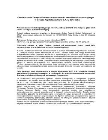 Oświadczenie Zarządu Emitenta o stosowaniu zasad ładu korporacyjnego w Grupie Kapitałowej CCC S.A. w 2013 roku Wskazanie zasad ładu korporacyjnego, któremu podlega Emitent, oraz miejsca, gdzie tekst zbioru zasad jest publicznie dostępny. Emitent podlega zasadom zawartym w dokumencie „Dobre Praktyki Spółek Notowanych na GPW”, stanowiącym załącznik do Uchwały nr 19/1307/2012 Rady Giełdy z dnia 21 listopada 2012 r. Zbiór zasad dostępny jest m.in. na stronie internetowej GPW : http://www.corp-gov.gpw.pl/assets/library/polish/regulacje/dobre_praktyki_16_11_2012.pdf Wskazanie zakresu w jakim Emitent odstąpił od postanowień zbioru zasad ładu korporacyjnego oraz wyjaśnienie przyczyn tego odstąpienia. W 2013 r. Emitent nie stosował zasad zawartych w punkcie 12 rozdziału I i punkcie 10 rozdziału IV „Dobrych Praktyk Spółek Notowanych na GPW”. Emitent biorąc pod uwagę konieczność przeprowadzenia wielu czynności techniczno – organizacyjnych i związane z tym ryzyka natury technicznej i prawnej, które mogą wpłynąć na prawidłowy i niezakłócony porządek obrad walnego zgromadzenia akcjonariuszy, a tym samym na ich prawa, nie zdecydował się na transmisje obrad walnego zgromadzenia w czasie rzeczywistym oraz na zapewnienie akcjonariuszom możliwości udziału w walnym zgromadzeniu przy wykorzystaniu środków komunikacji elektronicznej. W miarę upowszechniania się stosowania tego rozwiązania technicznego oraz zapewnienia odpowiedniego bezpieczeństwa jego stosowania, Zarząd Emitenta rozważa wprowadzenie go w życie. Opis głównych cech stosowanych w Grupie Kapitałowej CCC S.A. systemów kontroli wewnętrznej i zarządzania ryzykiem w odniesieniu do procesu sporządzania sprawozdań finansowych i skonsolidowanych sprawozdań finansowych. Za skuteczność funkcjonowania systemu kontroli wewnętrznej i zarządzania ryzykiem w odniesieniu do procesu sporządzania sprawozdań finansowych w poszczególnych spółkach GK CCC S.A. odpowiedzialny jest Zarząd tych jednostek. W przypadku skonsolidowanych sprawozdań finansowych wskazana rola przypada Zarządowi jednostki dominującej. Nadzór merytoryczny nad procesem sporządzania sprawozdań finansowych sprawuje Wiceprezes Zarządu. Za organizację procesu sporządzania sprawozdań finansowych odpowiada Główny Księgowy Spółki, który jednocześnie sprawuje nadzór nad prawidłowym ewidencjonowaniem operacji gospodarczych w księgach rachunkowych Spółki. Sposób obiegu dokumentów pozwala na zminimalizowanie ewentualnych ryzyk związanych z prawidłowym ewidencjonowaniem operacji gospodarczych. W Spółce funkcjonuje wielopoziomowy system kontroli wewnętrznej, pozwalający zdaniem Zarządu na efektywne przeciwdziałanie i szybkie eliminowanie ewentualnie powstałych nieprawidłowości. Ponadto roczne i półroczne sprawozdania finansowe polegają badaniu przez organ niezależny biegłego rewidenta. Wyniki badania każdorazowo dołączane są do publikowanych raportów. Wskazanie akcjonariuszy spółki dominującej posiadających bezpośrednio lub pośrednio znaczne pakiety akcji. Wykaz akcjonariuszy posiadających znaczne pakiety akcji zgodnie z art. 69 Ustawy o ofercie (zgodnie ze stanem na dzień przekazania raportu rocznego): Udział w kapitale zakładowym (%) Liczba posiadanych akcji (szt.) Akcjonariusz Luxprofi s.a.r.l. Liczba głosów na Walnym Zgromadzeniu (szt.) Udział w ogólnej liczbie głosów na Walnym Zgromadzeniu (%) 13 360 000 34,79 18 110 000 40,20 Leszek Gaczorek 3 010 000 7,84 4 760 000 10,57 ING OFE* 2 718 693 7,08 2 718 693 6,03 Aviva OFE* 3 174 451 8,27 3 174 451 7,05 (podmiot zależny od Dariusza Miłka) * dane pochodzą z informacji rocznej o strukturze aktywów Funduszu ING OFE i Aviva OFE na dzień 31.12.2013 r. Akcje spółki dominującej dzielą się na: - zwykłe na okaziciela, - imienne uprzywilejowane co do głosu w ten sposób, że na każdą akcję przypadają dwa głosy na Walnym Zgromadzeniu spółki dominującej. Część wskazanych wyżej akcji przysługujących Luxprofi s.a.r.l.(podmiot zależny od Dariusza Miłka) i Leszkowi Gaczorek jest uprzywilejowana co do głosu: Liczba posiadanych akcji uprzywilejowanych co do głosu (szt.) Akcjonariusz Udział w kapitale zakładowym (%) Liczba głosów na Walnym Zgromadzeniu (szt.) Udział w ogólnej liczbie głosów na Walnym Zgromadzeniu (%) Luxprofi s.a.r.l. (podmiot zależny od Dariusza Miłka) 4 750 000 12,37 9 500 000 21,09 Leszek Gaczorek 1 750 000 4,56 3 500 000 7,77 Udział w liczbie głosów na Walnym Zgromadzeniu Akcjonariuszy Luxprofi S.a.r.l (Podmiot zależny od p. Dariusza Miłka) 36,15% 40,20% Leszek Gaczorek ING OFE 7,05% 6,03% 10,57% Aviva OFE Pozostali akcjonariusze 2 Wskazanie posiadaczy wszelkich papierów wartościowych, które dają uprawnienia kontrolne w spółce Emitenta, wraz z opisem tych uprawnień. specjalne Wykaz akcjonariuszy posiadających akcje uprzywilejowane (zgodnie ze stanem na dzień przekazania raportu rocznego): Akcjonariusz Liczba posiadanych akcji (szt.) Udział w kapitale zakładowym (%) Liczba głosów na Walnym Zgromadzeniu (szt.) Udział w ogólnej liczbie głosów na Walnym Zgromadzeniu (%) Luxprofi s.a.r.l. (podmiot zależny od Dariusza Miłka) 4 750 000 12,37 9 500 000 21,09 Leszek Gaczorek 1 750 000 4,56 3 500 000 7,77 Lech Chudy 50 000 0,13 100 000 0,22 Mariusz Gnych 50 000 0,13 100 000 0,22 50 000 6 650 000 0,13 17,32 100 000 13 300 000 0,22 29,52 Renata Miłek Razem Wskazane wyżej akcje są uprzywilejowanymi co do głosu w ten sposób, że na każdą przypadają dwa głosy. Wskazanie wszelkich ograniczeń odnośnie wykonywania prawa głosu w spółce Emitenta. Ograniczenia nie występują. Wskazanie wszelkich ograniczeń dotyczących przenoszenia prawa własności papierów wartościowych Emitenta. Akcjonariuszom spółki dominującej przysługuje prawo pierwszeństwa nabycia akcji imiennych uprzywilejowanych przeznaczonych do zbycia. W przypadku nie skorzystania z t