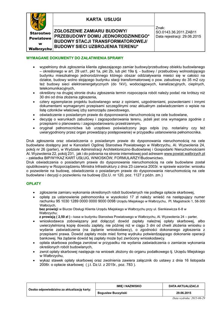 KARTA USŁUGI ZGŁOSZENIE ZAMIARU BUDOWY/ Starostwo PRZEBUDOWY DOMU JEDNORODZINNEGO* Powiatowe BUDOWY STACJI TRANSFORMATOROWEJ/ w BUDOWY SIECI UZBROJENIA TERENU* Wałbrzychu Znak: SO.0143.36.2011.ZAB11 Data rejestracji: 29.06.2015 WYMAGANE DOKUMENTY DO ZAŁATWIENIA SPRAWY wypełniony druk zgłoszenia klienta zgłaszającego zamiar budowy/przebudowy obiektu budowlanego – określonego w art. 29 ust1, pkt 1a, pkt 2b, lub pkt 19a tj. - budowy / przebudowy wolnostojącego budynku mieszkalnego jednorodzinnego którego obszar oddziaływania mieści się w całości na działce, budowy wolno stojącego budynku stacji transformatorowej o pow. zabudowy do 35 m2 czy też budowy sieci elektroenergetycznych (do 1kV), wodociągowych, kanalizacyjnych, cieplnych, telekomunikacyjnych, określony na drugiej stronie druku zgłoszenia termin rozpoczęcia robót należy podać nie krótszy niż 30 dni od dnia złożenia zgłoszenia, cztery egzemplarze projektu budowlanego wraz z opiniami, uzgodnieniami, pozwoleniami i innymi dokumentami wymaganymi przepisami szczególnymi oraz aktualnym zaświadczeniem o wpisie na listę członków właściwej izby samorządu zawodowego, oświadczenie o posiadanym prawie do dysponowania nieruchomością na cele budowlane, decyzję o warunkach zabudowy i zagospodarowania terenu, jeżeli jest ona wymagana zgodnie z przepisami o planowaniu i zagospodarowaniu przestrzennym, oryginał pełnomocnictwa lub urzędowo poświadczony jego odpis (np. notarialny czy też uwiarygodniony przez organ prowadzący postępowanie) w przypadku ustanowienia pełnomocnika. Druk zgłoszenia oraz oświadczenia o posiadanym prawie do dysponowania nieruchomością na cele budowlane dostępny jest w Kancelarii Ogólnej Starostwa Powiatowego w Wałbrzychu, Al. Wyzwolenia 24, pokój nr 26 (parter), w Wydziale Administracji Architektoniczno-Budowlanej i Gospodarki Nieruchomościami Al. Wyzwolenia 22, pokój 231, jak i do pobrania na stronie internetowej pod adresem www.powiat.walbrzych.pl - zakładka BIP/WYKAZ KART USŁUG, WNIOSKÓW, FORMULARZY/Budownictwo. Druk oświadczenia o posiadanym prawie do dysponowania nieruchomością na cele budowlane został opublikowany w Rozporządzeniu Ministra Infrastruktury z dnia 23 czerwca 2003r. w sprawie wzorów: wniosku o pozwolenie na budowę, oświadczenia o posiadanym prawie do dysponowania nieruchomością na cele budowlane i decyzji o pozwoleniu na budowę (Dz.U. nr 120, poz. 1127 z późn. zm.) OPŁATY zgłoszenie zamiaru wykonania określonych robót budowlanych nie podlega opłacie skarbowej, opłatę za ustanowienie pełnomocnika w wysokości 17 zł należy wnieść na następujący numer rachunku 95 1030 1289 0000 0000 9000 0098 Urzędu Miejskiego w Wałbrzychu, Pl. Magistracki 1, 58-300 Wałbrzych, bez prowizji w Biurze Obsługi Klienta Urzędu Miejskiego w Wałbrzychu przy ul. Sienkiewicza 6-8 w Wałbrzychu; z prowizją ( 2,50 zł ) - kasa w budynku Starostwa Powiatowego w Wałbrzychu, Al. Wyzwolenia 24 – parter, wnioskodawca zobowiązany jest dołączyć dowód zapłaty należnej opłaty skarbowej, albo uwierzytelnioną kopię dowodu zapłaty, nie później niż w ciągu 3 dni od chwili złożenia wniosku o wydanie zaświadczenia (na żądanie wnioskodawcy), o zgodności dokonanego zgłoszenia z przepisami prawa. Dowód zapłaty może mieć formę wydruku potwierdzającego dokonanie operacji bankowej. Na żądanie dowód tej zapłaty może być zwrócony wnioskodawcy. opłata skarbowa podlega zwrotowi w przypadku nie wydania zaświadczenia o zamiarze wykonania określonych robót budowlanych, zwrot opłaty skarbowej następuje na wniosek złożony do organu podatkowego tj. Urzędu Miejskiego w Wałbrzychu, wykaz stawek opłaty skarbowej oraz zwolnienia zawiera załącznik do ustawy z dnia 16 listopada 2006r. o opłacie skarbowej ( j.t. Dz.U. z 2015r., poz. 783 ). IMIĘ I NAZWISKO DATA AKTUALIZACJI Osoba odpowiedzialna za aktualizację karty: Bogusław Buczyński 29.06.2015 Data wydruku: 2015-06-29 KARTA USŁUGI ZGŁOSZENIE ZAMIARU BUDOWY/ Starostwo PRZEBUDOWY DOMU JEDNORODZINNEGO* Powiatowe BUDOWY STACJI TRANSFORMATOROWEJ/ w BUDOWY SIECI UZBROJENIA TERENU* Wałbrzychu Znak: SO.0143.36.2011.ZAB11 Data rejestracji: 29.06.2015 Nie podlega opłacie skarbowej: dokonanie czynności urzędowej, wydanie zaświadczenia oraz zezwolenia w sprawach budownictwa mieszkaniowego Zwolnione z opłaty skarbowej są: zaświadczenia wydawane dla np. jednostek budżetowych, jednostek samorządu terytorialnego, zaświadczenia w sprawie budowy lub odbudowy obiektów budowlanych zniszczonych albo uszkodzonych wskutek działalności spowodowanej ruchem zakładu górniczego lub klęsk żywiołowych, MIEJSCE ZŁOŻENIA DOKUMENTÓW Kancelaria Ogólna, parter pok. nr 26, Al. Wyzwolenia 24, 58-300 Wałbrzych czynna w godzinach pracy urzędu tj. poniedziałek, środa, czwartek - godz. 7.30 – 15.30; wtorek - godz. 7.30 – 16.30; piątek- godz. 7.30 – 14.30; lub drogą pocztową na adres: Starostwo Powiatowe w Wałbrzychu, Al. Wyzwolenia 20 - 24, 58-300 Wałbrzych. OSOBY DO KONTAKTU Pani Wisenna Popławska – Konsewicz Pani Patrycja Grzebska Wydział Administracji Architektoniczno-Budowlanej i Gospodarki Nieruchomościami Al. Wyzwolenia 22, Wałbrzych, II piętro, pokój nr 231 tel. (74) 84 60 644; (74) 84 60 506; fax ( 74 ) 8460646 e-mail: [email protected] TERMIN I SPOSÓB ZAŁATWIENIA Termin rozpatrzenia zgłoszenia wynosi 30 dni co oznacza, że do wykonania robót można przystąpić: po upływie 30 dni od dnia złożenia zgłoszenia ( jest to tzw. milcząca zgoda organu) o ile tutejszy Organ nie wniesie sprzeciwu w formie decyzji administracyjnej, po upływie 30 dni od dnia uzupełnienia brakujących dokumentów o ile tutejszy Organ nie wniesie sprzeciwu w formie decyzji administracyjnej, nie później niż po upływie 3 lat od określonego w zgłoszeniu terminu ich rozpoczęcia. Informację o inspektorze załatwiającym sprawę, jego numerze telefonu czy też pokoju możn