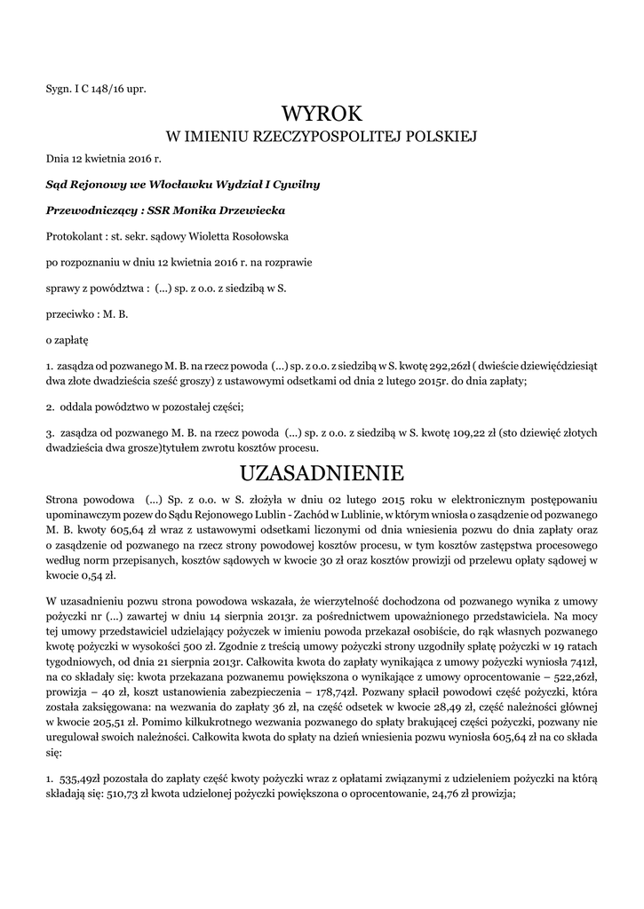 Sygn. I C 148/16 upr. WYROK W IMIENIU RZECZYPOSPOLITEJ POLSKIEJ Dnia 12 kwietnia 2016 r. Sąd Rejonowy we Włocławku Wydział I Cywilny Przewodniczący : SSR Monika Drzewiecka Protokolant : st. sekr. sądowy Wioletta Rosołowska po rozpoznaniu w dniu 12 kwietnia 2016 r. na rozprawie sprawy z powództwa : (...) sp. z o.o. z siedzibą w S. przeciwko : M. B. o zapłatę 1. zasądza od pozwanego M. B. na rzecz powoda (...) sp. z o.o. z siedzibą w S. kwotę 292,26zł ( dwieście dziewięćdziesiąt dwa złote dwadzieścia sześć groszy) z ustawowymi odsetkami od dnia 2 lutego 2015r. do dnia zapłaty; 2. oddala powództwo w pozostałej części; 3. zasądza od pozwanego M. B. na rzecz powoda (...) sp. z o.o. z siedzibą w S. kwotę 109,22 zł (sto dziewięć złotych dwadzieścia dwa grosze)tytułem zwrotu kosztów procesu. UZASADNIENIE Strona powodowa (...) Sp. z o.o. w S. złożyła w dniu 02 lutego 2015 roku w elektronicznym postępowaniu upominawczym pozew do Sądu Rejonowego Lublin - Zachód w Lublinie, w którym wniosła o zasądzenie od pozwanego M. B. kwoty 605,64 zł wraz z ustawowymi odsetkami liczonymi od dnia wniesienia pozwu do dnia zapłaty oraz o zasądzenie od pozwanego na rzecz strony powodowej kosztów procesu, w tym kosztów zastępstwa procesowego według norm przepisanych, kosztów sądowych w kwocie 30 zł oraz kosztów prowizji od przelewu opłaty sądowej w kwocie 0,54 zł. W uzasadnieniu pozwu strona powodowa wskazała, że wierzytelność dochodzona od pozwanego wynika z umowy pożyczki nr (...) zawartej w dniu 14 sierpnia 2013r. za pośrednictwem upoważnionego przedstawiciela. Na mocy tej umowy przedstawiciel udzielający pożyczek w imieniu powoda przekazał osobiście, do rąk własnych pozwanego kwotę pożyczki w wysokości 500 zł. Zgodnie z treścią umowy pożyczki strony uzgodniły spłatę pożyczki w 19 ratach tygodniowych, od dnia 21 sierpnia 2013r. Całkowita kwota do zapłaty wynikająca z umowy pożyczki wyniosła 741zł, na co składały się: kwota przekazana pozwanemu powiększona o wynikające z umowy oprocentowanie – 522,26zł, prowizja – 40 zł, koszt ustanowienia zabezpieczenia – 178,74zł. Pozwany spłacił powodowi część pożyczki, która została zaksięgowana: na wezwania do zapłaty 36 zł, na część odsetek w kwocie 28,49 zł, część należności głównej w kwocie 205,51 zł. Pomimo kilkukrotnego wezwania pozwanego do spłaty brakującej części pożyczki, pozwany nie uregulował swoich należności. Całkowita kwota do spłaty na dzień wniesienia pozwu wyniosła 605,64 zł na co składa się: 1. 535,49zł pozostała do zapłaty część kwoty pożyczki wraz z opłatami związanymi z udzieleniem pożyczki na którą składają się: 510,73 zł kwota udzielonej pożyczki powiększona o oprocentowanie, 24,76 zł prowizja; 2. skapitalizowane odsetki umowne w wysokości czterokrotności stopy kredytu lombardowego NBP w kwocie 70,15 zł. Ponadto powód wniósł o zasądzenie odsetek ustawowych od skapitalizowanych odsetek umownych na podstawie art. 482 § 1 k.c. Wskazał, że dochodzona wierzytelność jest bezsporna, gdyż pozwany do dnia dzisiejszego nie spłacił pożyczki w całości. Sąd Rejonowy Lublin-Zachód w Lublinie postanowieniem z dnia 12 lutego 2015r. stwierdzając brak podstaw do wydania nakazu zapłaty, przekazał sprawę do Sądu Rejonowego we Włocławku. W dniu 16 czerwca 2015r. Sąd Rejonowy we Włocławku wydał nakaz zapłaty w sprawie I Nc 1953/15 upr., od którego to nakazu pozwany złożył sprzeciw, z treści którego wynika, iż zaskarżył nakaz zapłaty w całości, bowiem podniósł, że nie ma możliwości spłaty danej wierzytelności. Sąd ustalił następujący stan faktyczny: W dniu 14 sierpnia 2013 roku strony zawarły umowę pożyczki. Pożyczkodawca udzielił pożyczki w kwocie 500 zł na okres 133 dni. W §2 wskazano, że całkowita kwota do zapłaty wynosi 741 zł w tym: 500 zł kwota pożyczki, kwota oprocentowania pożyczki wyniesie 22,26 zł, prowizja – 40 zł i koszty ustanowienia zabezpieczenia, którego powstanie związane jest z udzieleniem pożyczki – 178,74 zł. dowód: umowa – k. 24-24v; umowa dodatkowa – k. 25; upoważnienie – k. 26 Pismami z dnia 23 grudnia 2013r. i 14 stycznia 2014r. strona powodowa wezwała pozwanego do zapłaty. dowód: pismo z 23.12.2013r. z potwierdzeniem nadania – k. 28-30; pismo z dnia 14.01.2014r. z potwierdzeniem nadania – k. 31-32 W dniu 02 września 2013r. Biuro (...) S.A. w W. wystawiło na stronę powodową fakturę na kwotę 6.629,70 zł tytułem opłaty za cennik za pojedyncze raporty. W dniu 16 września 2013r. dokonano zapłaty za fakturę. dowód : faktura –k. 35; potwierdzenie przelewu – k. 36 Pozwany spłacił stronie powodowej kwotę 270 zł. dowód : wydruk z systemu wpłat k. 27 Sąd zważył, co następuje: Powództwo jest zasadne częściowo i zasługuje na uwzględnienie w zakresie kwoty 292,26 zł wraz z ustawowymi odsetkami od dnia 02 lutego 2015 roku do dnia zapłaty. Powód wykazał, że strony zawarły umowę, na mocy której powód udzielił pozwanemu pożyczki w kwocie 500 zł, którą to kwotę pozwany zobowiązał się spłacić w 19 tygodniowych ratach wraz z odsetkami w wysokości 22,26 zł, prowizją w wysokości 40 zł oraz kosztami ustanowienia zabezpieczenia w wysokości 178,74 zł. (art. 720 kc). Łączne zadłużenie pozwanego wynikające z umowy pożyczki kwoty 500 zł, to kwota 741 zł, przy czym całkowity koszt pożyczki wynosił 241 zł. Pozwany spłacił wyłącznie część zadłużenia, w kwocie 270 zł. Skoro zatem pozwany zaciągnął pożyczkę i zobowiązał się do jej spłaty, którego to obowiązku nie dotrzymał, powód miał prawo żądać od pozwanego (według stanowiska powoda) zapłaty kwoty 605,64zł, na którą składają się: niespłacony kapitał powiększony o wynikające z umowy oprocentowanie – 535,49 zł, prowizja – 24,76 zł oraz skapitalizowane odsetki umowne w w