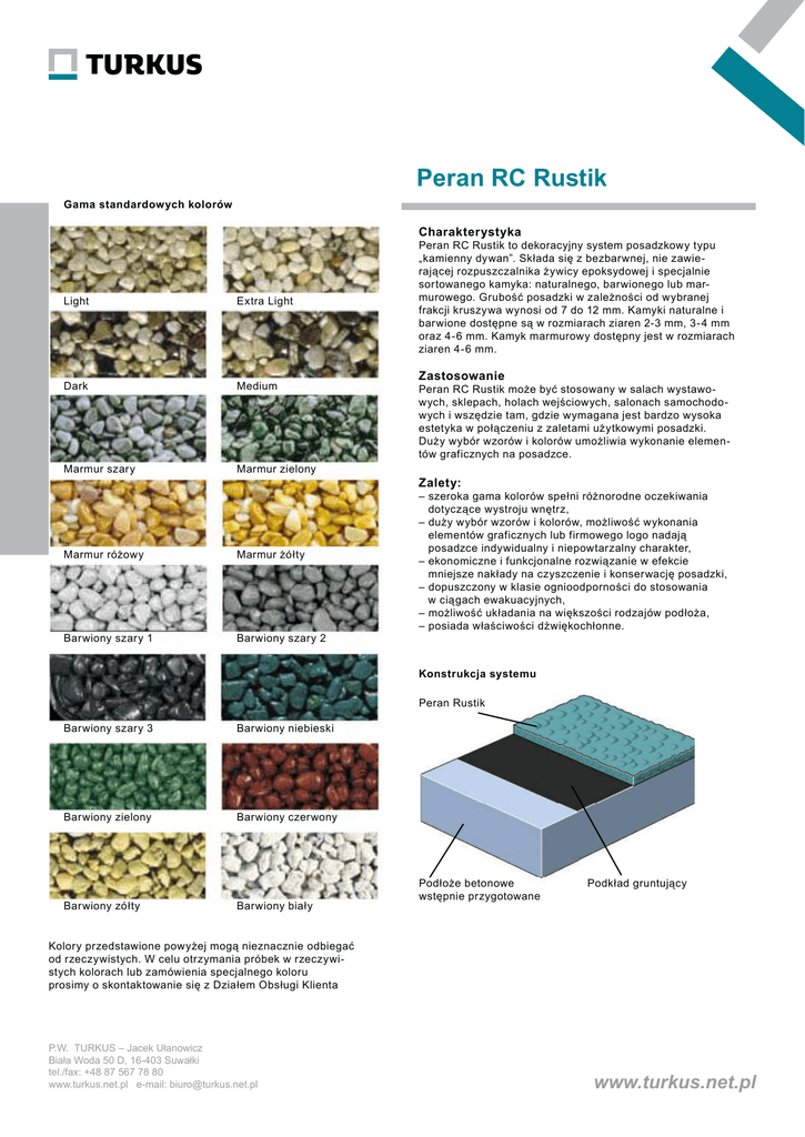 Peran RC Rustik Gama standardowych kolorów Charakterystyka Light Extra Light Dark Medium Marmur szary Marmur zielony Marmur różowy Marmur żółty Barwiony szary 1 Barwiony szary 2 Peran RC Rustik to dekoracyjny system posadzkowy typu „kamienny dywan”. Składa się z bezbarwnej, nie zawierającej rozpuszczalnika żywicy epoksydowej i specjalnie sortowanego kamyka: naturalnego, barwionego lub marmurowego. Grubość posadzki w zależności od wybranej frakcji kruszywa wynosi od 7 do 12 mm. Kamyki naturalne i barwione dostępne są w rozmiarach ziaren 2-3 mm, 3-4 mm oraz 4-6 mm. Kamyk marmurowy dostępny jest w rozmiarach ziaren 4-6 mm. Zastosowanie Peran RC Rustik może być stosowany w salach wystawowych, sklepach, holach wejściowych, salonach samochodowych i wszędzie tam, gdzie wymagana jest bardzo wysoka estetyka w połączeniu z zaletami użytkowymi posadzki. Duży wybór wzorów i kolorów umożliwia wykonanie elementów graficznych na posadzce. Zalety: – – – – – – szeroka gama kolorów spełni różnorodne oczekiwania dotyczące wystroju wnętrz, duży wybór wzorów i kolorów, możliwość wykonania elementów graficznych lub firmowego logo nadają posadzce indywidualny i niepowtarzalny charakter, ekonomiczne i funkcjonalne rozwiązanie w efekcie mniejsze nakłady na czyszczenie i konserwację posadzki, dopuszczony w klasie ognioodporności do stosowania w ciągach ewakuacyjnych, możliwość układania na większości rodzajów podłoża, posiada właściwości dźwiękochłonne. Konstrukcja systemu Peran Rustik Barwiony szary 3 Barwiony niebieski Barwiony zielony Barwiony czerwony Barwiony zółty Barwiony biały Podłoże betonowe wstępnie przygotowane Podkład gruntujący Kolory przedstawione powyżej mogą nieznacznie odbiegać od rzeczywistych. W celu otrzymania próbek w rzeczywistych kolorach lub zamówienia specjalnego koloru prosimy o skontaktowanie się z Działem Obsługi Klienta P.W. TURKUS – Jacek Ułanowicz Biała Woda 50 D, 16-403 Suwałki tel./fax: +48 87 567 78 80 www.turkus.net.pl e-mail: [email protected] www.turkus.net.pl Instrukcja użytkowania Nowe posadzki betonowe: Usunąć warstwę mleczka cementowego poprzez bezpyłowe śrutowanie lub szlifowanie tarczą diamentową. Stare posadzki betonowe, posadzki ze zniszczoną lub słabo przylegającą farbą: W razie potrzeby powierzchnię należy dokładnie umyć, szlifować tarczą diamentową, śrutować lub frezować aż do uzyskania czystej powierzchni betonowej. Stare powłoki/powłoki malarskie epoksydowe lub akrylowe o dobrej przyczepności do podłoża: Powierzchnię należy umyć, przeszlifować np. tarczą diamentową i dokładnie odkurzyć. Prosimy pamiętać o tym, że: Jakość podłoża betonowego powinna odpowiadać obowiązującej klasie tolerancji oraz wymogom stawianym pomieszczeniu z uwagi na prowadzoną w nim działalność. W przypadku zanieczyszczenia podłoża betonowego np. substancjami olejowymi lub innymi środkami, w celu uzyskania fachowej porady, należy skontaktować się z dostawcą. Jeżeli podłoże betonowe posadowione jest na gruncie, należy zawsze wykonać pomiary wilgotności podłoża. Prawidłowo wykonany drenaż oraz/lub izolacja przeciwwilgociowa zabezpieczają przed przenikaniem wilgoci w reakcji kapilarnej lub jako ciśnienia pary wodnej. - W razie potrzeby szpachlowanie należy wykonywać przy zastosowaniu zaprawy epoksydowej Peran z odpowiednim wypełniaczem lub specjalnej, mineralnej szpachlówki Peran. Należy sprawdzić prawidłowość wykonania spadków podłoża. - Maksymalna, dopuszczalna wilgotność względna podłoża wynosi 97%. Czyszczenie i renowacja Powierzchnię można zamiatać, odkurzać, przecierać na mokro. Gruntowne sprzątanie najlepiej przeprowadzić przy użyciu maszyny czyszczącej pracującej pod wysokim ciśnieniem, wyposażonej w odkurzacz do zbierania wody. Można stosować środki czyszczące o wartości pH od 4 do 11 w formie dozowanej. Mycie pod wysokim ciśnieniem w temperaturze maks. 50 °C. Należy zachować ostrożność przy stosowaniu silnych środków chemicznych do usuwania plam. Zabronione jest stosowanie silnych rozpuszczalników, rozcieńczalników np. acetonu. Renowację uszkodzonych fragmentów powierzchni posadzki powinien przeprowadzić Autoryzowany Wykonawca systemów Peran. Wpływ na środowisko Produkt końcowy uważany jest za nieszkodliwy dla zdrowia i środowiska. Bezspoinowość i doskonała przyczepność do podłoża powodują, że system spełnia wymagania higieniczne i ochrony środowiska. Powłoka jest łatwa do utrzymania w czystości i wymaga tylko w minimalnym zakresie stosowania środków chemicznych. Dzięki dużej przyczepności do podłoża i odporności na ścieranie powłoka jest trwała i nie wymaga wielu napraw ani zabiegów renowacyjnych. Produkty wchodzące w skład systemu Peran STC Peran RC Peran Rustik Stone (kamyk naturalny, barwiony lub marmurowy) P.W. TURKUS – Jacek Ułanowicz Biała Woda 50 D, 16-403 Suwałki tel./fax: +48 87 567 78 80 www.turkus.net.pl e-mail: [email protected] www.turkus.net.pl