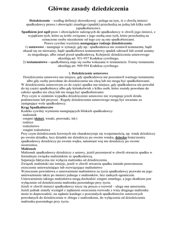 Główne zasady dziedziczenia Dziedziczenie – według definicji słownikowej - polega na tym, iż z chwilą śmierci spadkodawcy prawa i obowiązki zmarłego (spadek) przechodzą na jedną lub kilka osób (spadkobierców). Spadkiem jest ogół praw i obowiązków należących do spadkodawcy w chwili jego śmierci, z wyjątkiem tych, które są ściśle związane z jego osobą oraz tych, które przechodzą na oznaczone osoby niezależnie od tego czy są one spadkobiercami. Prawo cywilne wyróżnia następujące rodzaje dziedziczenia: 1) ustawowe - następuje w sytuacji, gdy np.: spadkodawca nie zostawił testamentu, bądź okazał się on nieważny, bądź spadkobierca testamentowy spadek odrzucił lub został uznany za niegodnego, albo zmarł przed spadkodawcą. Kolejność dziedziczenia ustawowego określają art. 931-937 Kodeksu cywilnego, 2) testamentowe - spadkobiercą staje się osoba wskazana w testamencie. Formy testamentu określają art. 949-954 Kodeksu cywilnego. I. Dziedziczenie ustawowe Dziedziczenie ustawowe ma miejsce, gdy spadkodawca nie pozostawił ważnego testamentu albo gdy osoby powołane do dziedziczenia nie chcą lub nie mogą być spadkobiercami. W dziedziczeniu ustawowym co do części spadku ma miejsce, gdy spadkodawca nie powołał do tej części spadkobiercy albo gdy którakolwiek z kilku osób, które zostały powołane do całości spadku nie chcą lub nie mogą być spadkobiercami. Przy czym w ostatnim wypadku dziedziczenie ustawowe nie występuje jeżeli działa podstawienie lub przyrost . Reguły dziedziczenia ustawowego mogą być uważane za zastępujące wole spadkodawcy. Krąg Spadkobierców Kodeks cywilny wymienia następujących bliskich spadkodawcy: · małżonek · zstępni (dzieci, wnuki, prawnuki, itd.) · rodzice · rodzeństwo · zstępni rodzeństwa Przy czym dziedziczenie krewnych nie charakteryzuje się wzajemnością, np. wnuk dziedziczy po swoim dziadku, lecz dziadek nie dziedziczy po swoim wnuku, dziecko brata/siostry spadkodawcy dziedziczy po swoim wujku, natomiast wuj nie dziedziczy po swoim siostrzeńcu. Małżonek Małżonek spadkodawcy dziedziczy z ustawy, jeżeli pozostawał w chwili otwarcia spadku w formalnym związku małżeńskim ze spadkodawcą. Separacja faktyczna nie wyłącza małżonka od dziedziczenia. Związek małżeński nie istnieje, jeżeli w chwili otwarcia spadku istniało prawomocne orzeczenie unieważniające lub rozwiązujące małżeństwo Wytoczenie powództwa o unieważnieni małżeństwa za życia spadkodawcy pozwala na jego unieważnienie także po śmierci jednego z małżonków, bez żadnych ograniczeń. Unieważnienie takiego małżeństwa mogą dochodzić zstępni zmarłego, a jego skutkiem jest wyłączenie od dziedziczenia małżonka pozostałego przy życiu. Jeżeli w chwili śmierci spadkodawcy toczy się proces o rozwód – ulega ona umorzeniu. Jeżeli jednak zmarły wystąpił z żądaniem orzeczenia rozwodu z winy drugiego małżonka może to doprowadzić, na żądanie każdego z pozostałych spadkobierców ustawowych powołanych do dziedziczenia w zbiegu z małżonkiem, do wyłączenia od dziedziczenia małżonka pozostałego przy życiu. Z żądaniem wydania takiego orzeczenia można wystąpić w terminie 6 miesięcy od dnia, w którym spadkobierca, o którym mowa powyżej, dowiedział się o otwarciu spadku, jednak nie później niż w rok od otwarcia spadku. Termin ustawowy ma charakter terminu zawitego. Zstępni, osoby przysposobione Dziecko dziedziczy po swoich rodzicach niezależnie od tego, czy pochodzi z małżeństwa, czy ze związku pozamałżeńskiego. Podobnie rodzice dziedziczą po swoim dziecku niezależnie od tego, czy w chwili otwarcia spadku pozostają ze sobą w związku małżeńskim, a nawet czy kiedykolwiek w takim związku pozostawali. Reguły dziedziczenia ustawowego między przysposobionym, a przysposabiającymi uzależnione są od tego, czy jest to przysposobienie pełne (art. 124 KRO), czy niepełne (art. 121 KRO). W pierwszym przypadku zarówno przysposobiony jak i przysposabiający dziedziczą tak jakby przysposobiony był dzieckiem przysposabiającego. W drugim przypadku reguły dziedziczenia zostały ustalone w art. 937 KC: · przysposobiony dziedziczy po przysposabiającym na równi z jego dziećmi, a zstępni przysposobionego dziedziczą po przysposabiającym na tych samych zasadach co dalsi zstępni spadkodawcy; · przysposobiony i jego zstępni nie dziedziczą po krewnych przysposabiającego, a krewni przysposabiającego nie dziedziczą po przysposobionym i jego zstępnych; · rodzice przysposobionego nie dziedziczą po przysposobionym, a zamiast nich dziedziczy po przysposobionym przysposabiający; poza tym przysposobienie nie narusza powołania do dziedziczenia wynikającego z pokrewieństwa. Kolejność dziedziczenia Spadkobiercy ustawowi zostali podzieleni na grupy dochodzące kolejno do dziedziczenia ustawowego. Przy czym spadkobiercy należące do grupy dalszej dochodzą do dziedziczenia dopiero wówczas, gdy nie ma spadkobierców należących do grupy bliższej. Wielkość udziałów poszczególnych spadkobierców określa szczegółowo Kodeks cywilny. Dzieli ona spadkobierców ustawowych na 3 grupy, do których należą: 1) małżonek i dzieci spadkodawcy, a jeżeli dziecko nie dożyło otwarcia spadku w jego miejsce wchodzą jego zstępni. 2) małżonek spadkodawcy, jego rodzice, rodzeństwo oraz zstępni rodzeństwa 3) w przypadku braku spadkobierców należących do pierwszej i drugiej grupy, do dziedziczenia z ustawy dochodzi Skarb Państwa Możliwe jest określenie udziałów w stałym ułamku lub w zależności od liczby spadkobierców dochodzących do dziedziczenia podział według głów. Jeżeli w miejsce nieżyjących krewnych spadkodawcy powołani zostają ich zstępni, określenie wielkości udziału następuje według szczepów. Polega to w pierwszej kolejności na określeniu udziału jaki przypadałby nieżyjącemu krewnemu bliższego s
