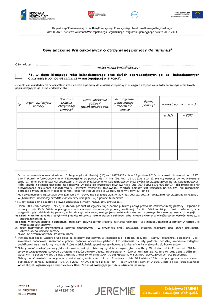 Oświadczenie Wnioskodawcy o otrzymanej pomocy de minimis1 Oświadczam, iż ......................................................................................................................................................... (pełna nazwa Wnioskodawcy) *1. w ciągu bieżącego roku kalendarzowego oraz dwóch poprzedzających go lat otrzymał/a pomoc de minimis w następującej wielkości2: kalendarzowych (wypełnić z uwzględnieniem wszystkich zaświadczeń o pomocy de minimis otrzymanych w ciągu bieżącego roku kalendarzowego oraz dwóch poprzedzających go lat kalendarzowych) Lp. Organ udzielający pomocy Podstawa prawna otrzymanej pomocy3 Dzień udzielenia pomocy4 (dzień-miesiąc-rok) Nr programu pomocowego, decyzji lub umowy Forma pomocy5 Wartość pomocy brutto6 w PLN w EUR7 1 Pomoc de minimis w rozumieniu art. 3 Rozporządzenia Komisji (UE) nr 1407/2013 z dnia 18 grudnia 2013r. w sprawie stosowania art. 107 i 108 Traktatu o funkcjonowaniu Unii Europejskiej do pomocy de minimis (Dz. Urz. UE L 352/1 z 24.12.2013r.) oznacza pomoc przyznaną temu samemu podmiotowi gospodarczemu w ciągu bieżącego roku kalendarzowego oraz dwóch poprzedzających go lat kalendarzowych, która łącznie z pomocą udzieloną na podstawie wniosku nie przekroczy równowartości 200 000 EURO (100 000 EURO - dla przedsiębiorcy prowadzącego działalność gospodarczą w sektorze transportu drogowego). Wartość pomocy jest wartością brutto, tzn. nie uwzględnia potrąceń z tytułu podatków bezpośrednich. Pułap ten stosuje się bez względu na formę pomocy i jej cel. 2 Przy uwzględnieniu wszystkich powiązanych z Wnioskodawcą przedsiębiorstw (również poprzez podział, połączenie lub przejęcie) wskazanych w „Formularzu informacji przedstawianych przy ubieganiu się o pomoc de minimis”. 3 Należy podać pełną podstawę prawną udzielenia pomocy (nazwa aktu prawnego). 4 Dzień udzielenia pomocy – dzień, w którym podmiot ubiegający się o pomoc publiczną nabył prawo do otrzymania tej pomocy – zgodnie z ustawą z dnia 30.04.2004r. o postępowaniu w sprawach dotyczących pomocy publicznej (Dz. U z 2007 Nr 59 poz. 404 z późn.zm.), a w przypadku gdy udzielenie tej pomocy w formie ulgi podatkowej następuje na podstawie aktu normatywnego, bez wymogu wydania decyzji: a) dzień, w którym zgodnie z odrębnymi przepisami upływa termin złożenia deklaracji albo innego dokumentu określającego wartość pomocy, z zastrzeżeniem ilt. b, b) dzień, w którym zgodnie z odrębnymi przepisami upływa termin złożenia zeznania rocznego – w przypadku udzielenia pomocy w formie ulgi w podatku dochodowym, c) dzień faktycznego przysporzenia korzyści finansowych – w przypadku braku obowiązku złożenia deklaracji albo innego dokumentu określającego wartość pomocy – chyba, że przepisy odrębne stanowią inaczej; 5 Pomocą jest każde wsparcie udzielone ze środków publicznych w szczególności: dotacje, pożyczki, kredyty, gwarancje, poręczenia, ulgi i zwolnienia podatkowe, zaniechanie poboru podatku, odroczenie płatności lub rozłożenie na raty płatności podatku, umorzenie zaległości podatkowej oraz inne formy wsparcia, które w jakikolwiek sposób uprzywilejowują ich beneficjenta w stosunku do konkurentów. 6 Należy podać wartość pomocy jako ekwiwalent dotacji, obliczony zgodnie z rozporządzeniem Rady Ministrów z dnia 11 sierpnia 2004r. w sprawie szczegółowego sposobu obliczania wartości pomocy publicznej udzielanej w różnych formach (Dz. U. Nr 194, poz. 1983 z późn.zm.), wydanym na podstawie art. 11 ust. 2 ustawy z dnia 30 kwietnia 2004r. o postępowaniu w sprawach dotyczących pomocy publicznej. 7 Należy podać wartość pomocy w euro ustaloną zgodnie z art. 11 ust. 3 ustawy z dnia 30 kwietnia 2004r. o postępowaniu w sprawach dotyczących pomocy publicznej (Dz. U. z 2007, Nr 59, poz.404 z późn. zm.) - równowartość pomocy w euro ustala się wg kursu średniego walut obcych, ogłaszanego przez Narodowy Bank Polski, obowiązującego w dniu udzielenia pomocy. Lp. Organ udzielający pomocy Podstawa prawna otrzymanej pomocy3 Dzień udzielenia pomocy4 (dzień-miesiąc-rok) Nr programu pomocowego, decyzji lub umowy Forma pomocy5 Wartość pomocy brutto6 Razem pomoc de minimis *2. w ciągu bieżącego roku kalendarzowego oraz dwóch poprzedzających go lat kalendarzowych nie otrzymał/a8 pomocy de minimis. UWAGA: Zgodnie z art. 44 ust. 1 ustawy z dnia 30 kwietnia 2004r. o postępowaniu w sprawach dotyczących pomocy publicznej (Dz. U. z 2007, Nr 59, poz.404 z późn. zm.) w przypadku nieprzekazania lub przekazania nieprawdziwych informacji o pomocy publicznej, o których mowa w art. 39, Prezes Urzędu Ochrony Konkurencji i Konsumentów może w drodze decyzji nałożyć na beneficjenta pomocy karę pieniężną do wysokości równowartości 10 000 euro. 3. Na Wnioskodawcy ciąży / nie ciąży** obowiązek zwrotu pomocy, wynikający z decyzji Komisji Europejskiej uznającej pomoc za niezgodną z prawem oraz ze wspólnym rynkiem. 4. Wnioskodawca jest / nie jest** przedsiębiorcą znajdującym się w trudnej sytuacji w rozumieniu pkt. 20 Komunikatu Komisji Wytyczne dotyczące pomocy państwa na ratowanie i restrukturyzację przedsiębiorstw niefinansowych znajdujących się w trudnej sytuacji (Dz. Urz. UE C 249 z 31.07.2014 r.). 5. Wnioskodawca jest / nie jest** wykluczony, stosownie do Rozporządzenia Komisji (UE) nr 1407/2013 z dnia 18 grudnia 2013r. w sprawie stosowania art. 107 i 108 Traktatu o funkcjonowaniu Unii Europejskiej do pomocy de minimis (Dz. Urz. UE L 352/1 z 24.12.2013r.) ........................................................... (podpisy osób upoważnionych do reprezentowania Wnioskodawcy i pieczęć) .......................................... (data i miejscowość) * zakreślić odpowiednie ** niepotrzebne skreślić 8 Przy uwzględnieniu wszystkich powiązanych z Wnioskodawcą przedsiębiorstw (również poprzez podział, połączen
