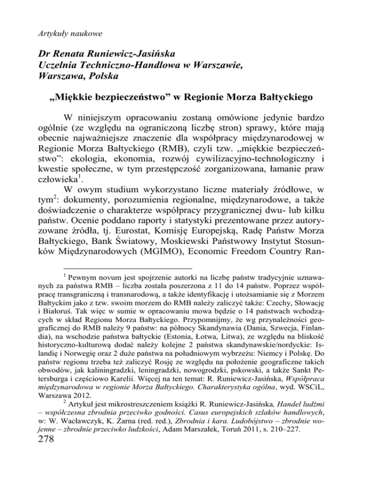 Artykuły naukowe Dr Renata Runiewicz-Jasińska Uczelnia Techniczno-Handlowa w Warszawie, Warszawa, Polska „Miękkie bezpieczeństwo” w Regionie Morza Bałtyckiego W niniejszym opracowaniu zostaną omówione jedynie bardzo ogólnie (ze względu na ograniczoną liczbę stron) sprawy, które mają obecnie najważniejsze znaczenie dla współpracy międzynarodowej w Regionie Morza Bałtyckiego (RMB), czyli tzw. „miękkie bezpieczeństwo”: ekologia, ekonomia, rozwój cywilizacyjno-technologiczny i kwestie społeczne, w tym przestępczość zorganizowana, łamanie praw człowieka1. W owym studium wykorzystano liczne materiały źródłowe, w tym2: dokumenty, porozumienia regionalne, międzynarodowe, a także doświadczenie o charakterze współpracy przygranicznej dwu- lub kilku państw. Ocenie poddano raporty i statystyki prezentowane przez autoryzowane źródła, tj. Eurostat, Komisję Europejską, Radę Państw Morza Bałtyckiego, Bank Światowy, Moskiewski Państwowy Instytut Stosunków Międzynarodowych (MGIMO), Economic Freedom Country Ran1 Pewnym novum jest spojrzenie autorki na liczbę państw tradycyjnie uznawanych za państwa RMB – liczba została poszerzona z 11 do 14 państw. Poprzez współpracę transgraniczną i transnarodową, a także identyfikację i utożsamianie się z Morzem Bałtyckim jako z tzw. swoim morzem do RMB należy zaliczyć także: Czechy, Słowację i Białoruś. Tak więc w sumie w opracowaniu mowa będzie o 14 państwach wchodzących w skład Regionu Morza Bałtyckiego. Przypomnijmy, że wg przynależności geograficznej do RMB należy 9 państw: na północy Skandynawia (Dania, Szwecja, Finlandia), na wschodzie państwa bałtyckie (Estonia, Łotwa, Litwa), ze względu na bliskość historyczno-kulturową dodać należy kolejne 2 państwa skandynawskie/nordyckie: Islandię i Norwegię oraz 2 duże państwa na południowym wybrzeżu: Niemcy i Polskę. Do państw regionu trzeba też zaliczyć Rosję ze względu na położenie geograficzne takich obwodów, jak kaliningradzki, leningradzki, nowogrodzki, pskowski, a także Sankt Petersburga i częściowo Karelii. Więcej na ten temat: R. Runiewicz-Jasińska, Współpraca międzynarodowa w regionie Morza Bałtyckiego. Charakterystyka ogólna, wyd. WSCiL, Warszawa 2012. 2 Artykuł jest mikrostreszczeniem książki R. Runiewicz-Jasińska, Handel ludźmi – współczesna zbrodnia przeciwko godności. Casus europejskich szlaków handlowych, w: W. Wacławczyk, K. Żarna (red. red.), Zbrodnia i kara. Ludobójstwo – zbrodnie wojenne – zbrodnie przeciwko ludzkości, Adam Marszałek, Toruń 2011, s. 210–227. 278 Rocznik Stowarzyszenia Naukowców Polaków Litwy, 2014, T. 13/14 kings opublikowany przez Wall Street Journal i Heritage Foundation oraz Amnesty International. Przedstawiono opinie z monografii naukowych i prac zbiorowych takich znawców tematu, jak: E. Tejchmann, A. B. Kisiel-Łowczyc, T. Palmowski i inni. Zdaniem Adama Rotfelda do „miękkiego bezpieczeństwa” należy human security, czyli bezpieczeństwo ludzkie, w tym ekonomiczne, energetyczne, ekologiczne i kulturowo-cywilizacyjne3. Podobnie jak w przypadku wielu innych koncepcji naukowo-badawczych, koncepcja „miękkiego bezpieczeństwa” powinna być rozpatrywana wielowymiarowo. Należy podkreślić, że ugrupowania subregionalne (tj. Rada Państw Morza Bałtyckiego, Rada Bałtycka, Rada Nordycka) działające w RMB podejmowały wiele inicjatyw służących „miękkiemu bezpieczeństwu”, jak wymiana informacji w sprawach bieżących i prowadzenie konsultacji politycznych, współpraca sektorowa na rzecz owego bezpieczeństwa czy promowanie wspólnych przedsięwzięć oraz działań zmierzających do szerzenia struktur „miękkiego bezpieczeństwa4. Ekologia. Od kilku lat w większości państw RMB powołane są ministerstwa środowiska i zasobów naturalnych zajmujące się prowadzeniem polityki środowiskowej państwa. Ponadto istnieją rządowe agencje ochrony środowiska i kompetentne laboratoria badawcze odpowiedzialne za kontrolę i monitorowanie stanu środowiska. W parlamentach utworzone są komisje do spraw środowiska, które prowadzą własną politykę. Pomimo obecności podstawowych struktur kraje te różnią się znacznie sposobem organizowania działań na rzecz środowiska. Kraje w regionie Bałtyku mają opracowane mniej lub bardziej szczegółowe programy dotyczące poprawy stanu środowiska, które jednak w dużym stopniu uzależnione są od programów politycznych oraz prawodawstwa w dziedzinie ochrony środowiska. Kwestia współpracy międzynarodowej jest niemal zawsze włączana w krajowe wysiłki na rzecz lepszego środowiska. W zachodnich częściach regionu programy ochrony środowiska mają dłuższą tradycję i są one realizowane już od lat 60. XX stulecia. Programy dotyczące np. zanieczyszczenia powietrza i gospodarki 3 A. Rotfeld, Polska polityka zagraniczna: nowe wyzwania – nowe zadania, s. 7, <www.ksap.gov.pl/ksap/file/wystapienia/20080903_Rotfeld.pdf> [06.06.2012]. 4 R. Zięba, Rola ugrupowań subregionalnych w nowym systemie bezpieczeństwa europejskiego, Studia Europejskie, UW, Warszawa 2000, nr 1, s. 51. 279 Artykuły naukowe ściekami wdrażane są już od wielu lat. W Europie Wschodniej nowe programy i agencje dopiero powstają5. Jak wynika z opinii Komisji Europejskiej6, w najbliższych latach w dziedzinie bezpieczeństwa ekologicznego i ochrony środowiska w RMB będą zachodzić zmiany. Ruch morski prawdopodobnie wzrośnie, zwiększając ryzyko wypadków7 i narażając środowisko na zanieczyszczenie. Obserwuje się również rosnącą tendencję w transporcie ciekłego gazu ziemnego. Takie działania wiążą się z zagrożeniami dla środowiska naturalnego, zwłaszcza w trudnych warunkach zimowych. Niezbędne są więc dalsze działania na rzecz ulepszenia współpracy, koordynacji i spójności między organami odpowiedzialnymi za bezpieczeństwo i nadzór na morzu oraz w zakresie re