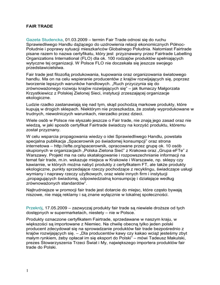 FAIR TRADE Gazeta Studencka, 01.03.2009 – termin Fair Trade odnosi się do ruchu Sprawiedliwego Handlu dążącego do uzdrowienia relacji ekonomicznych PółnocPołudnie i poprawy sytuacji mieszkańców Globalnego Południa. Natomiast Fairtrade pisane razem to nazwa certyfikatu, który jest przyznawany przez Fairtrade Labelling Organizations International (FLO) dla ok. 100 rodzajów produktów spełniających wytyczne tej organizacji. W Polsce FLO nie doczekała się jeszcze swojego przedstawicielstwa. Fair trade jest filozofią produkowania, kupowania oraz organizowania światowego handlu. Ma on na celu wspieranie producentów z krajów rozwijających się, poprzez tworzenie lepszych warunków handlowych. „Ruch przyczynia się do zrównoważonego rozwoju krajów rozwijających się” – jak tłumaczy Małgorzata Krzystkiewicz z Polskiej Zielonej Sieci, instytucji zrzeszającej organizacje ekologiczne. Ludzie rzadko zastanawiają się nad tym, skąd pochodzą markowe produkty, które kupują w drogich sklepach. Niektórym nie przeszkadza, że zostały wyprodukowane w trudnych, niewolniczych warunkach, nierzadko przez dzieci. Wiele osób w Polsce nie słyszało jeszcze o Fair trade, nie znają jego zasad oraz nie wiedzą, w jaki sposób certyfikat Fairtrade świadczy na korzyść produktu, któremu został przyznany. W celu wsparcia propagowania wiedzy o idei Sprawiedliwego Handlu, powstała specjalna publikacja „Spacerownik po świadomej konsumpcji” oraz strona internetowa – http://efte.org/spacerownik, opracowane przez grupę ok. 10 osób skupionych w organizacjach „Polska Zielona Sieć” z Krakowa oraz „Grupa eFTe” z Warszawy. Projekt ma na celu skatalogowanie i rozpowszechnianie informacji na temat fair trade, m.in. wskazuje miejsca w Krakowie i Warszawie, np. sklepy czy kawiarnie, w których można nabyć produkty z certyfikatem FT, ale także produkty ekologiczne, punkty sprzedające rzeczy pochodzące z recyklingu, świadczące usługi wymiany i naprawy rzeczy użytkowych, oraz wiele innych firm i instytucji „propagujących świadomą, odpowiedzialną konsumpcję i działające według zrównoważonych standardów”. Najtrudniejsze w promocji fair trade jest dotarcie do miejsc, które często bywają niszowe, nie mają reklamy i są znane wyłącznie w lokalnej społeczności. Przekrój, 17.05.2009 – zazwyczaj produkty fair trade są niewiele droższe od tych dostępnych w supermarketach, niestety – nie w Polsce. Produkty oznaczone certyfikatem Fairtrade, sprzedawane w naszym kraju, w większości są importowane z Niemiec. Na chwilę obecną tylko jeden polski producent zdecydował się na sprowadzanie produktów fair trade bezpośrednio z krajów rozwijających się. – „Dla producentów kawy czy kakao wciąż jesteśmy zbyt małym rynkiem, żeby opłacał im się eksport do Polski” – mówi Tadeusz Makulski, prezes Stowarzyszenia Trzeci Świat i My, największego importera produktów fair trade do Polski. 1 Na sprawiedliwe zakupy Niemcy wydają 1,1 mld zł rocznie w ok. 30 tys. punktów sprzedaży. W Polsce takich miejsc jest zaledwie ok. 150. Przedstawiciele ruchu fair trade liczą, że „sprawiedliwy handel” może się spopularyzować w Polsce po wejściu do strefy Euro. Uważają, że ceny produktów fair trade mogą spaść dopiero wtedy, gdy polski rynek zacznie być opłacalny dla eksporterów z krajów rozwijających się. Rynek nie zacznie być jednak opłacalny, dopóki nie zaczniemy masowo kupować towarów sprawiedliwego handlu. Bankier.pl, 08.05.2009 – Sprawiedliwy Handel to system, który monitoruje produkty na każdym etapie – od producenta poprzez eksporterów, importerów i przetwórców, aż do końcowego produktu. Co prawda produkty oznaczone czarno-niebiesko-żółtym znakiem fair trade są nieco droższe od innych, ale zazwyczaj odznaczają się wyższą jakością. Wspierają pomoc dla krajów Południa, a jednocześnie pozwalają konsumentom na świadomy wybór. Koalicja Sprawiedliwego Handlu promująca w Polsce zasady Fair Trade zwraca uwagę na problem sprawiedliwej zapłaty dla producentów z Trzeciego Świata (np. Etopijczyk pracujący na plantacji kawy dostaje za 1 kg ziaren równowartość 1,20 zł – gdy w Polsce z takiej ilości kawy można zaparzyć ok. 80 filiżanek kawy i sprzedać w kawiarni za kwotę ok. 500 zł). Dzięki fair trade producenci z krajów Południa otrzymują stabilną cenę pokrywającą koszty produkcji oraz premię wypłacaną jako dodatek do ustalanej ceny, którą organizacje producentów przeznaczają na wybrane cele; na ogół jest to edukacja, ochrona zdrowia czy usprawnienie procesu produkcji. By uzyskać certyfikat Fairtrade, producenci mają obowiązek zapewnić swoim robotnikom dobre warunki pracy. Nie wolno im również zatrudniać dzieci oraz nadużywać pestycydów, a także przeszkadzać w działalności związków zawodowych. W zamian często są wspierani zapłatą z góry za swoje produkty w wysokości do 60%, co jest dla nich bardzo ważne, gdyż zazwyczaj mają problemy z uzyskaniem kredytów na prowadzenie działalności. Gazeta Wrocław, 10.05.2009 – 9 i 10 maja obchodziliśmy Światowy Dzień Sprawiedliwego Handlu (World Fair Trade Day). Z tej okazji odbyły się spotkania, koncerty, pokazy filmów oraz degustacje, których celem było przybliżenie wszystkim idei fair trade. Fair trade to zorganizowany ruch, mający za zadanie poprawienie jakości życia ludności zamieszkujących kraje rozwijające się. Produkty oznakowane certyfikatem FT są gwarancją wysokiej jakości; certyfikat świadczy o tym, że ludzie, którzy pracowali przy ich produkcji, byli uczciwie traktowani i wynagrodzeni. Więcej na stronie: www.fairtrade.org.pl. Gazeta Kraków, 10.05.2009 – „Uderz w bęben dla sprawiedliwego handlu” – pod takim hasłem obchodzono tegoroczny Światowy Dzień Sprawiedliwego Handlu. Od 2001 roku corocznie obchodzi się go w 70 krajach na świecie, a w Pols